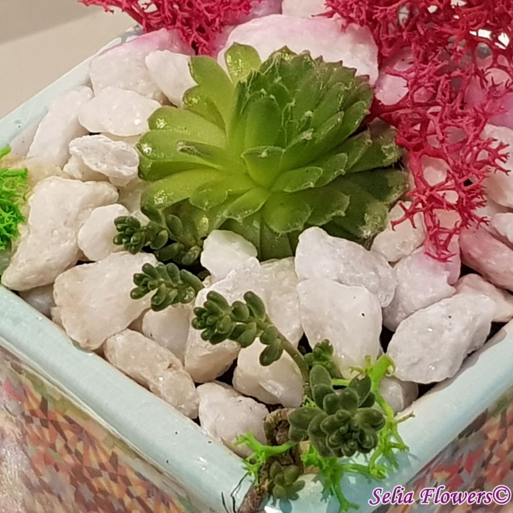 Martisor floral cu plante suculente, licheni stabilizati, accesorii, pietricele din marmura decorativa. Este construit in vas ceramic cu model, tip cub (inaltimea vasului 8 cm).