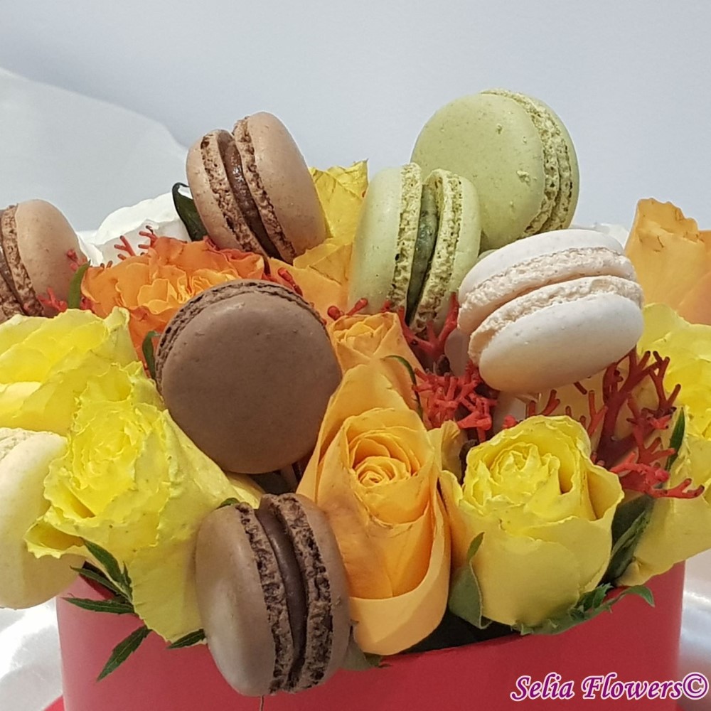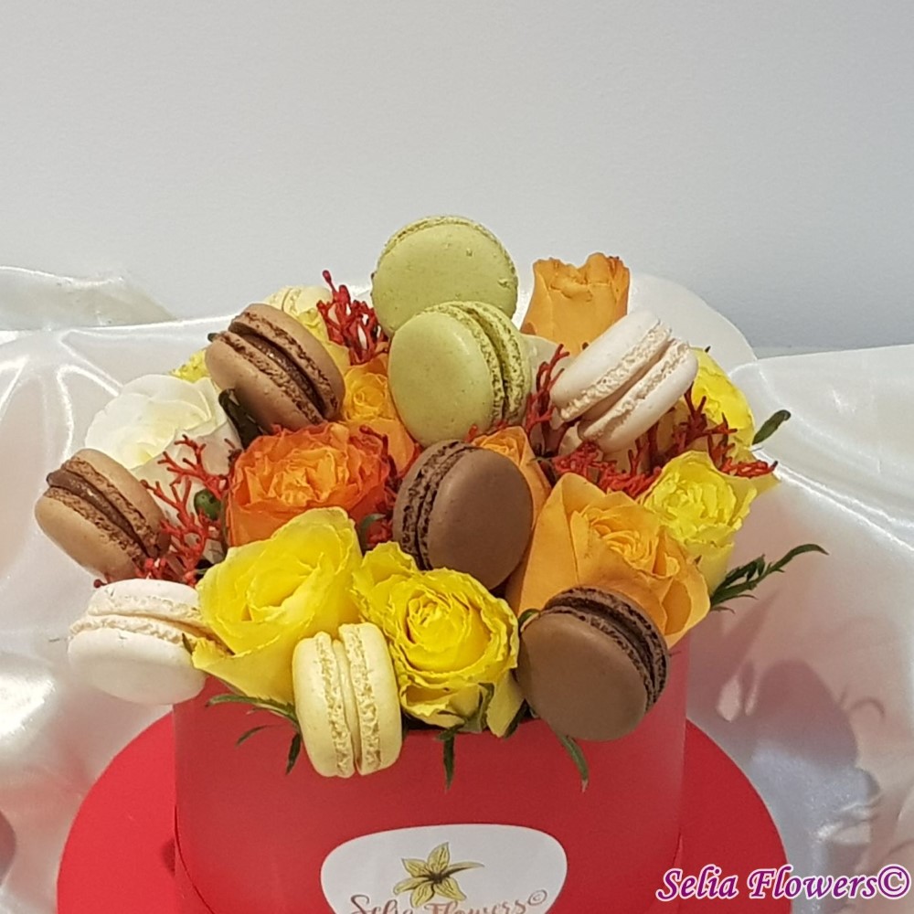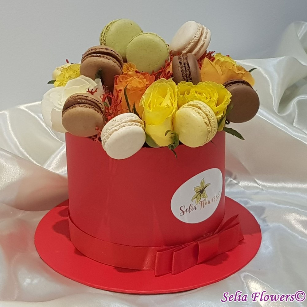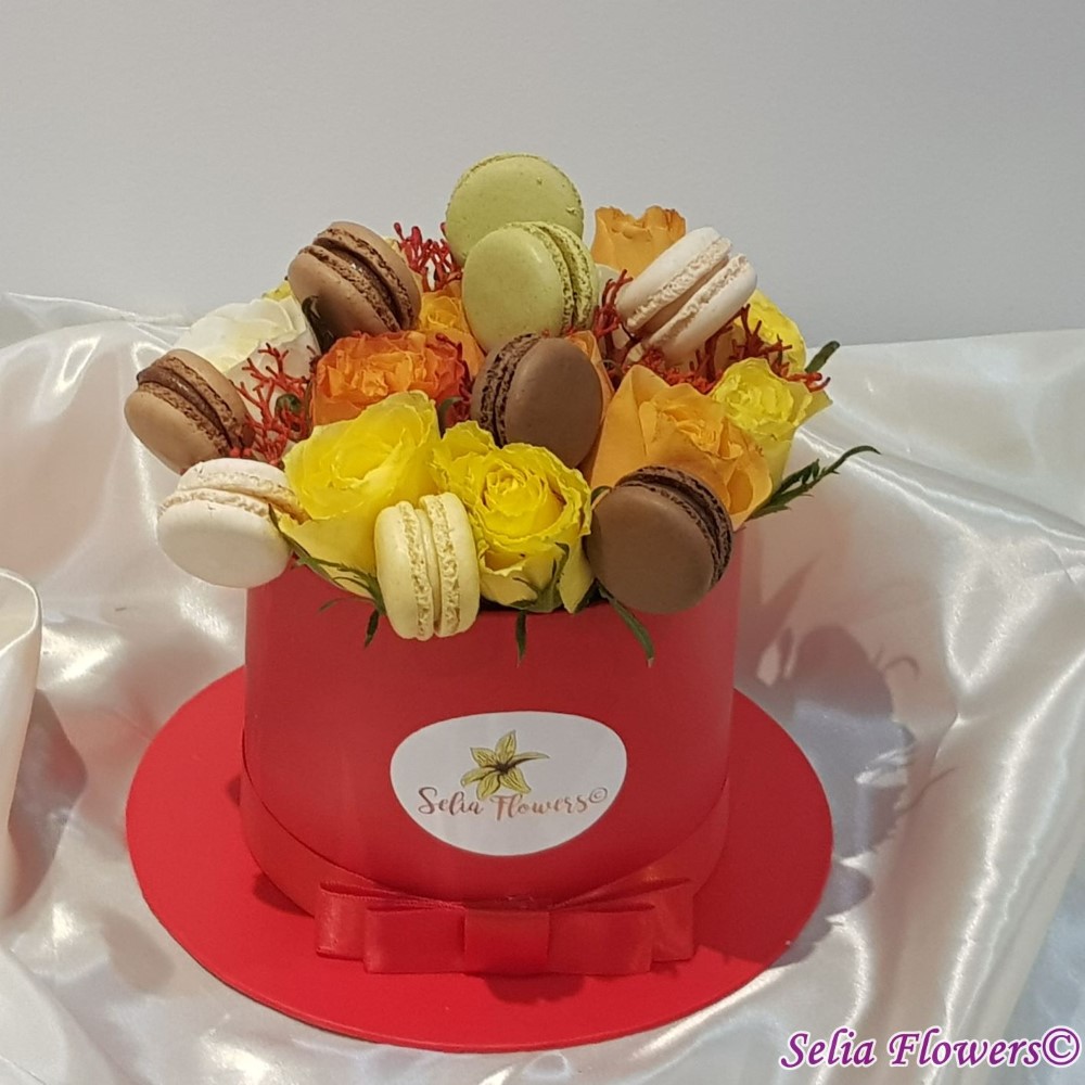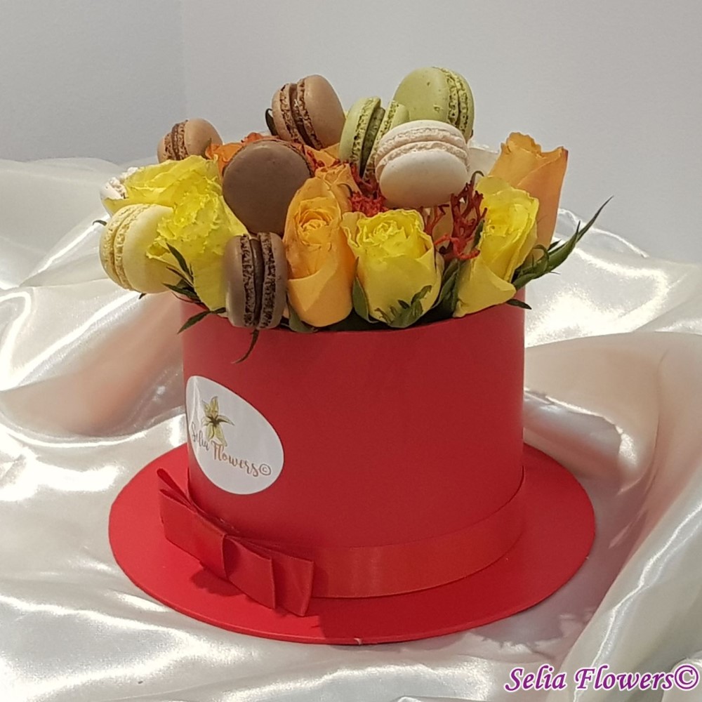 Un aranjament delicios, construit intr-o cutie tip joben, dintr-un mix de trandafiri in doua culori si o selectie de macarons.