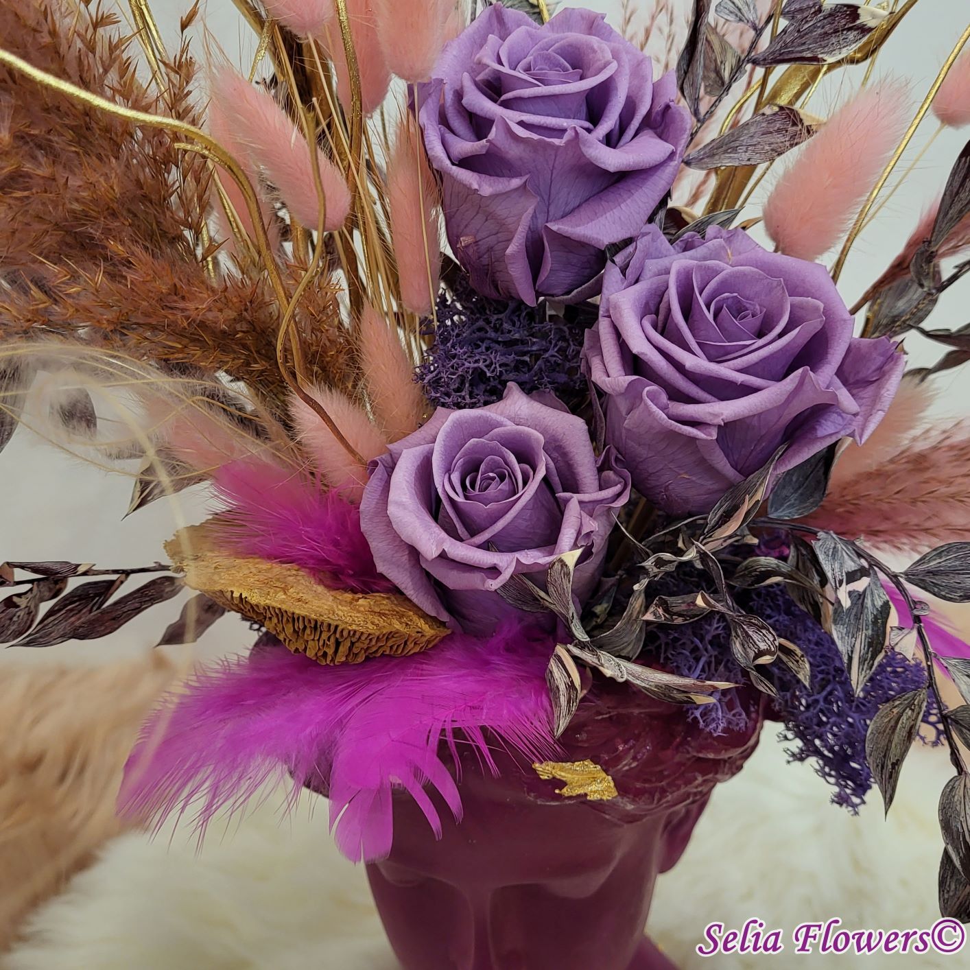 Un aranjament permanent, în tonuri de mov și roz pal, construit în vas Venus, cu trandafiri criogenați și flori naturale stabilizate și/sau uscate. Un aranjament rezistent în timp.