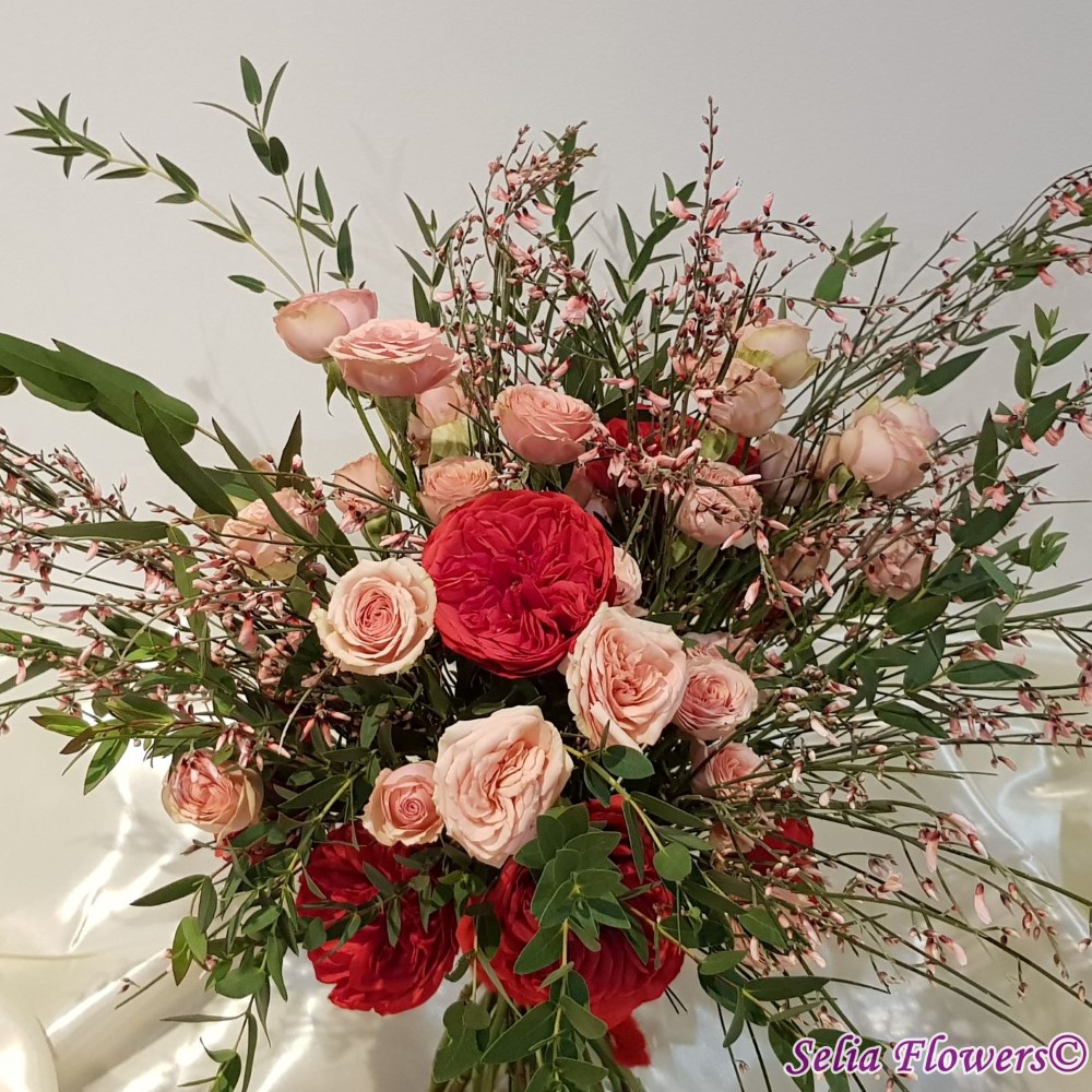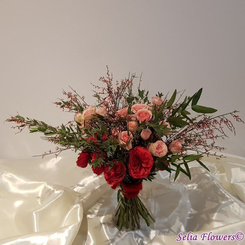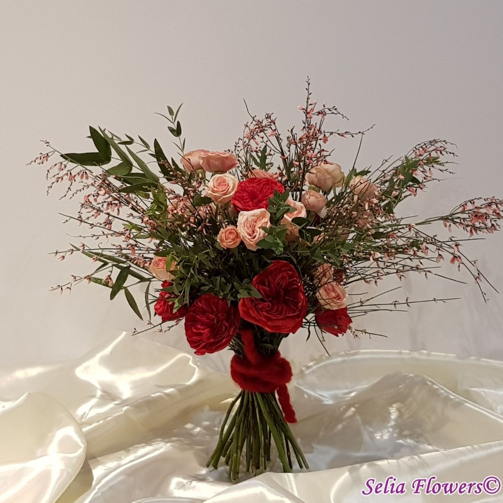 Buchet din trandafiri red piano, trandafiri tros, ginster, verdeata si accesorii.