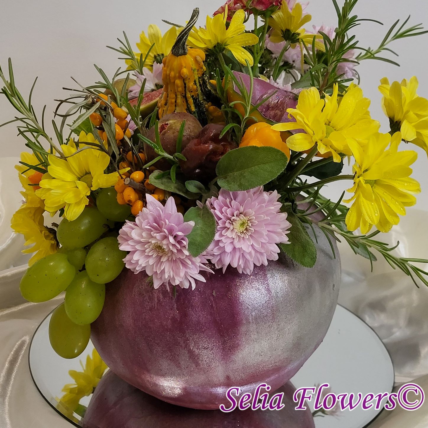 Dovleacul este vopsit și are culoarea mov combinată cu argintiu.