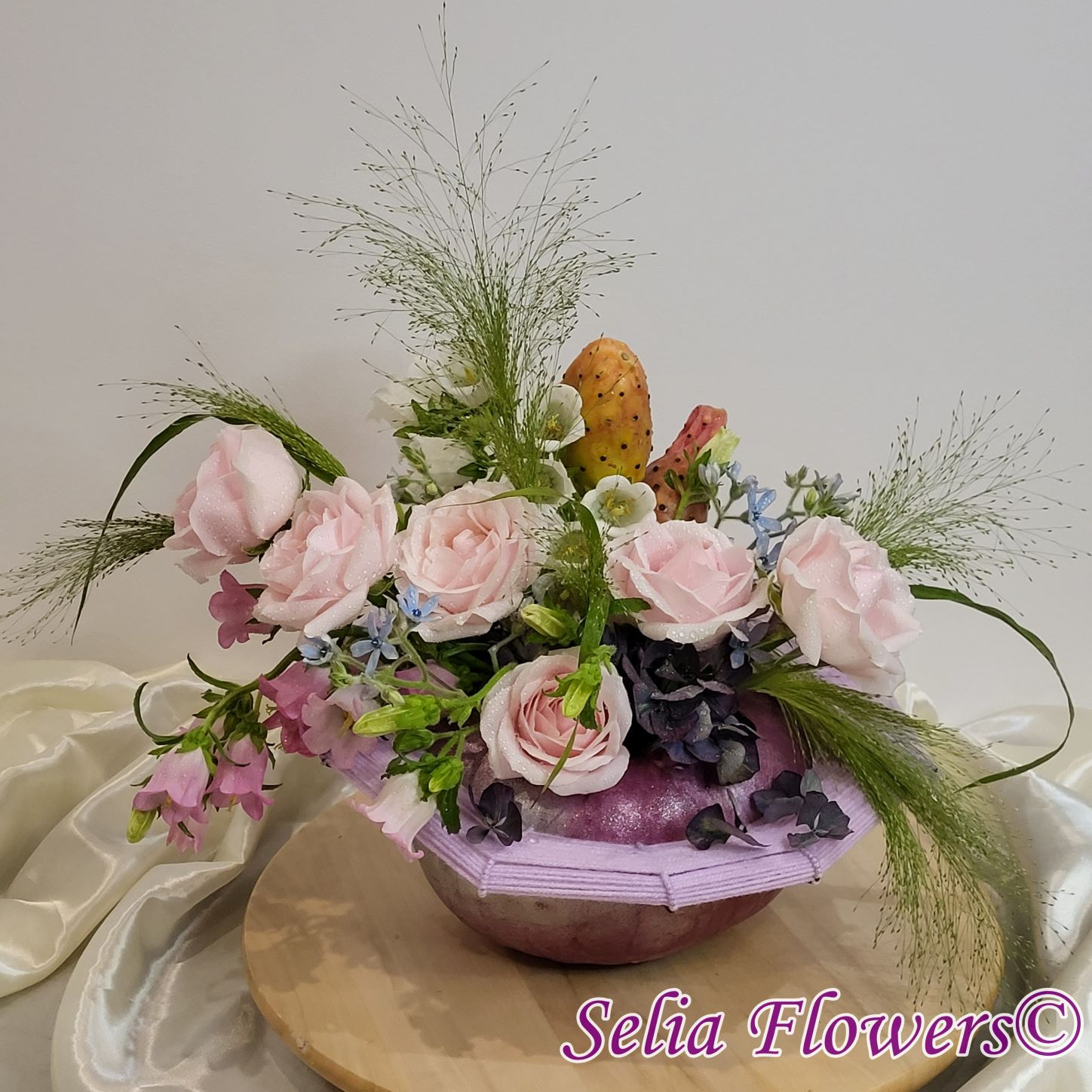 O frantura de toamnă într-un dovleac decorat cu flori naturale și fructe de cactus, pe o structura spider construită.