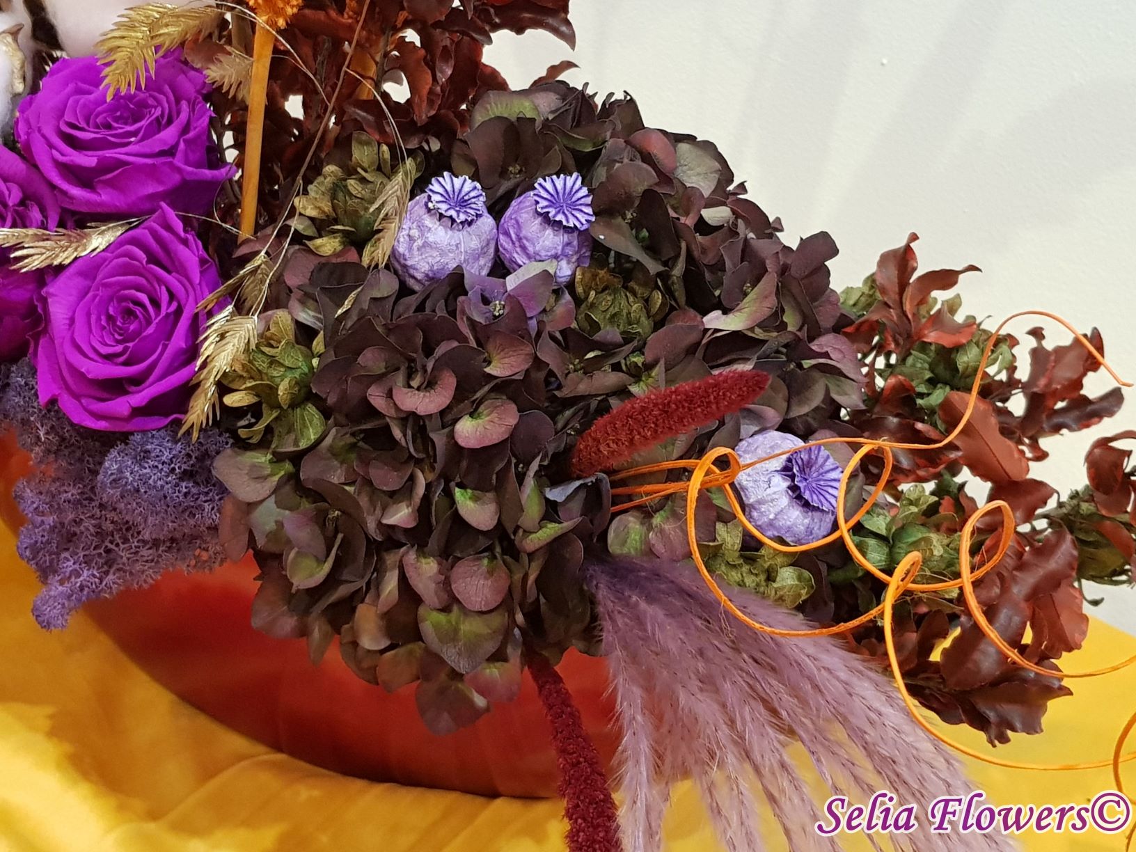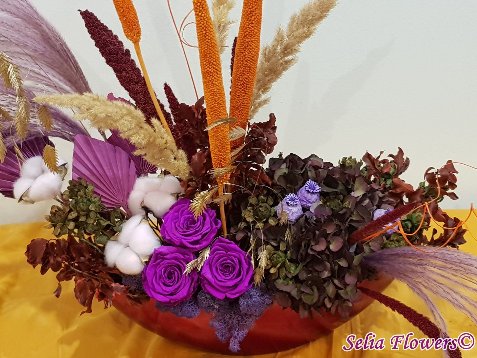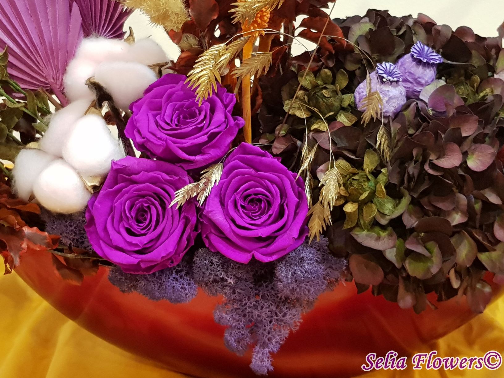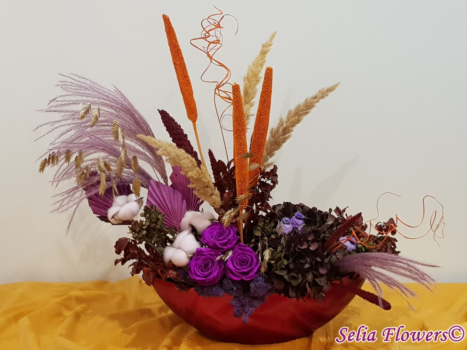 Aranjament floral realizat in vas tip barcuta , construit cu hydrangea naturala, trandafiri criogenati si flori naturale conservate.