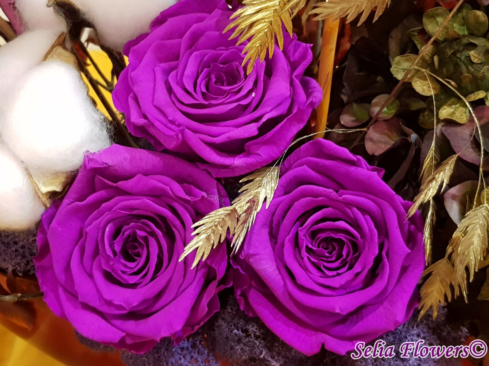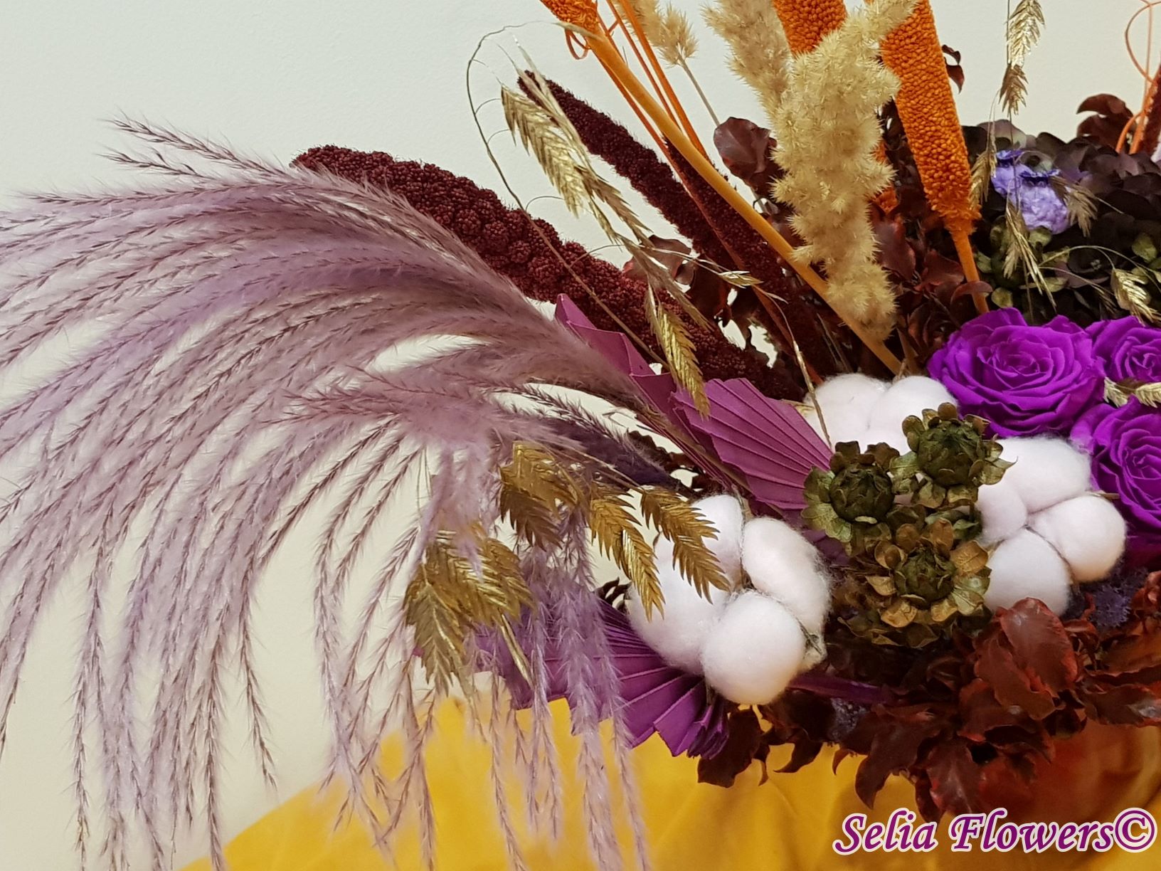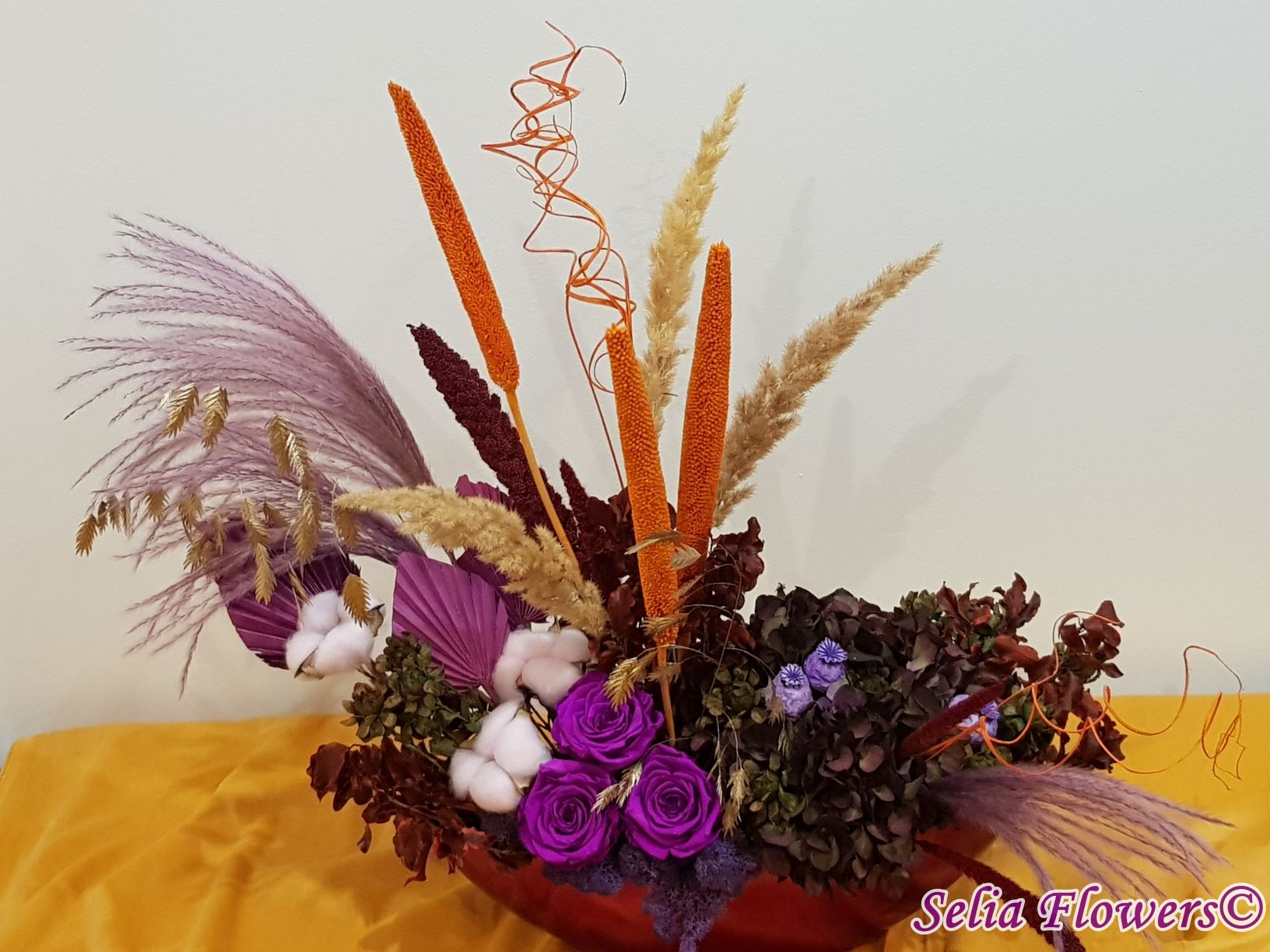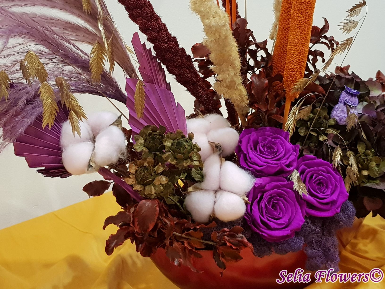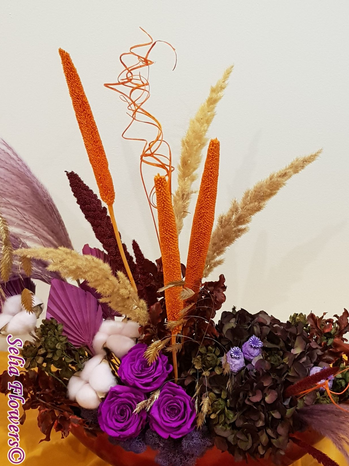 Aranjament floral realizat in vas tip barcuta , construit cu hydrangea naturala, trandafiri criogenati si flori naturale conservate.