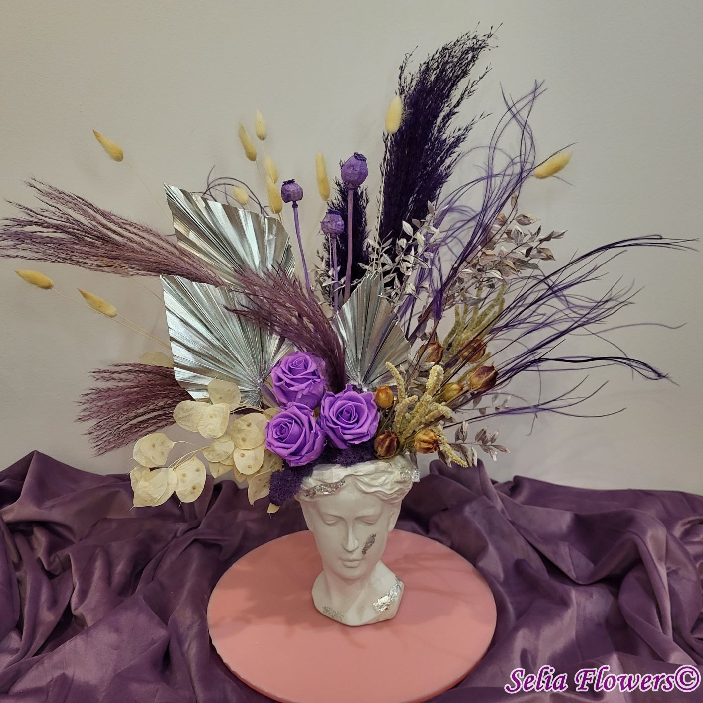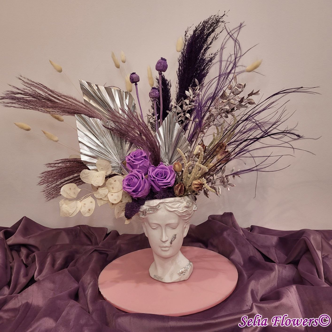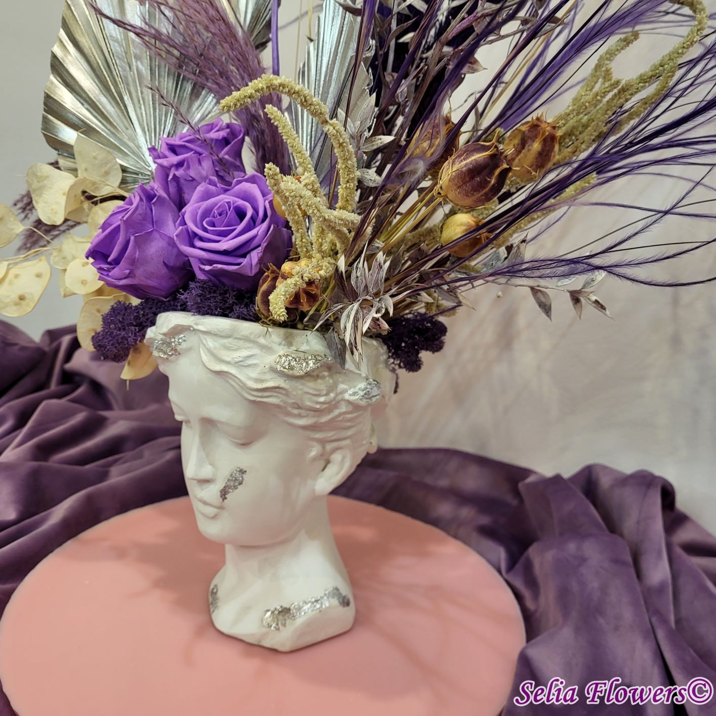 Un aranjament permanent chic, în tonuri de mov, argintiu și crem, construit în vas Venus. Un aranjament care trece cu ușurință proba timpului.