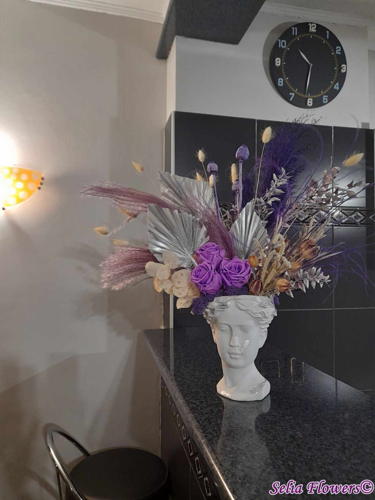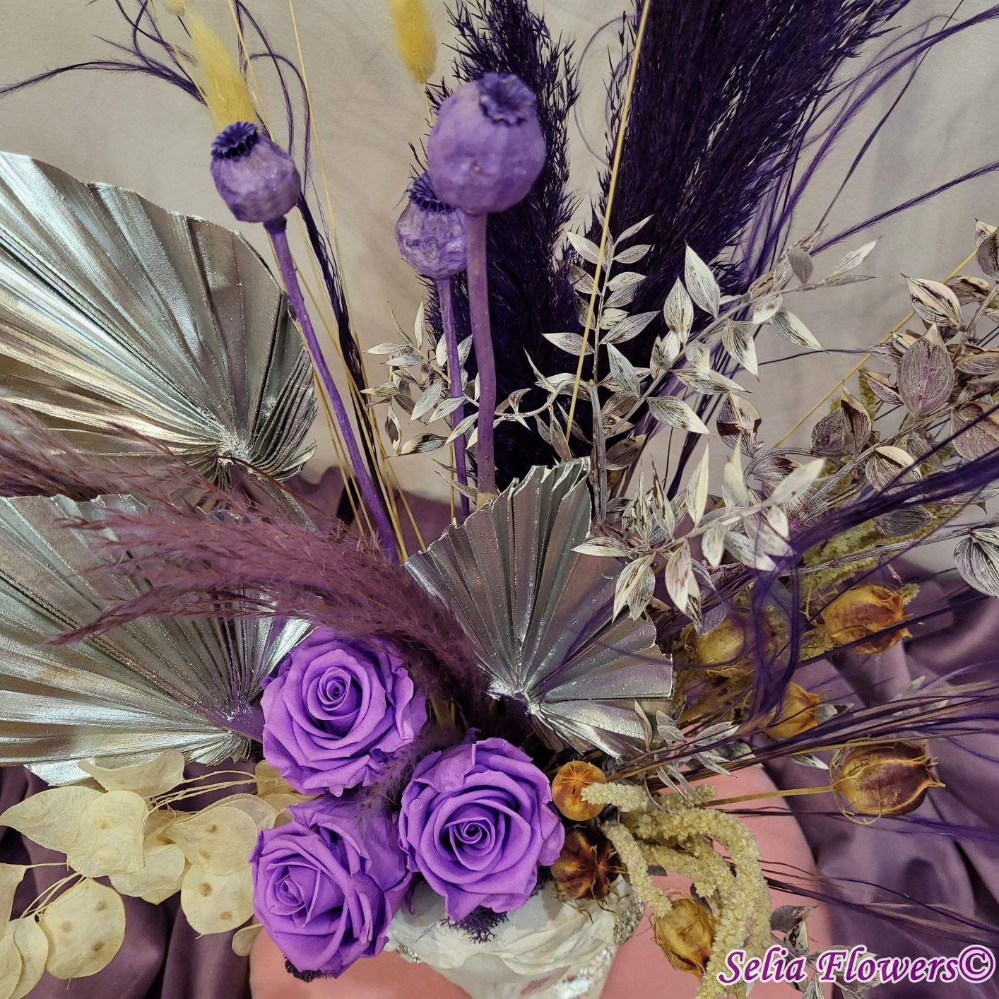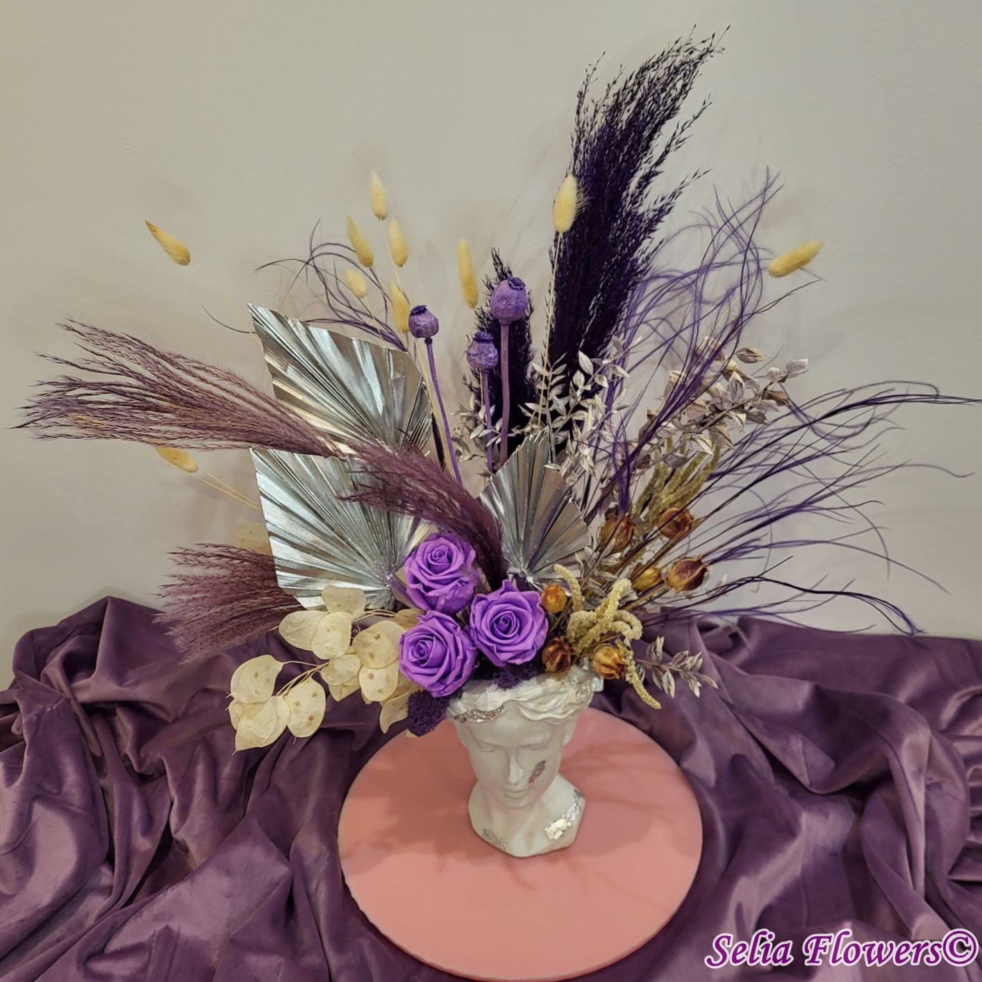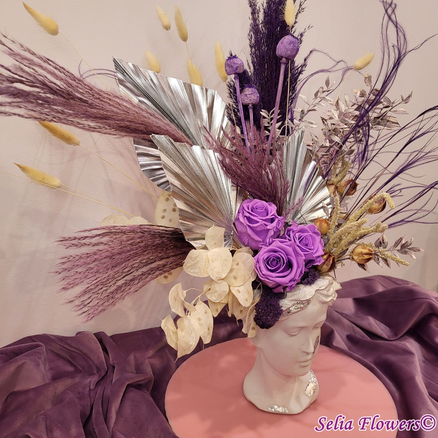 Un aranjament permanent chic, în tonuri de mov, argintiu și crem, construit în vas Venus. Un aranjament care trece cu ușurință proba timpului.