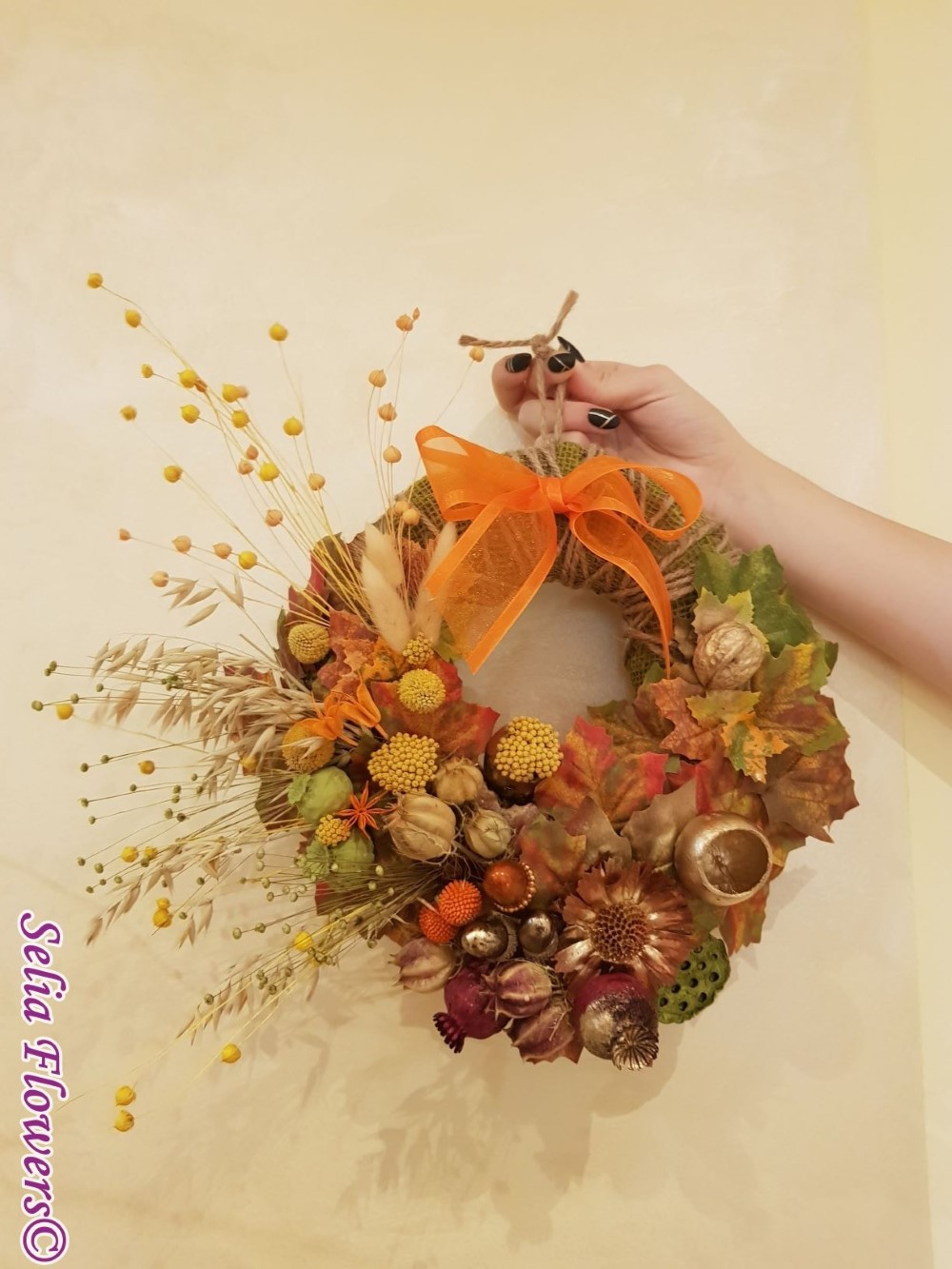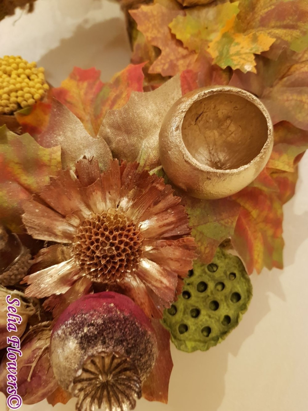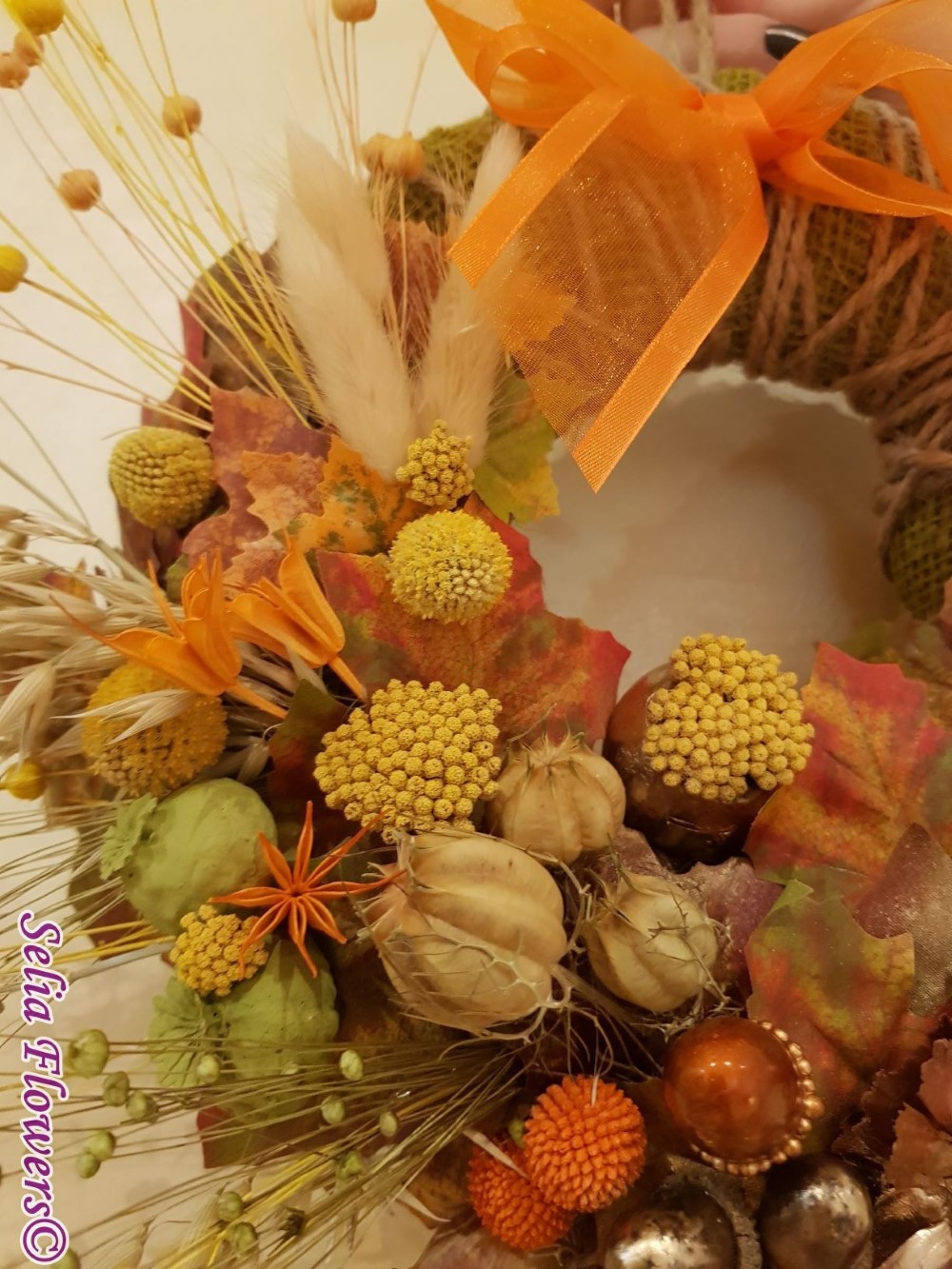 Coronita construita pe o baza hande made, din flori uscate si stabilizate: frunze aramii, verzi si burgundy, floare de protea, floare de lotus, ghinde, nuci, achillea, craspedia, flori de nigella, papaver capsule, in si orz.