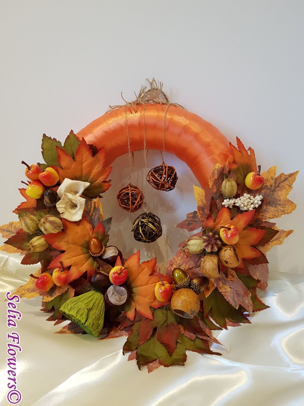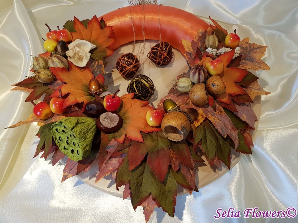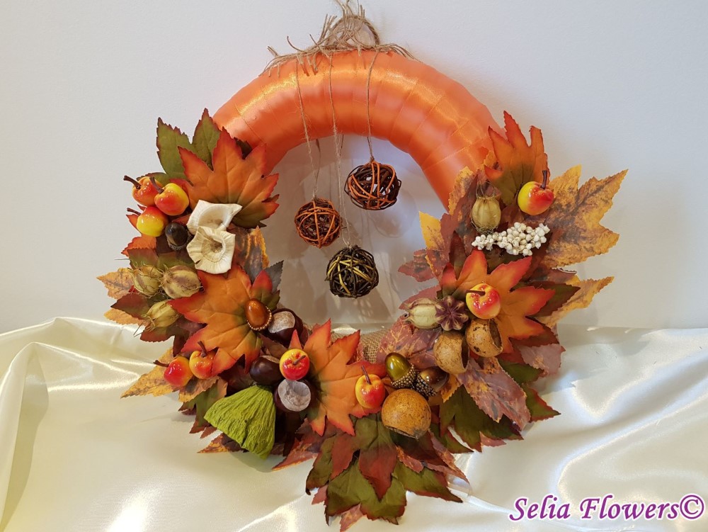 Coronita inspirata din cromatica toamnei, construita pe o baza de polistiren imbracata in panglica de saten.