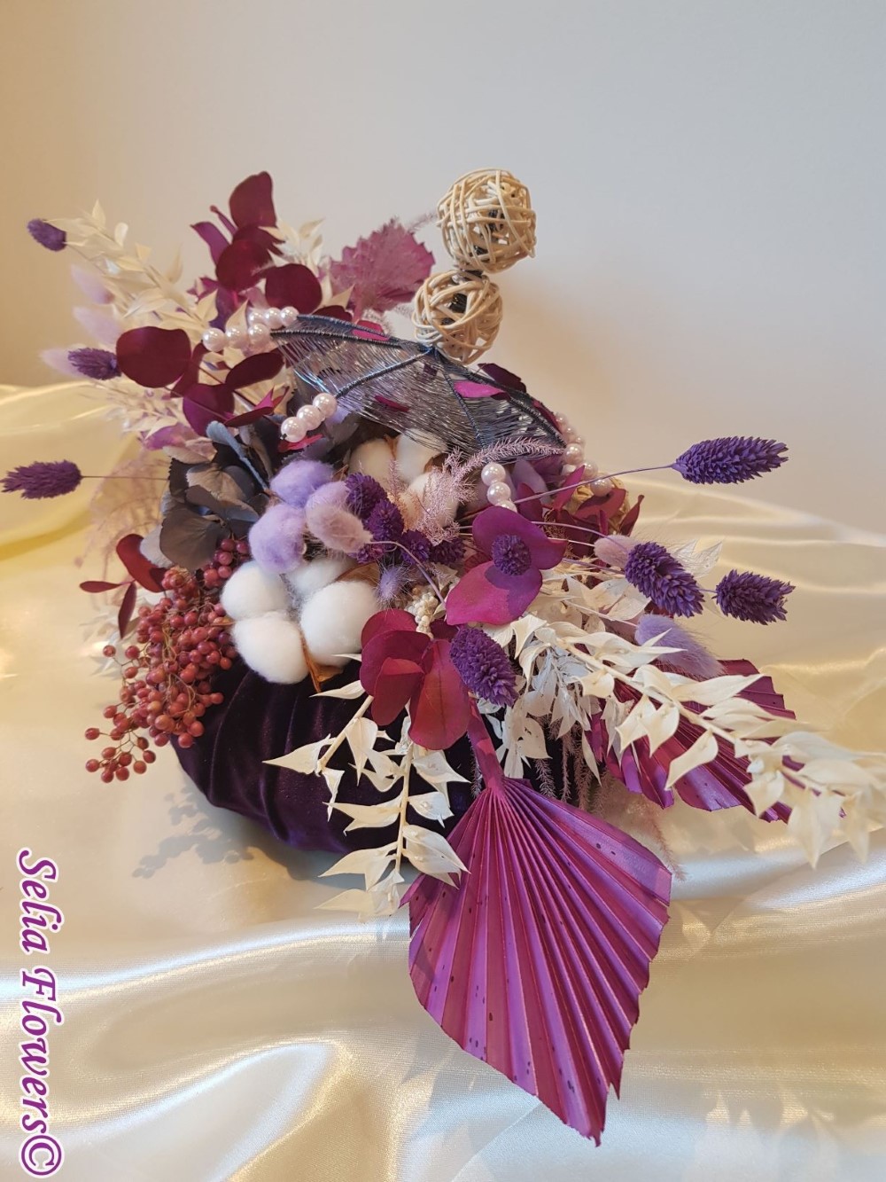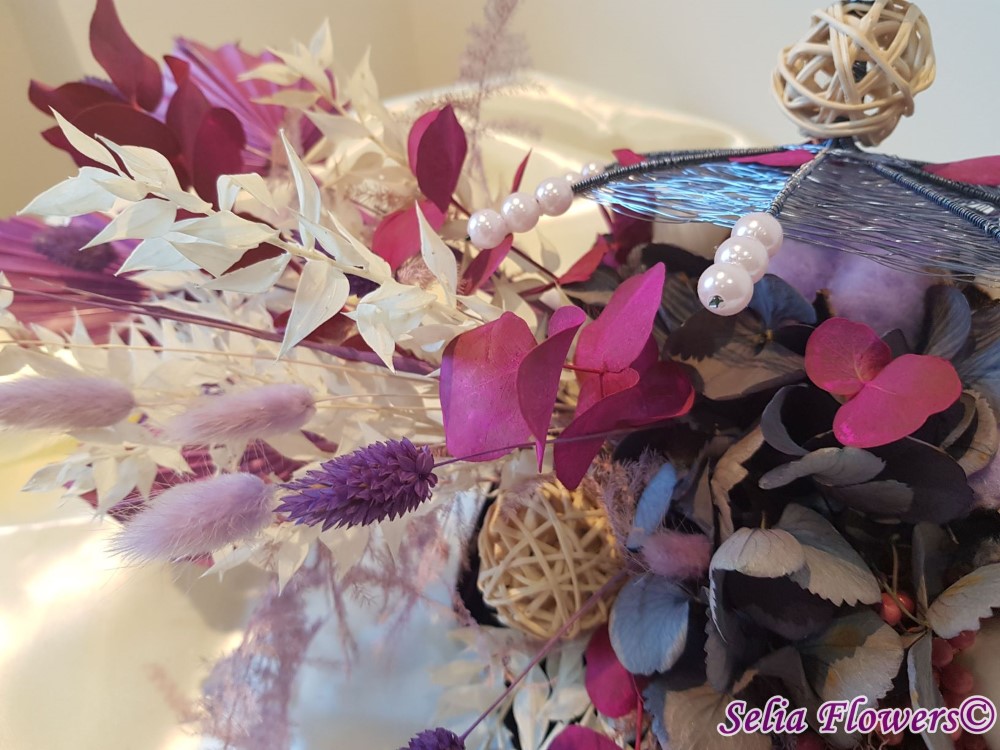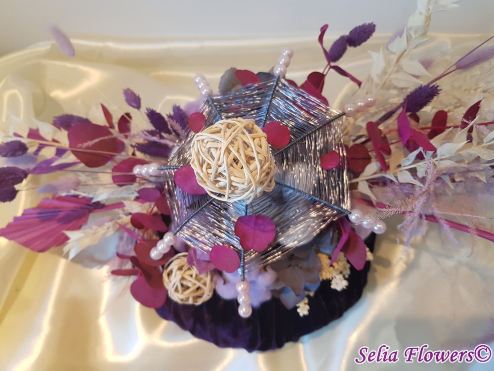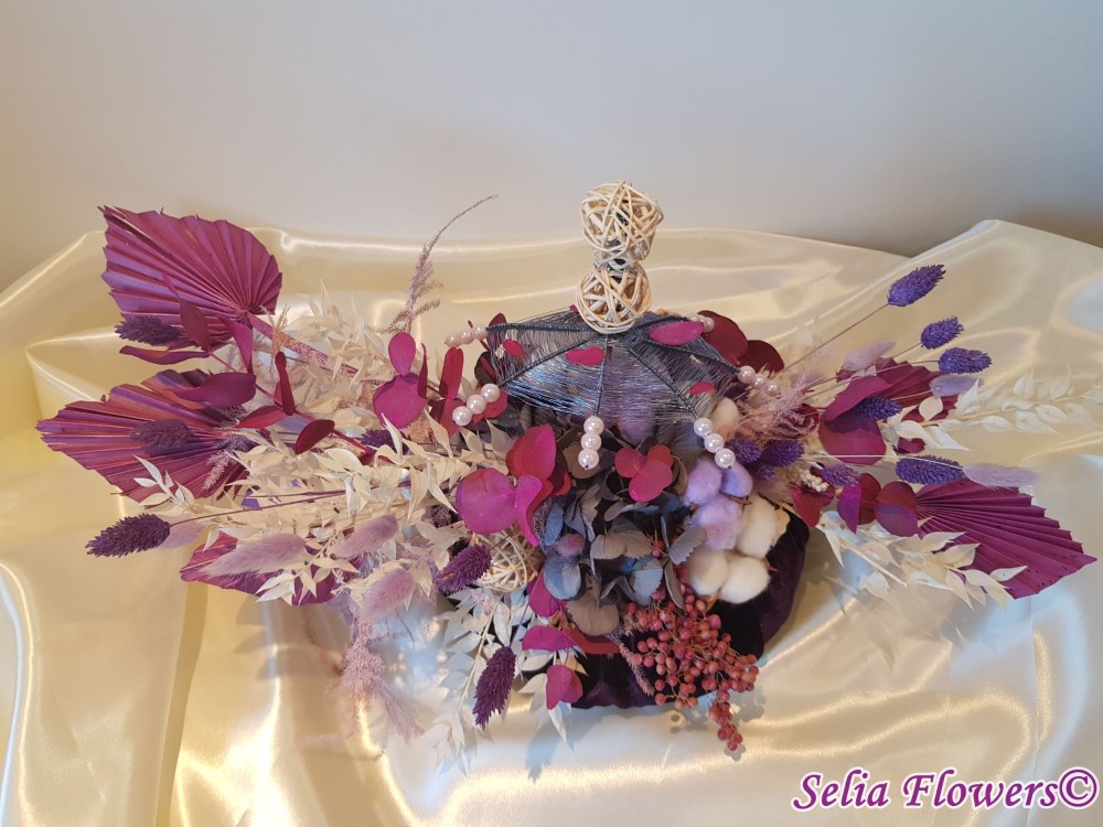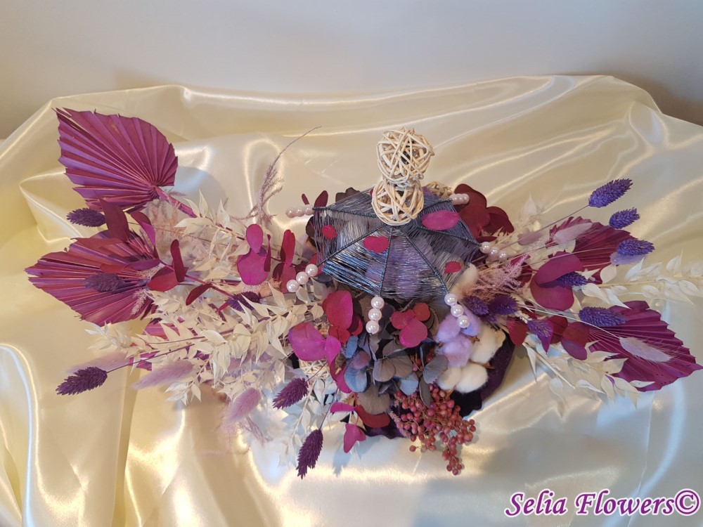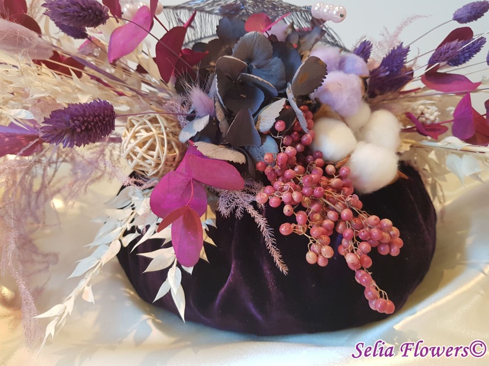 Un dovleac 100% handmade, nemuritor, cu capac realizat cu ajutotul tehnicii spider web. Este decorat cu flori de bumbac, eucalypt vopsit, ruscus stabilizat, hydrangea uscata, frunze de palmier, sfere din rattan, alte plante si flori stabilizate.