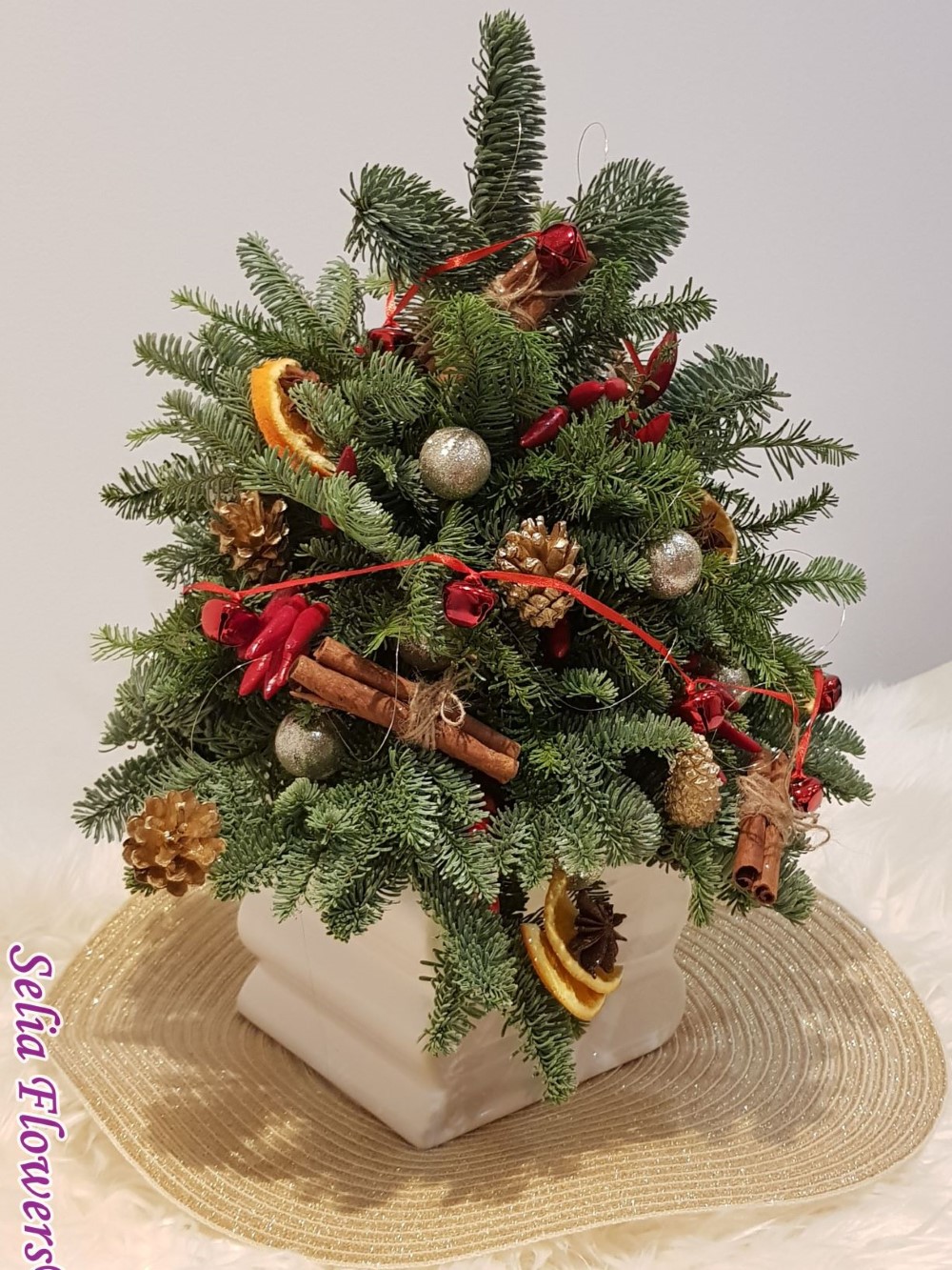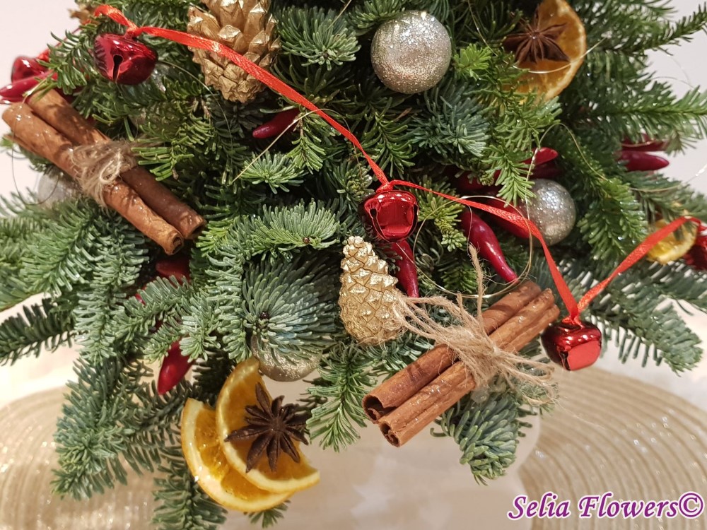 Bradut construit pe suport de burete floral umed, din brad natural argintiu si ardei rosu decorativ. Este accesorizat cu scortisoara, anason si felii deshidratate de portocala, globulete si ghirlanda cu clopotei. Inaltimea aranjamentului este de 45 cm.