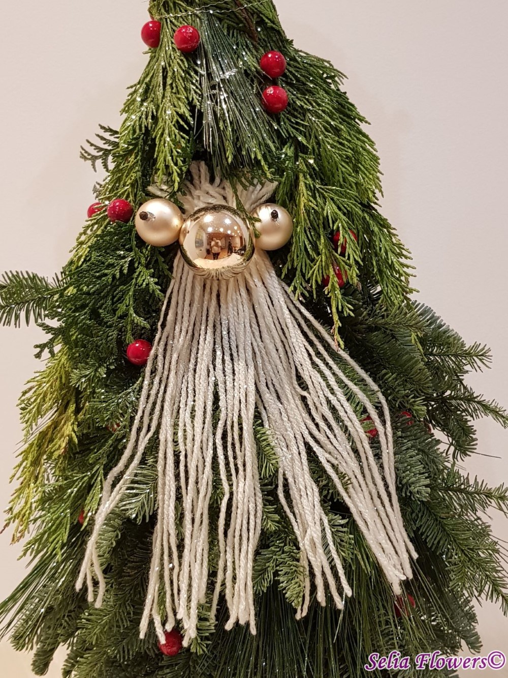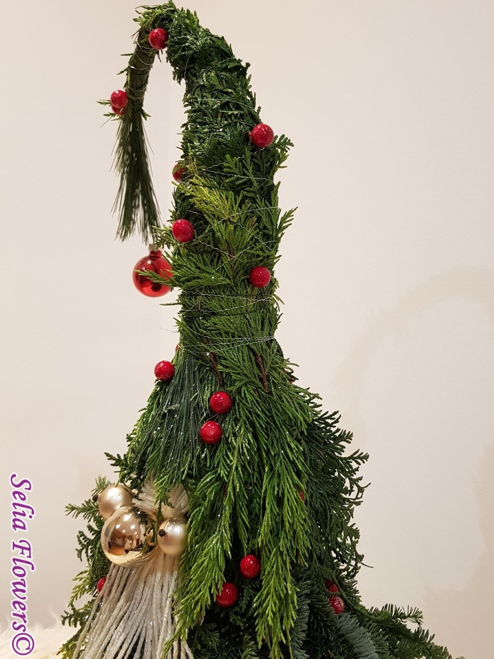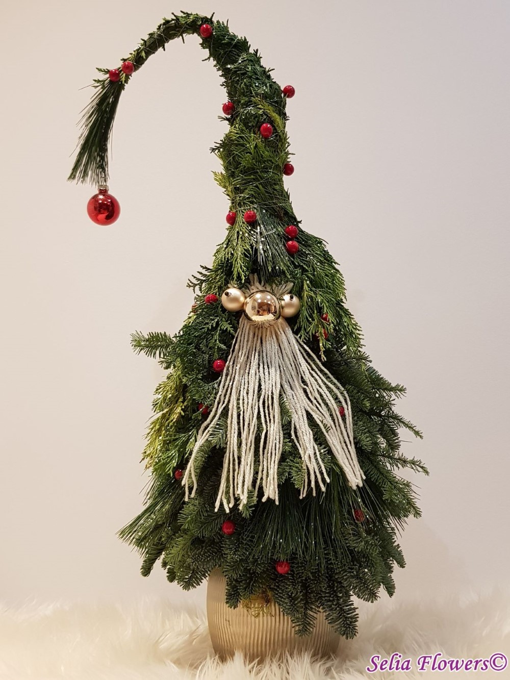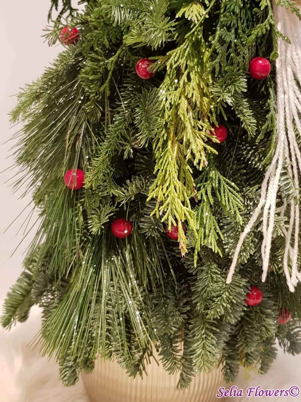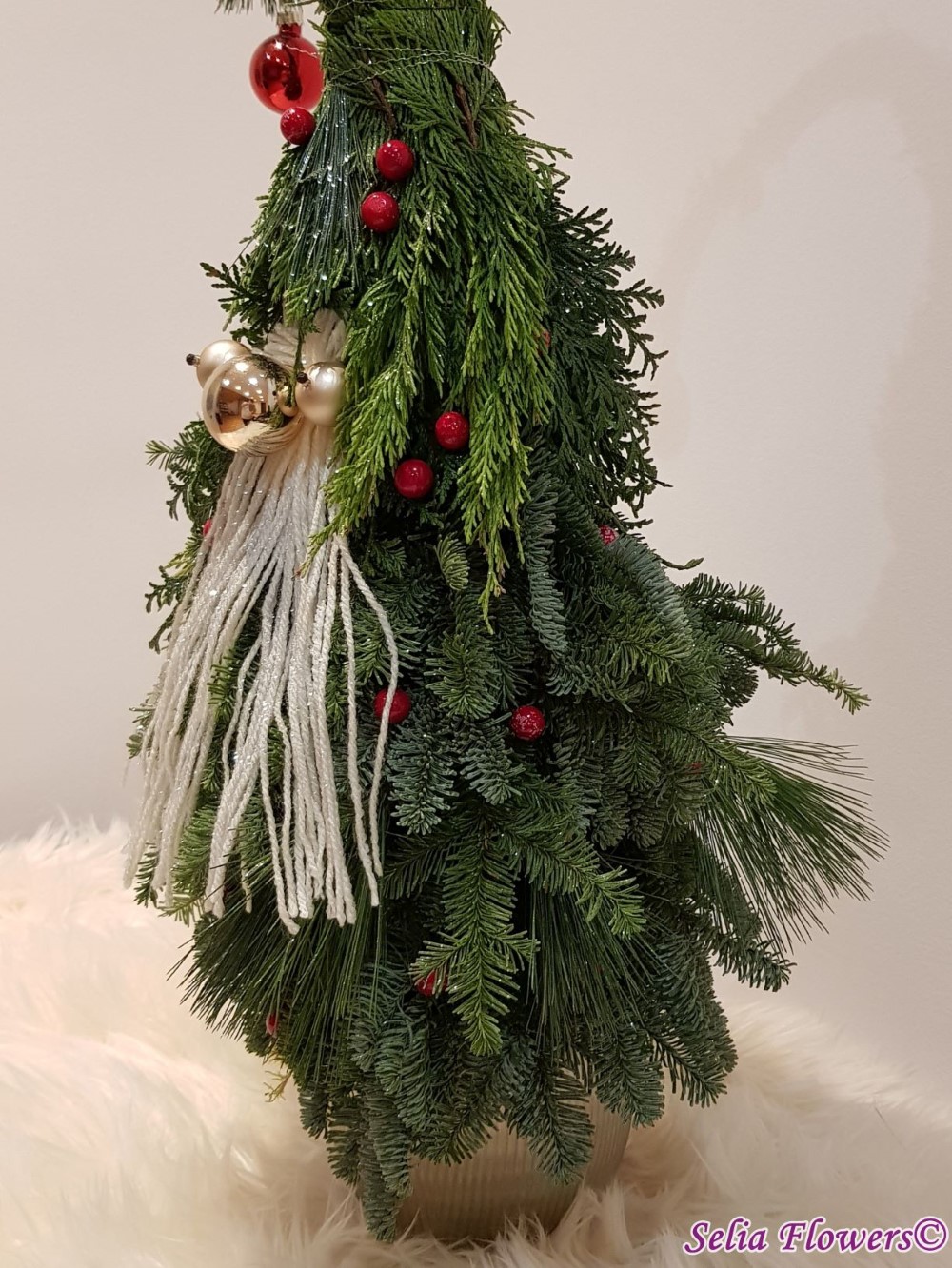 Un altfel de brad natural, realizat handmade din crengute de brad argintiu, pin, tuia, globuri si fir textil. Este construit in suport din ceramica si are o inaltime de aproape 80 cm.