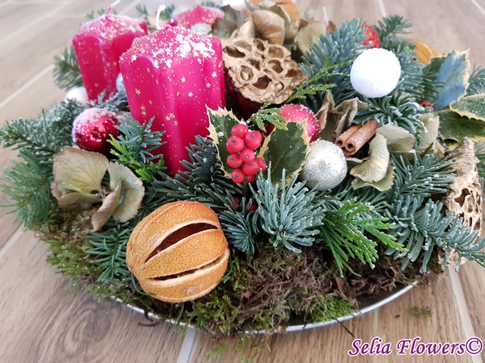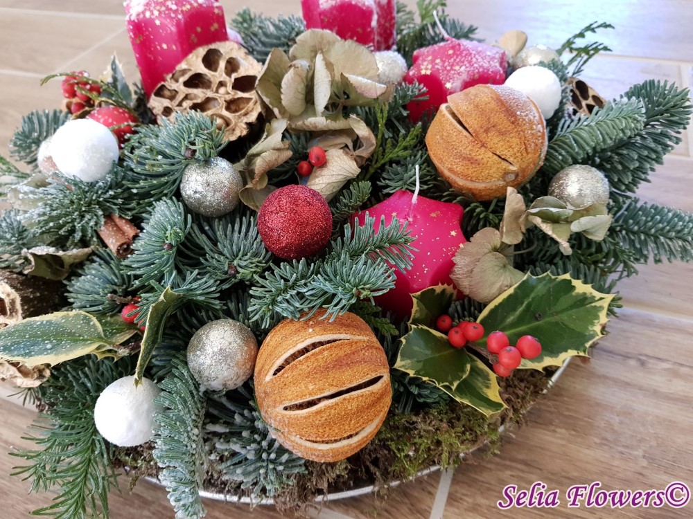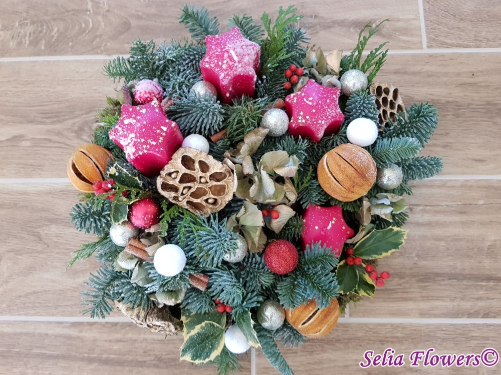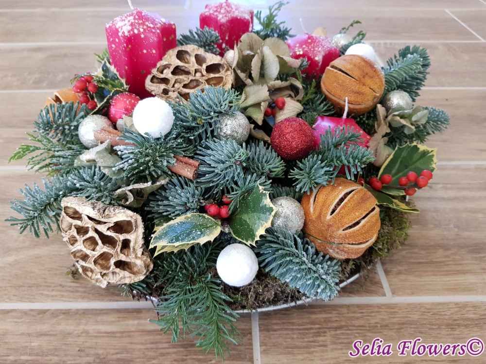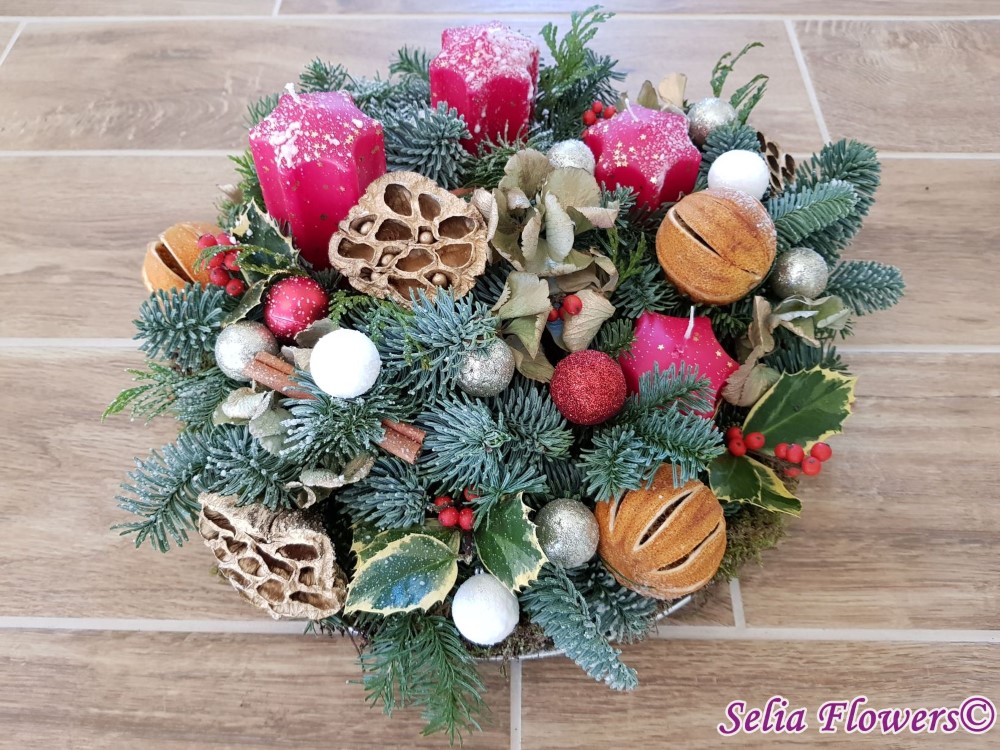 Coronita construita pe burete floral umed, cu brad, ilex, hydrangea uscata, 4 lumanari si elemente de decor specifice. Coronița de Advent este o coroană din ramuri de brad, prevăzută cu patru lumânări, care sunt aprinse succesiv în cele patru duminici din timpul Adventului.