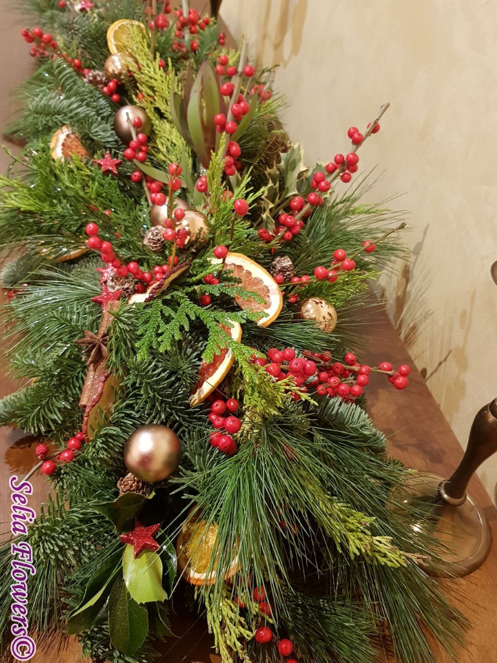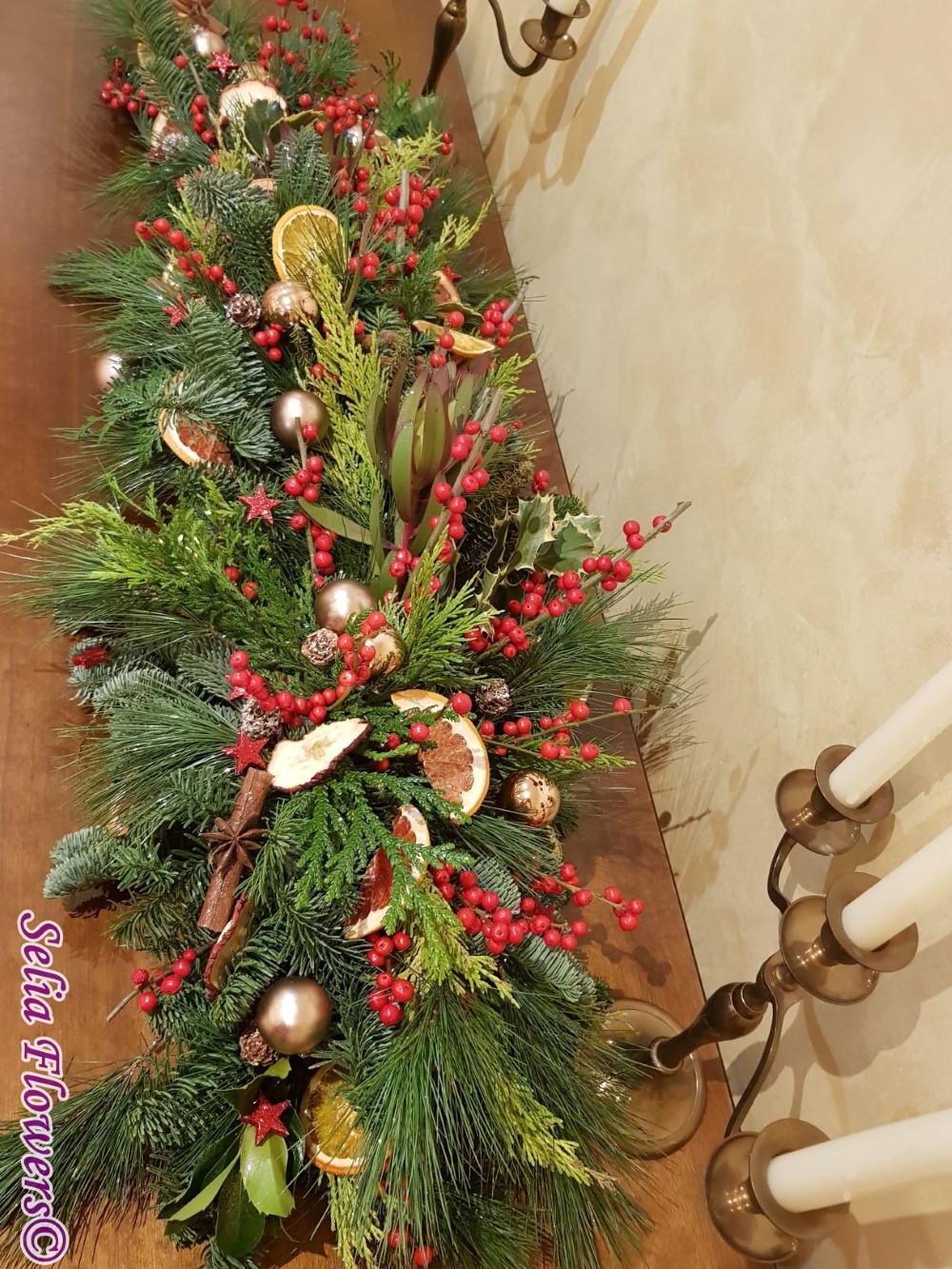 Este foarte potrivit ca decor pentru masa festiva de Craciun sau comoda din livingul tau. Lungimea aranjamentului este de aproximativ un metru .