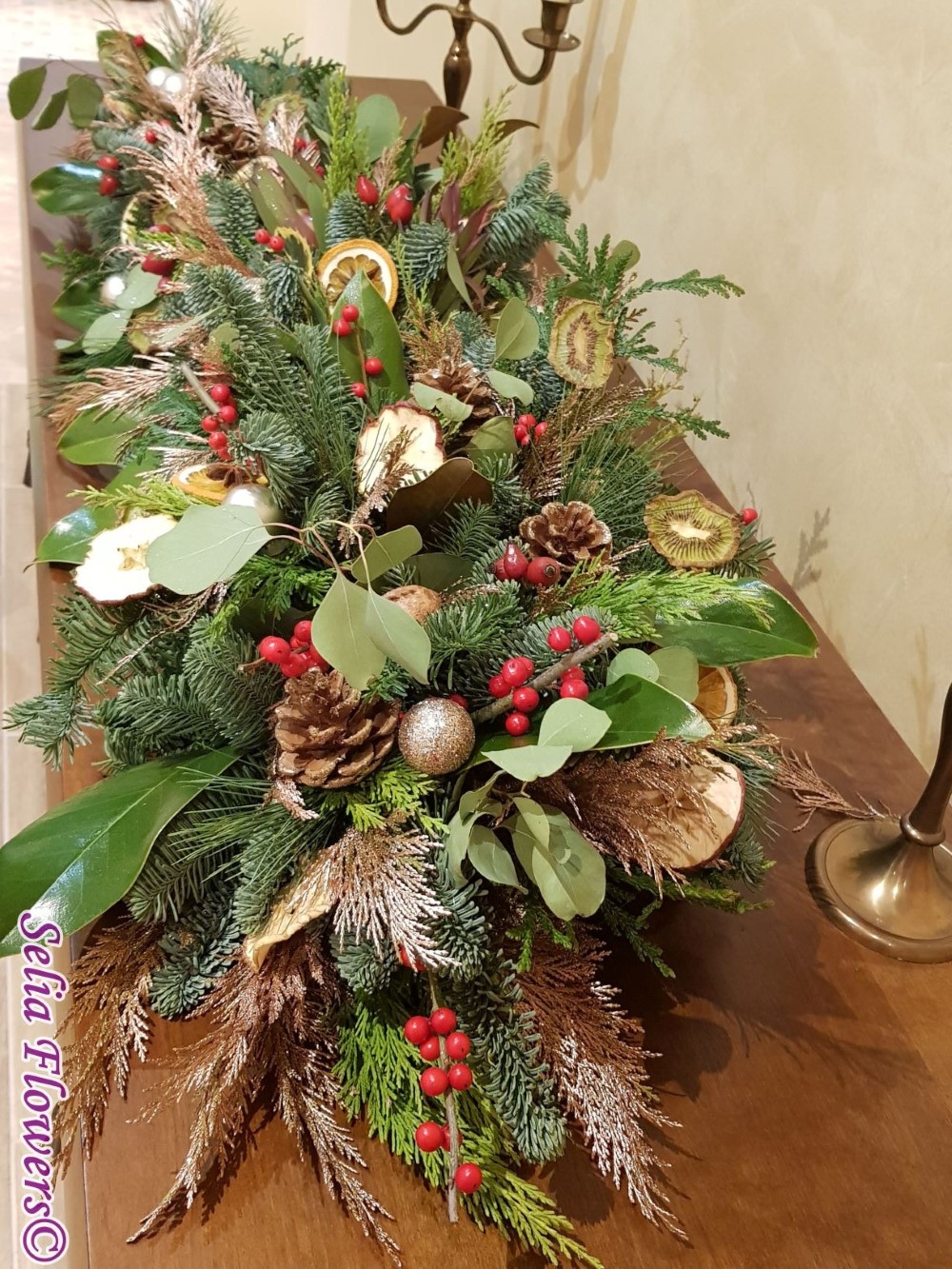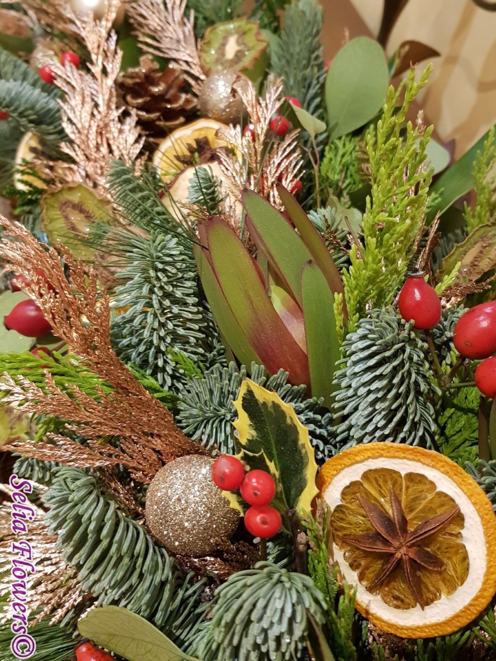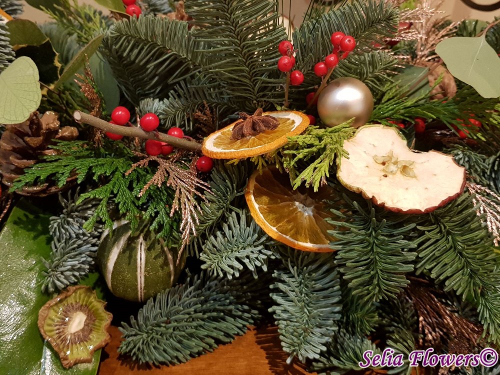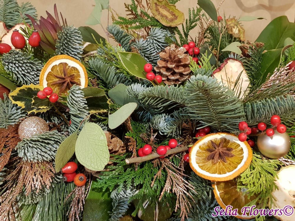 Aranjament tip ghirlanda, construit din mix de conifere, frunze de magnolie, eucalipt, ilex, anason, leucadendron, conuri de brad, globulete si mix de fructe deshidratate - lime, mar si portocala.