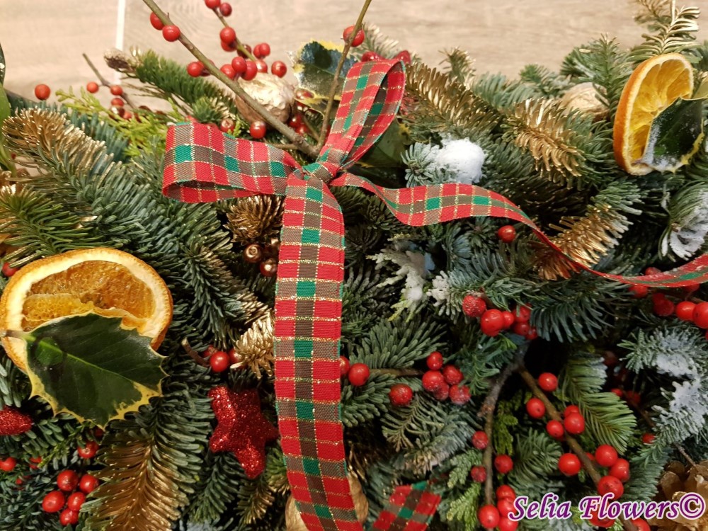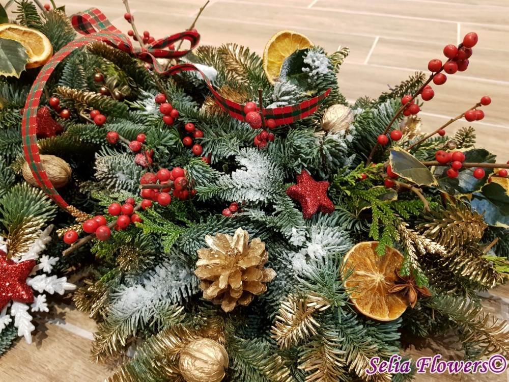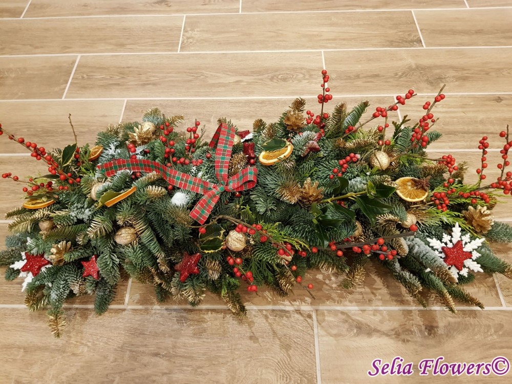 Aranjament construit sub forma unei ghirlande din brad argintiu natural, tuia, ilex, conuri de brad, nuci, portocale deshidratate si alte decoratiuni de sezon.
