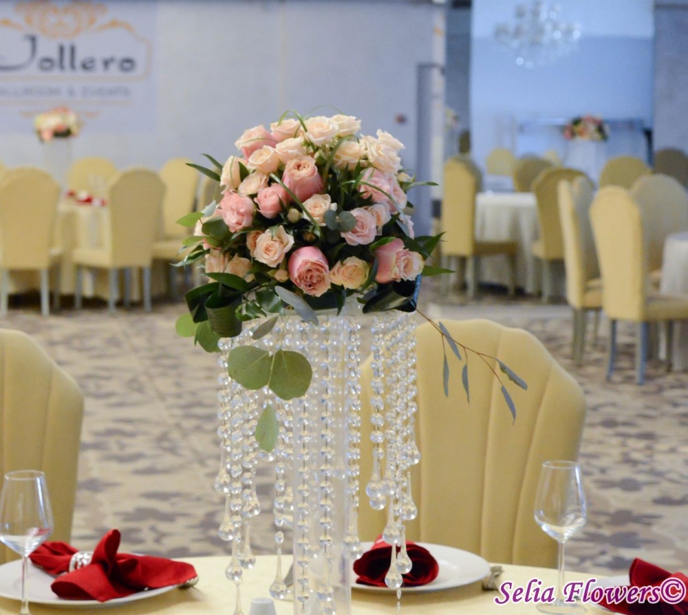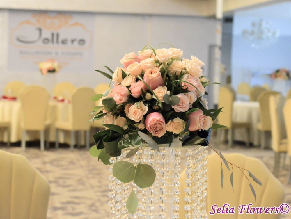 Aranjament centerpiece cu trandafiri Helen of Troy si trandafiri tros, aspidistra, eucalypt, beargrass.