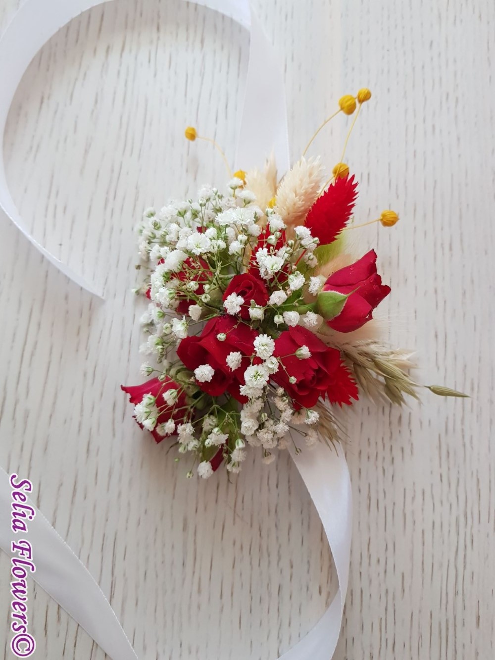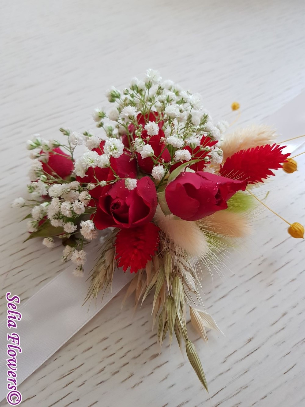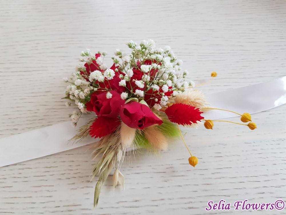 Compozitie: trandafiri tros, gypsophilla, lagurus, spice grau, tallaris, in, secara.