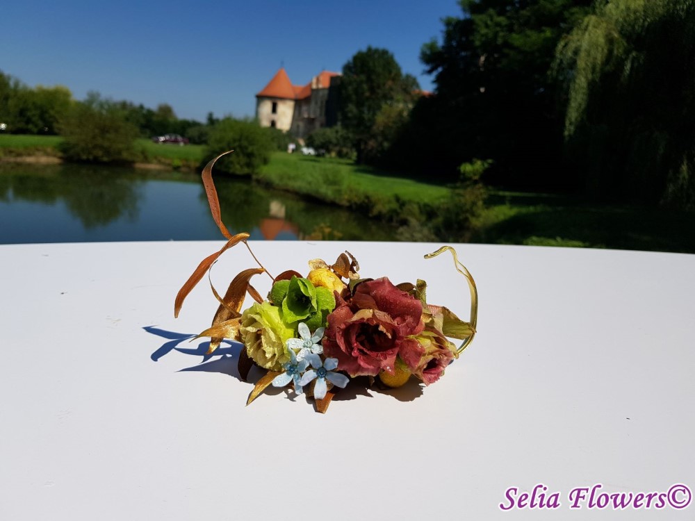 Accesorii elegante care completeaza cu succes orice tinuta. Sunt decorate cu flori naturale si flori uscate. Decorul floral este asezat pe o coronita imbracata cu organza.