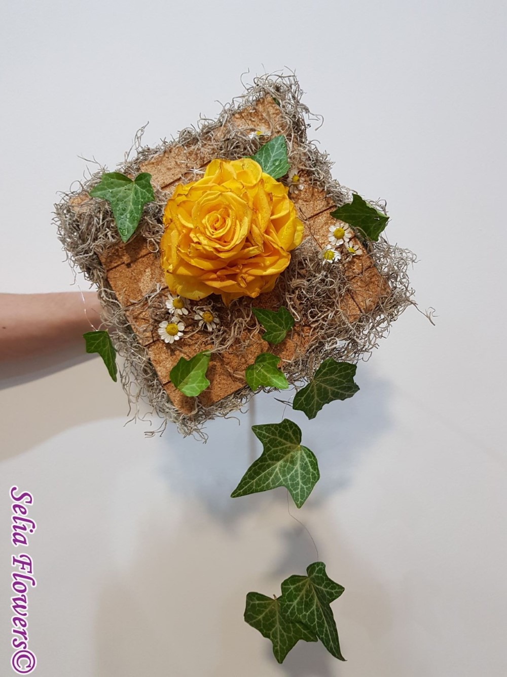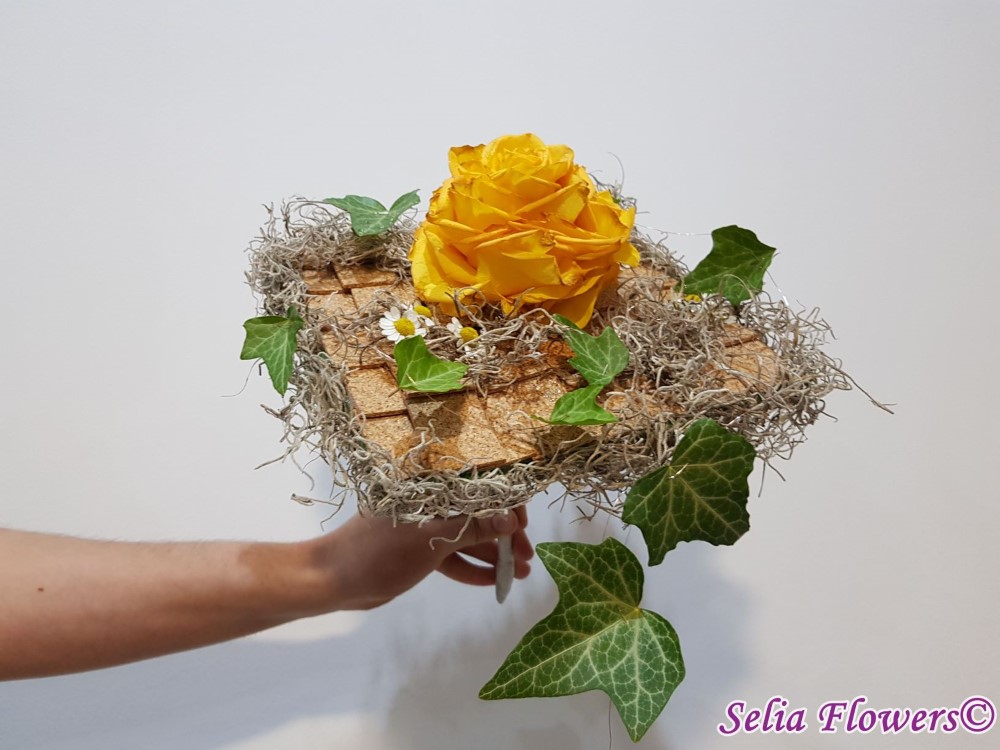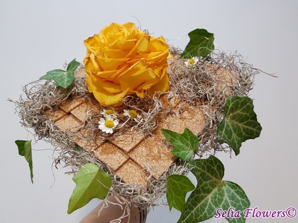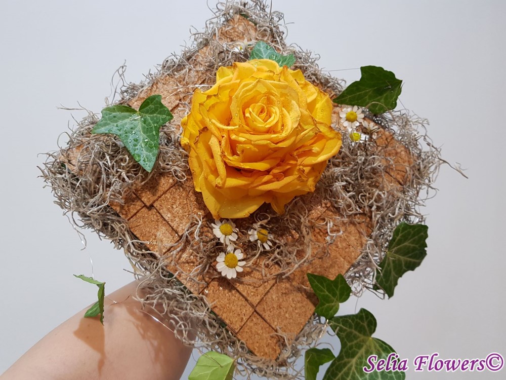 Un buchet construit pe inaltime, baza fiind o structura lucrata cu bronzenet, fire de sarma decorativa, fetru, tillandsia si pluta. Este accesorizat cu o ghirlanda din frunze de iedera si flori de matricaria. Inaltimea trandafirului rezultat, 12 cm. Latura structurii, 25-27 cm.