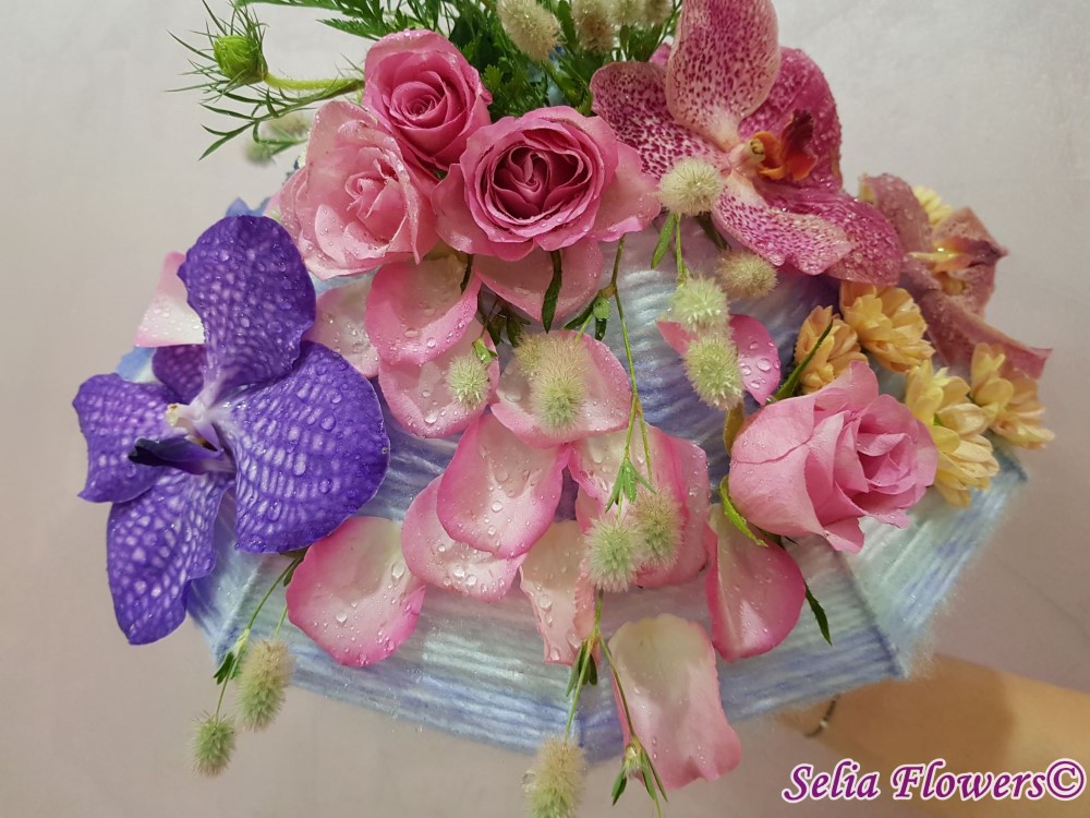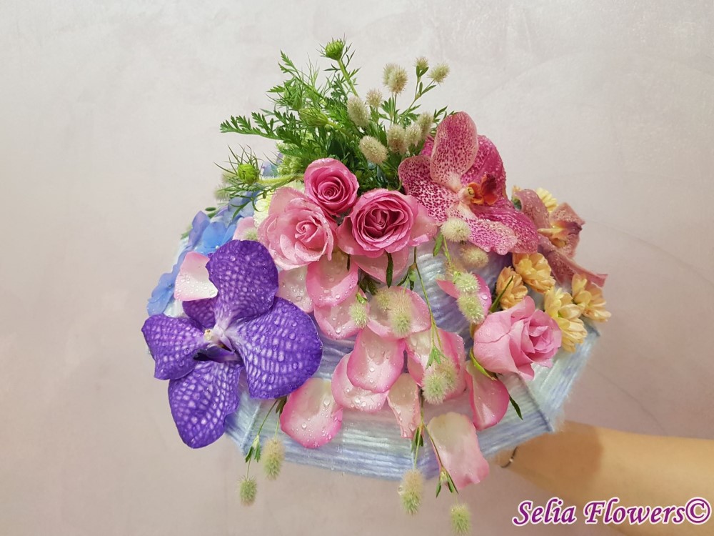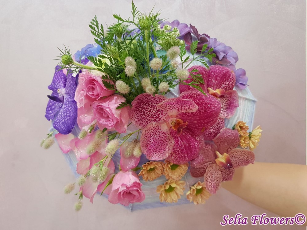 Culorile verii intr-un buchet vesel, realizat pe structura spider, din trandafiri, orhidee vanda, hydrangea, crizanteme si material vegetativ din flora spontana.