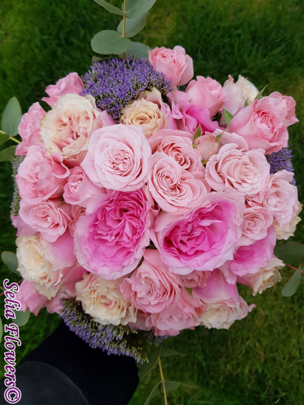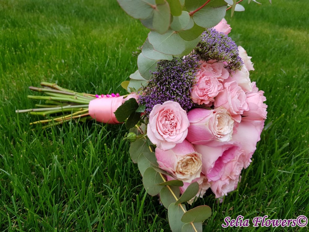 Compozitie: trandafiri Madame Bombastic spray, trandafiri Helen of Troy si spray Yustine (tros), trachelium, eucalypt