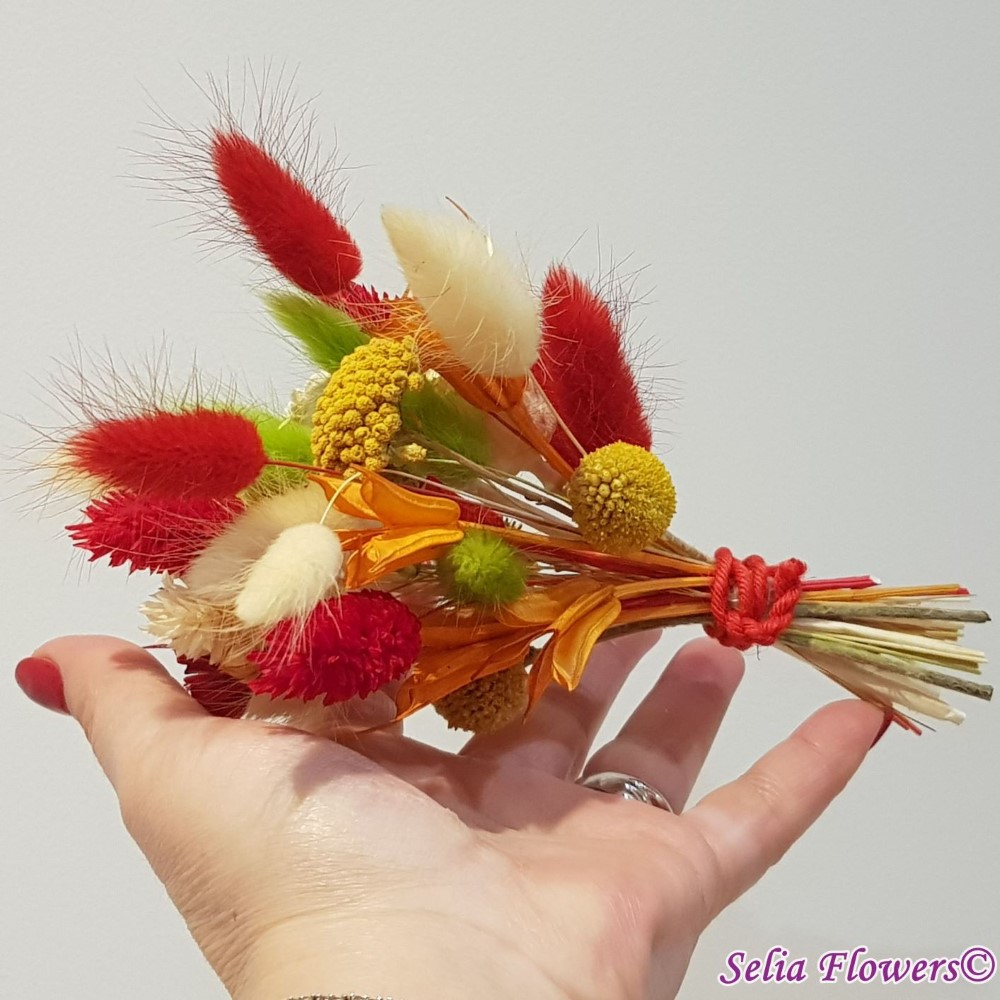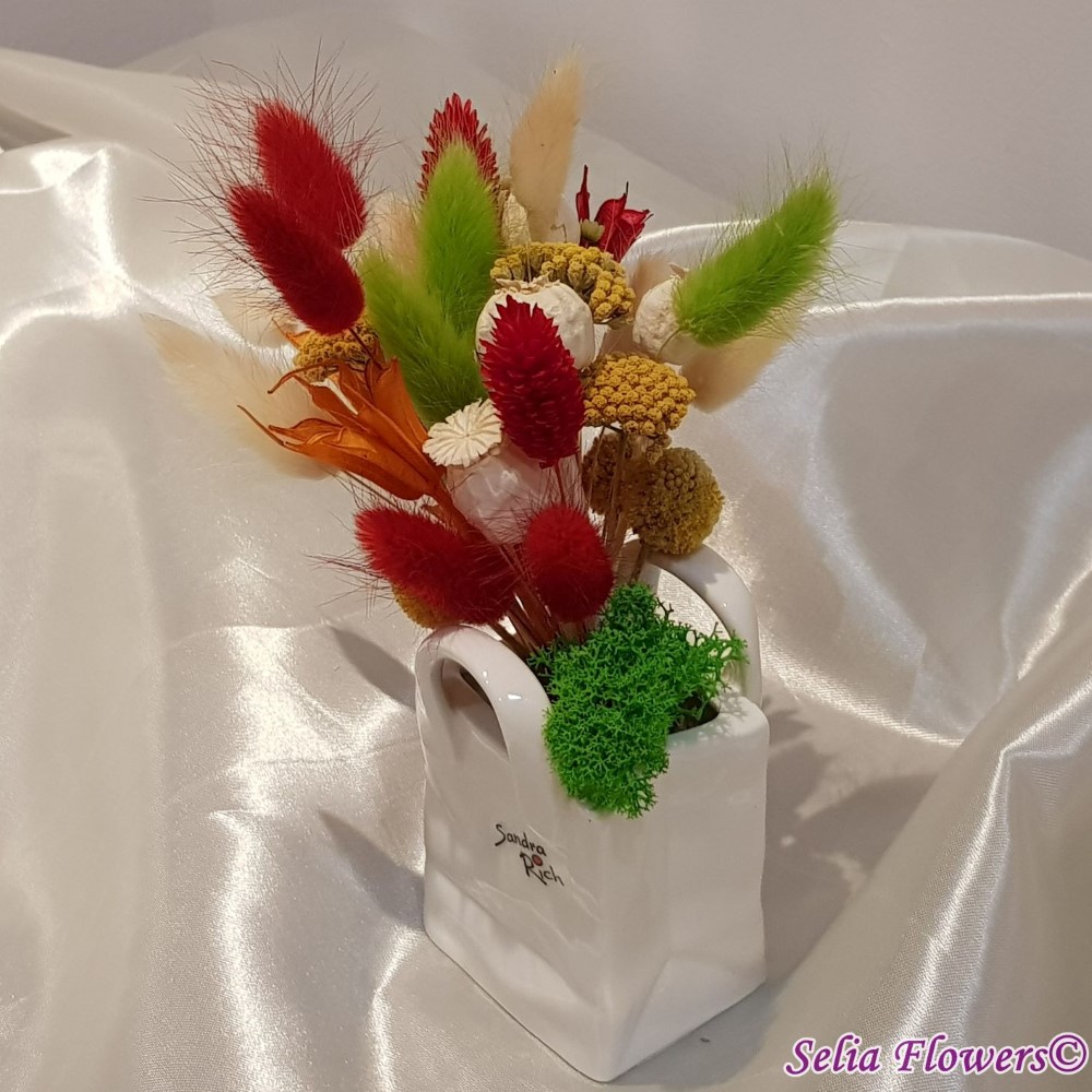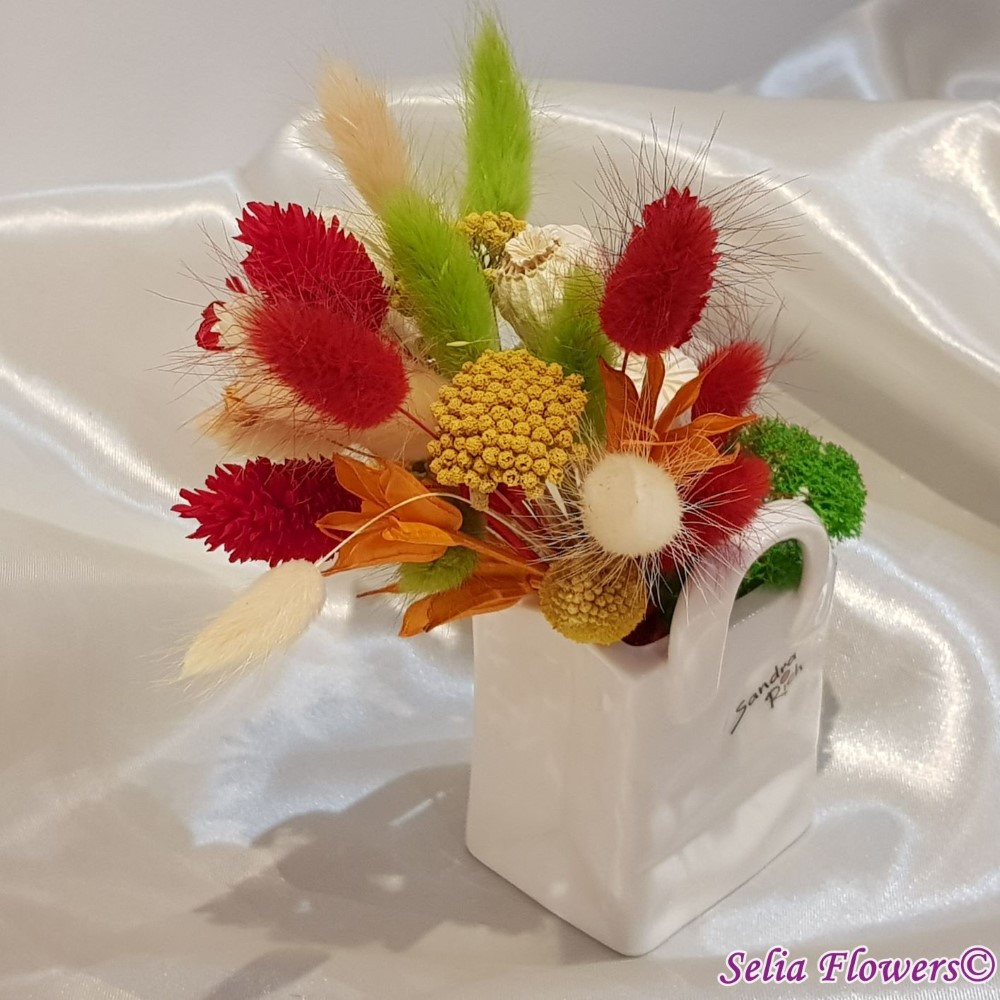 Alege sa daruiesti un martisor unicat, vesel si colorat, sub forma de buchet, construit din flori uscate sau stabilizate. Inaltimea buchetelului este de 17 cm Buchetelul este insotit de o punguta cadou din material ceramic, cu o inaltime de 9,5 cm.