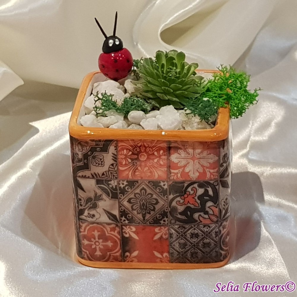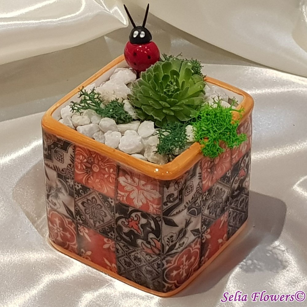 Martisor floral cu suculenta, licheni stabilizati, accesorii, pietricele din marmura decorativa. Este construit in vas ceramic cu model, tip cub (inaltimea vasului 8 cm).