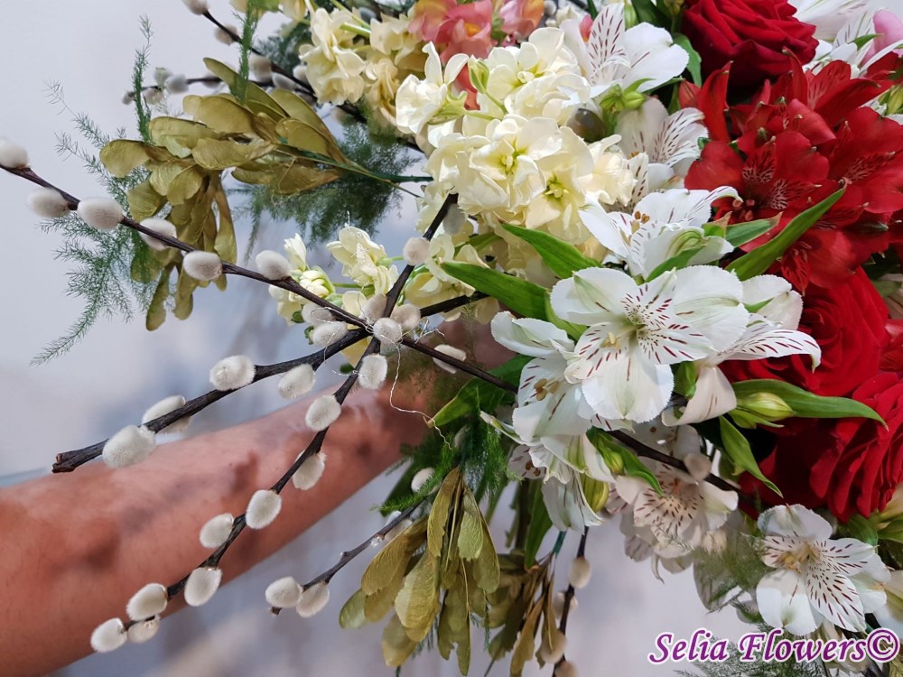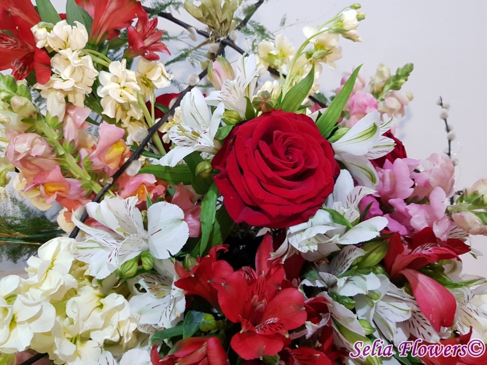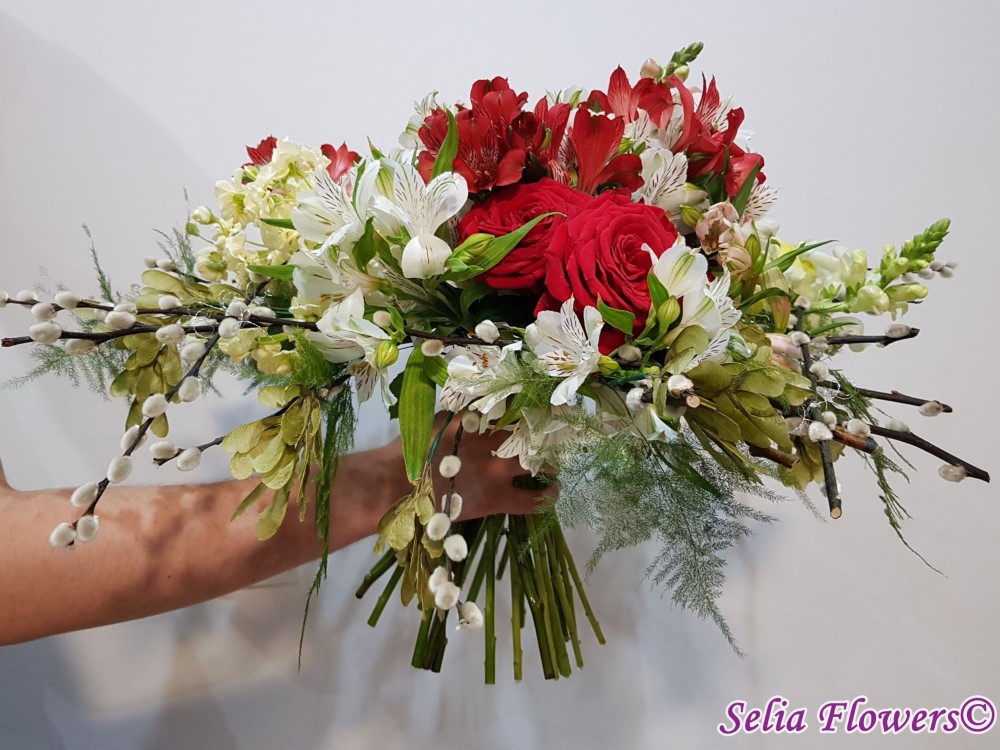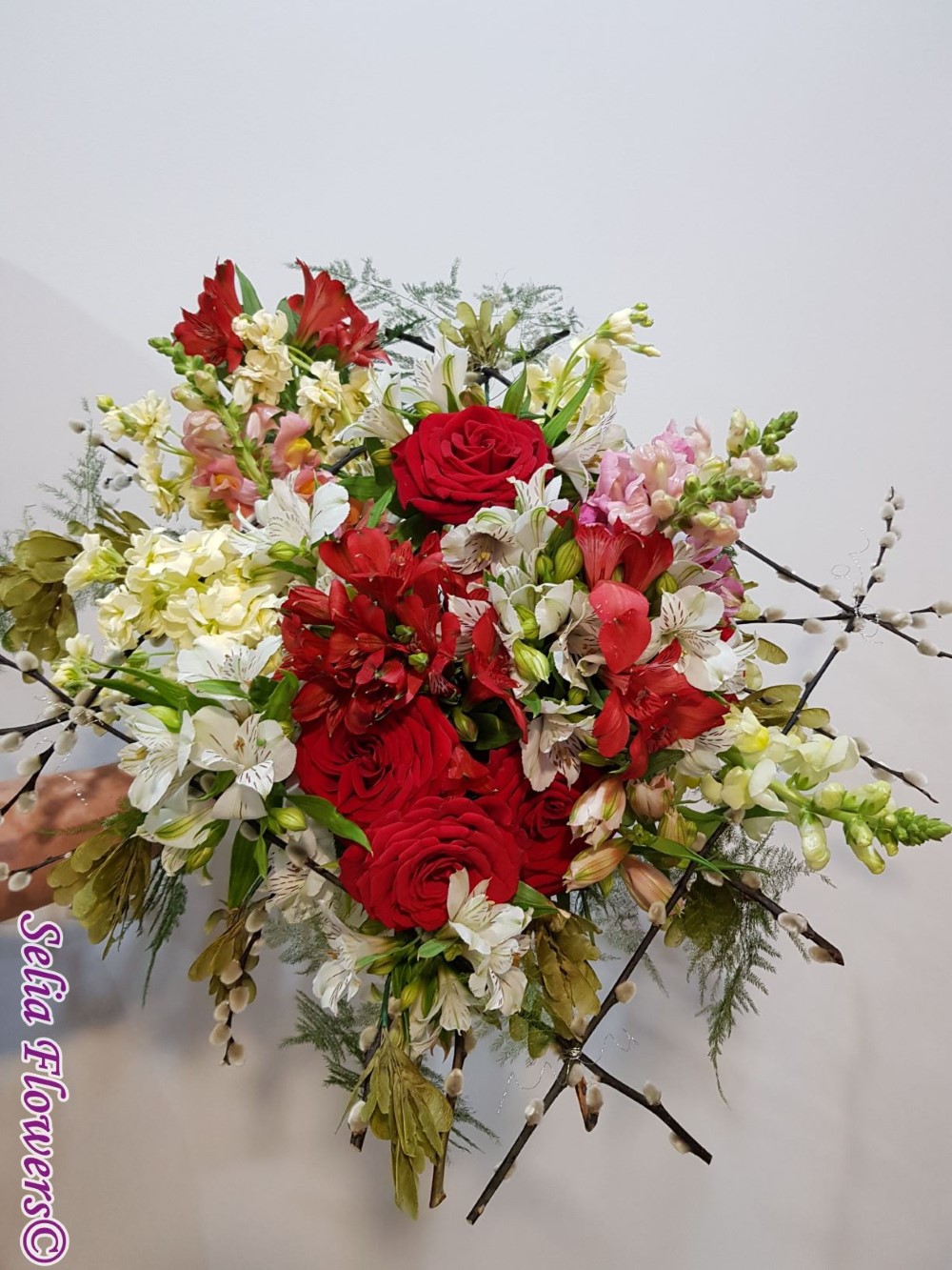Culoare si parfum intr-un buchet expresiv, construit pe structura de sarma si salix, cu trandafiri, mathiola, alstroemeria, crengute de asparagus.