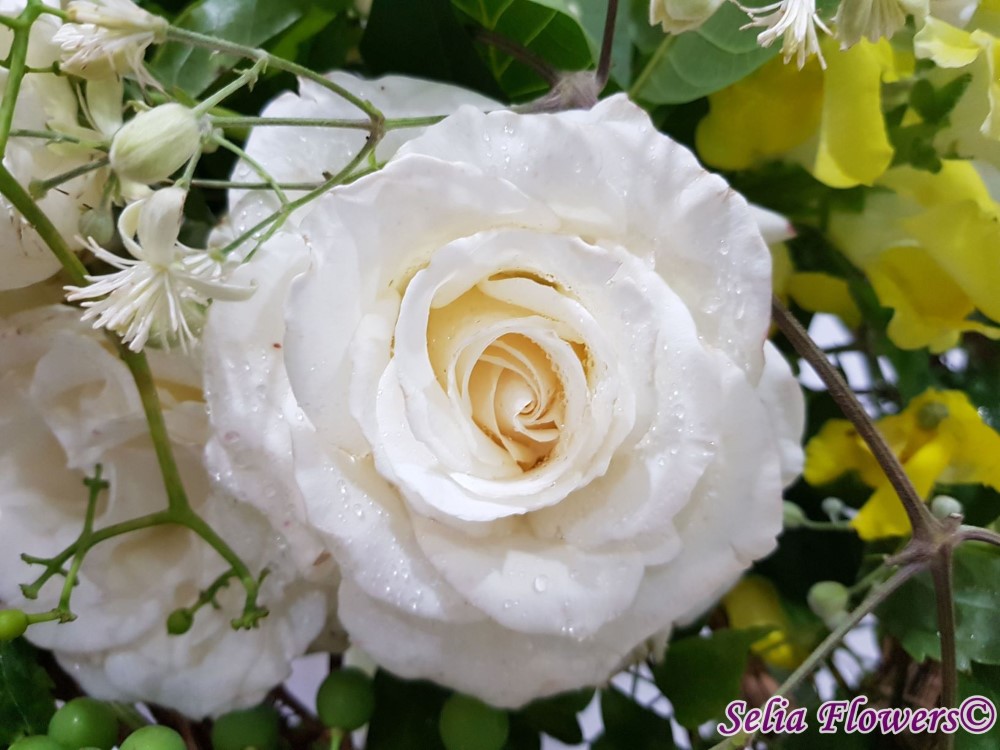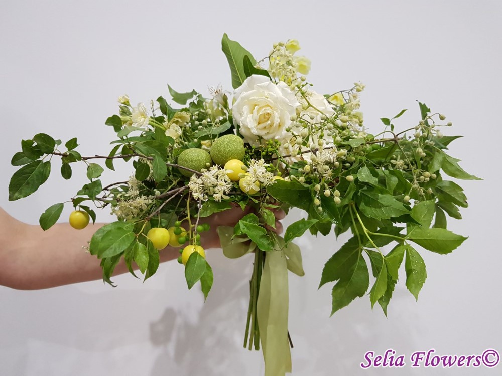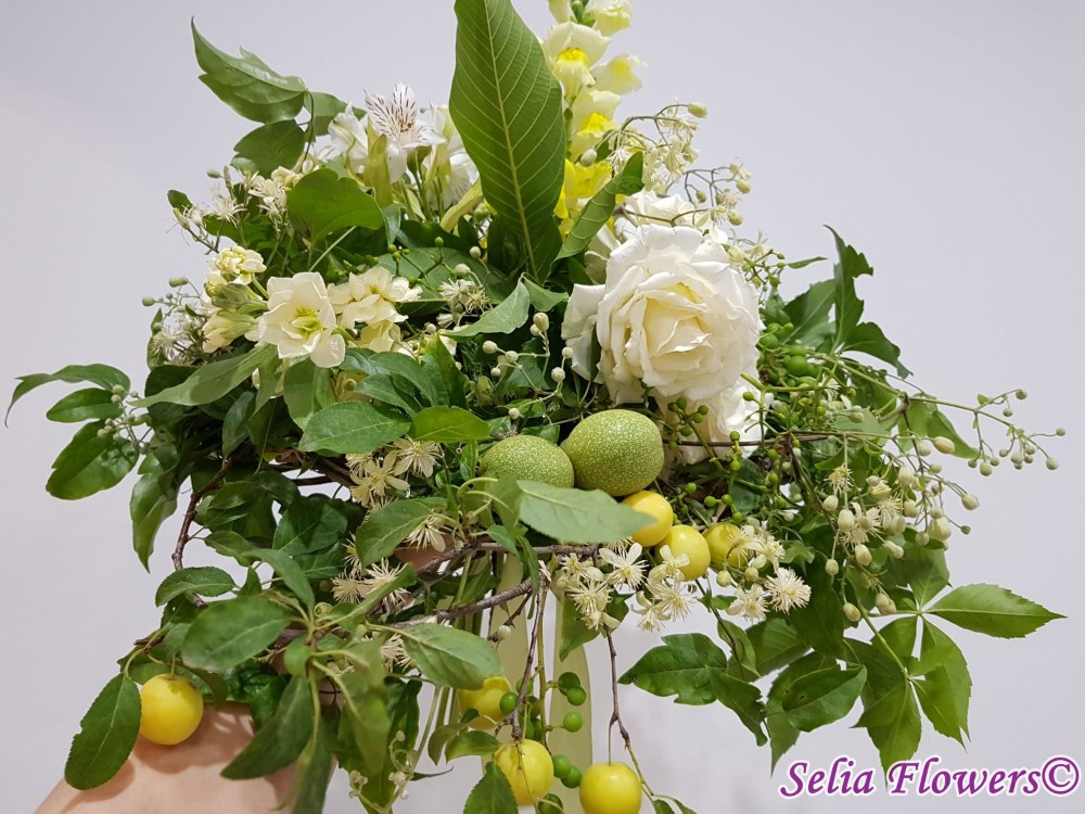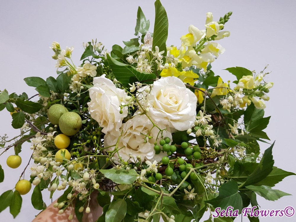 Un buchet de toamna, realizat pe structura de sarma si iedera, construit cu: trandafiri, matthiola, clematis, parthenocissus, fructe de toamna.