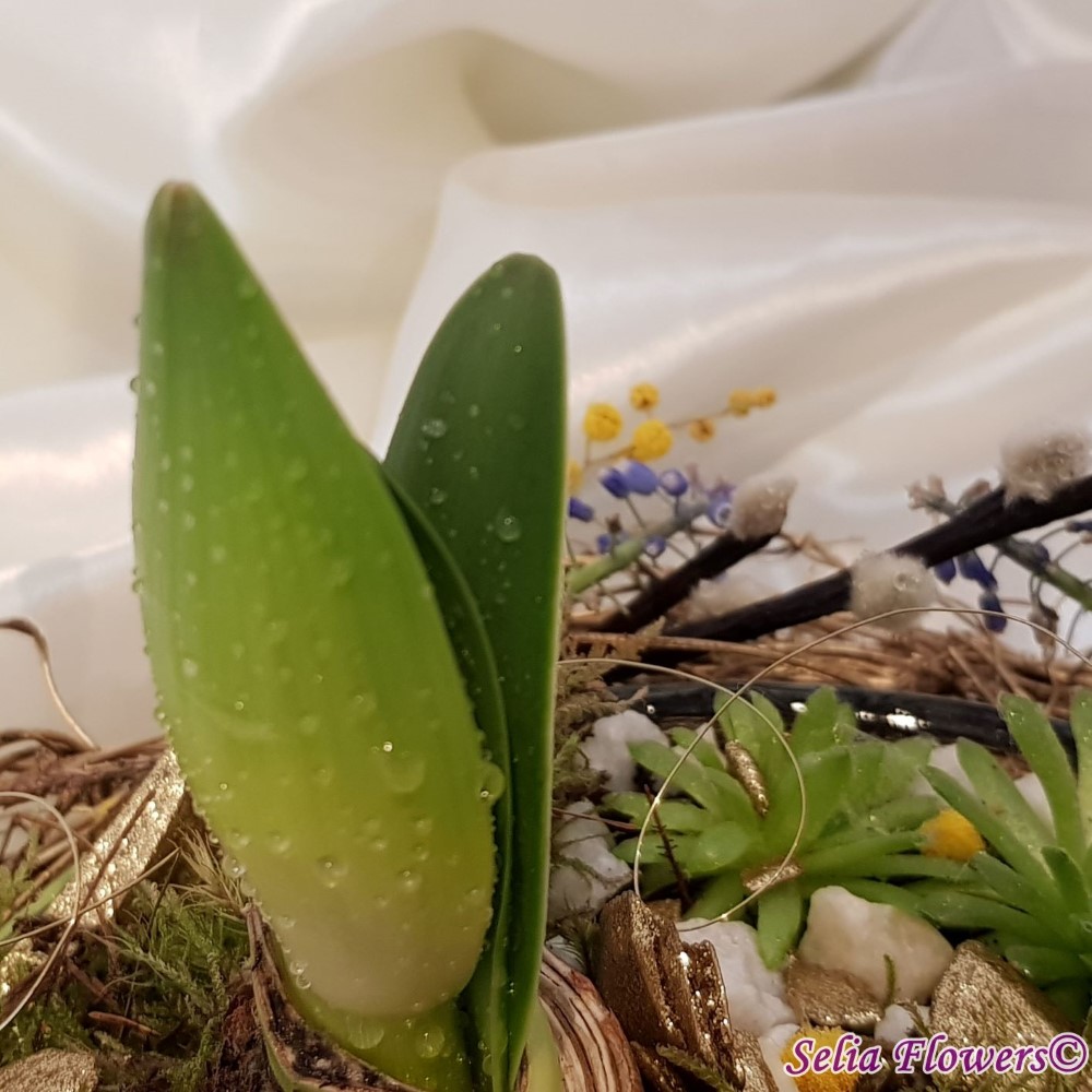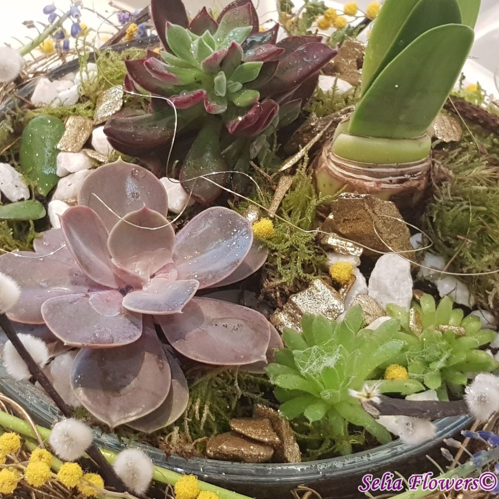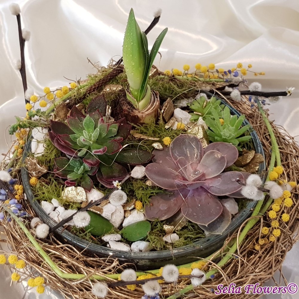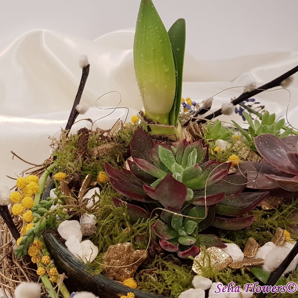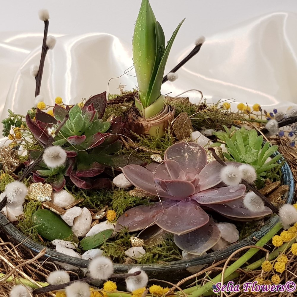 O gradina in miniatura construita in bol rotund din sticla cu plante suculente, amaryllis roz si muschi natural. Aranjamentul este decorat cu pietricele de marmura decorativa si fasii de lemn vopsite. O coronita eleganta, construita din crengute naturale uscate si decorate cu flori uscate de muscari, mimosa si crengute de salix, inconjoara bolul pe toata circumferinta lui.