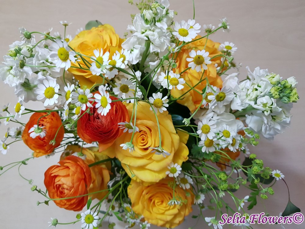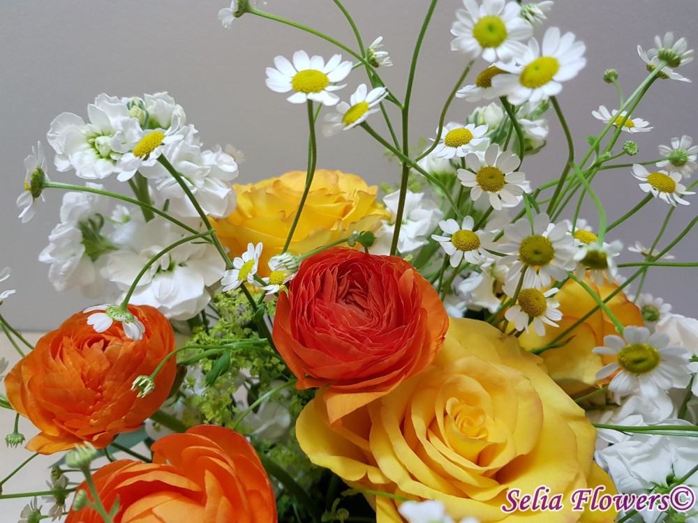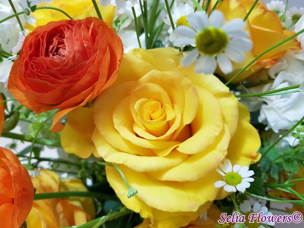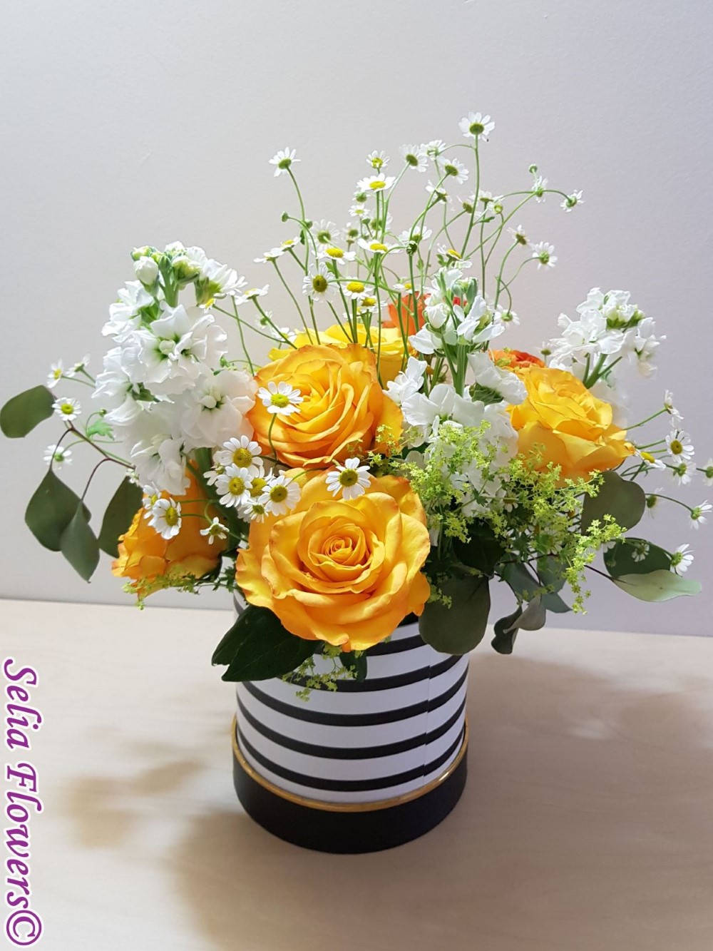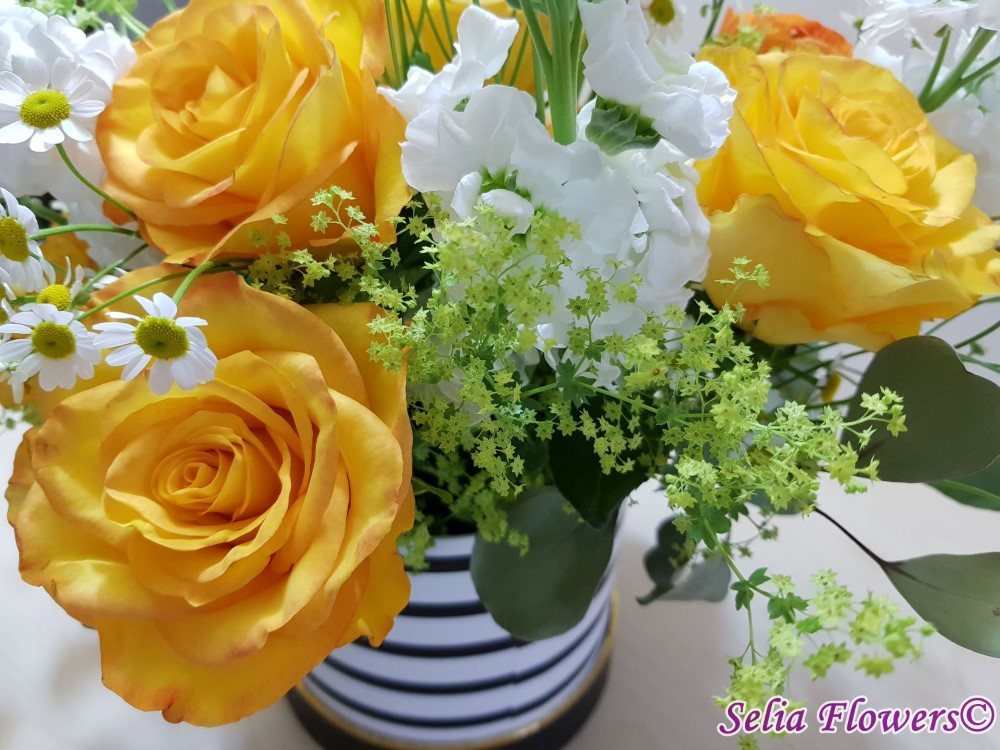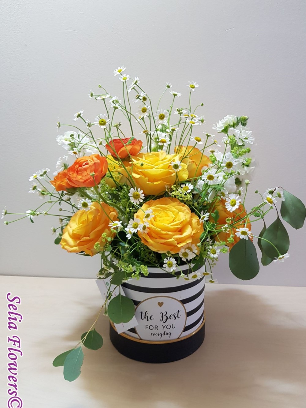 Un aranjament in cutie, vesel ca o primavara, realizat realizat cu trandafiri galbeni, ranunculus, matricaria.