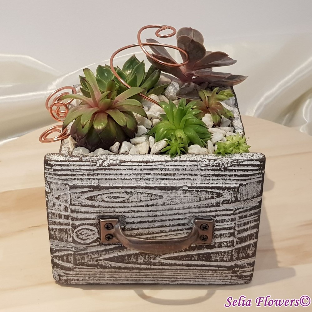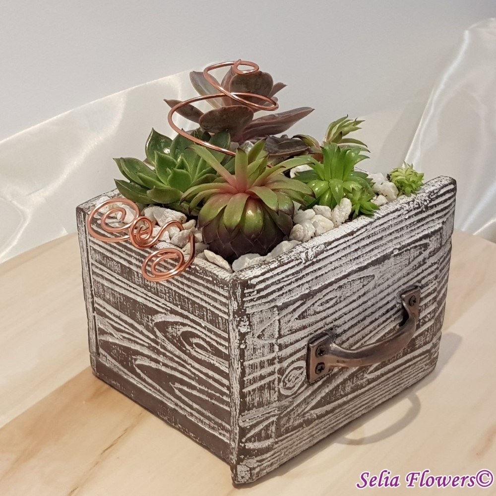 Un aranjament construit in ghiveci ceramic tip sertar, dintr-un mix de plante suculente.