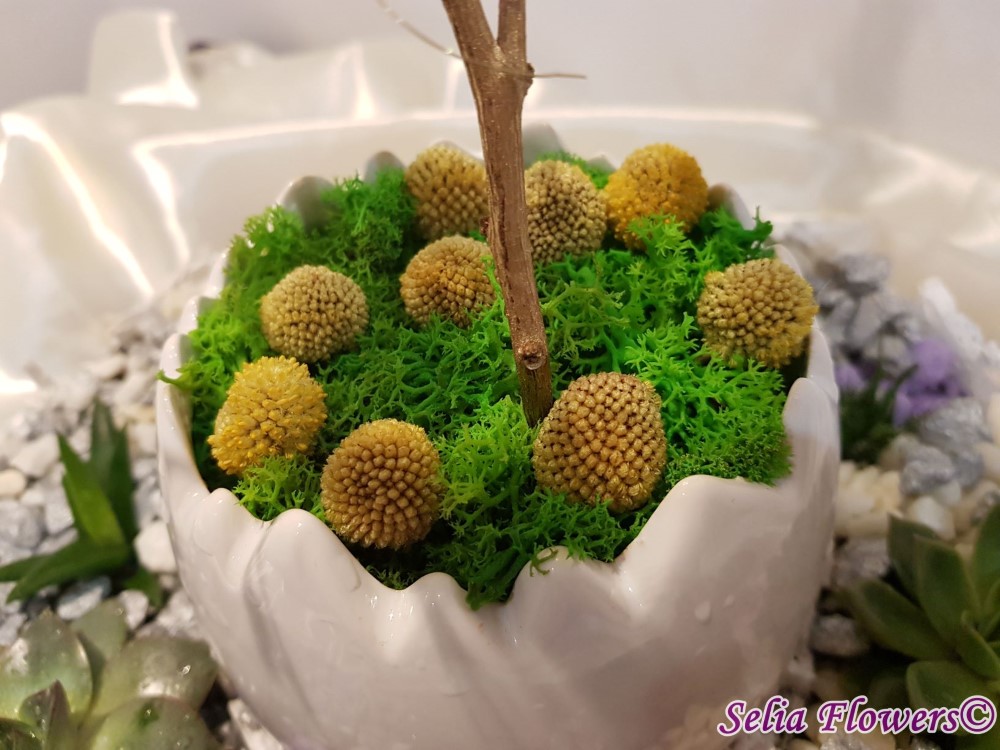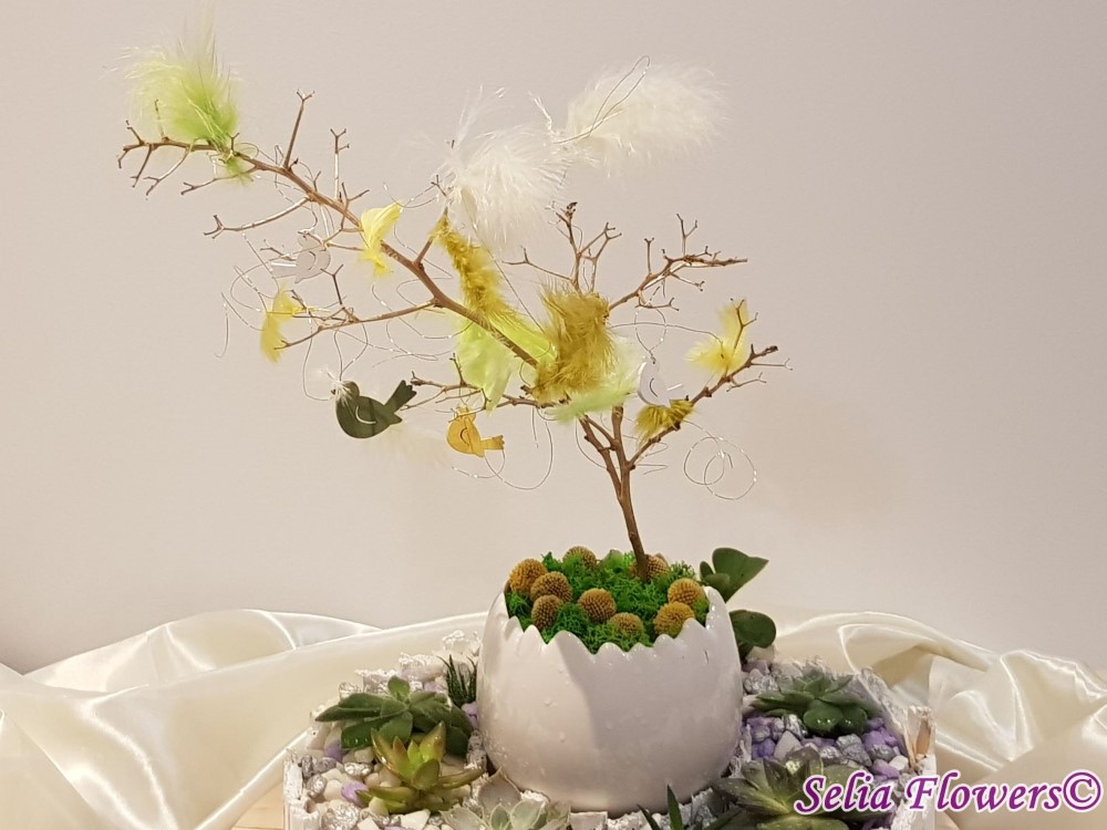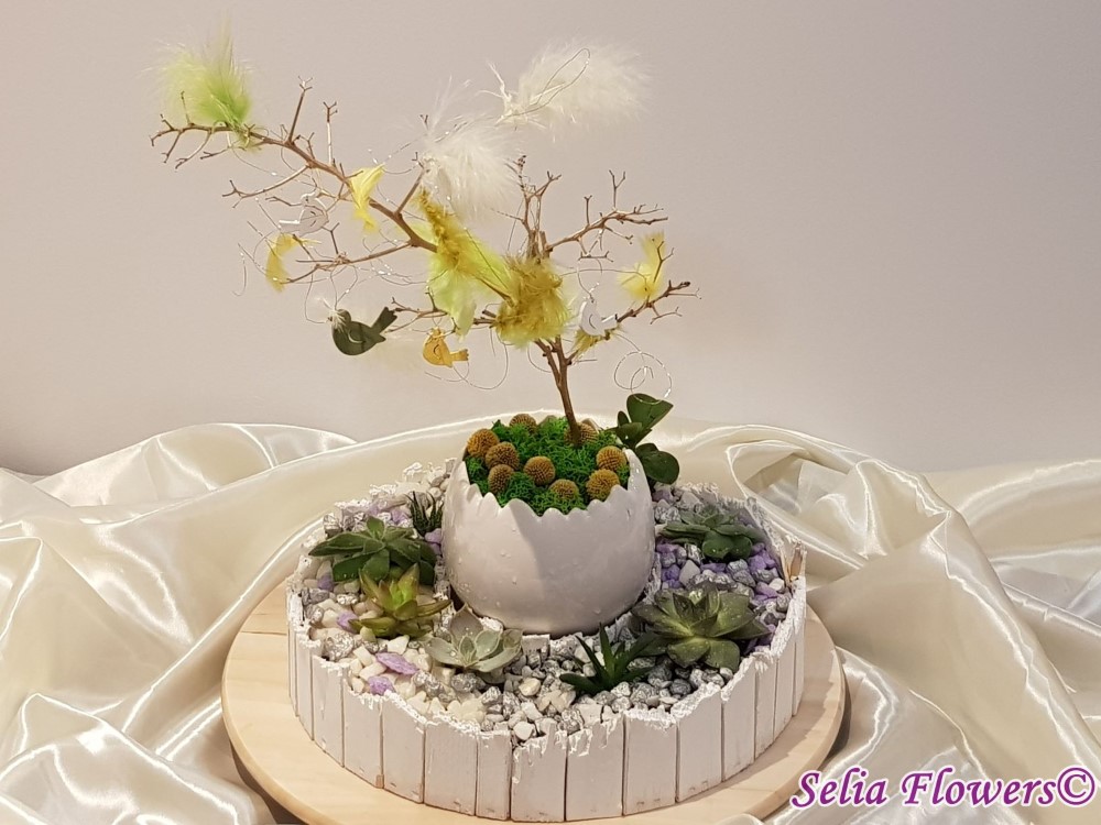 Este construit intr-un cos rotund din lemn dintr-un mix de plante suculente si piatra decorativa in diverse culori. Elementele de decor pascal (ghirlanda de pene si figurine pasare) sunt construite pe creanga uscata naturala asezata in bol ceramic sub forma de ou si decorat cu muschi natural si flori naturale uscate de craspedia. Potrivit ca aranjament de business, pentru a fi daruit unei persoane dragi sau te poti chiar tu bucura de el in confortul casei tale.