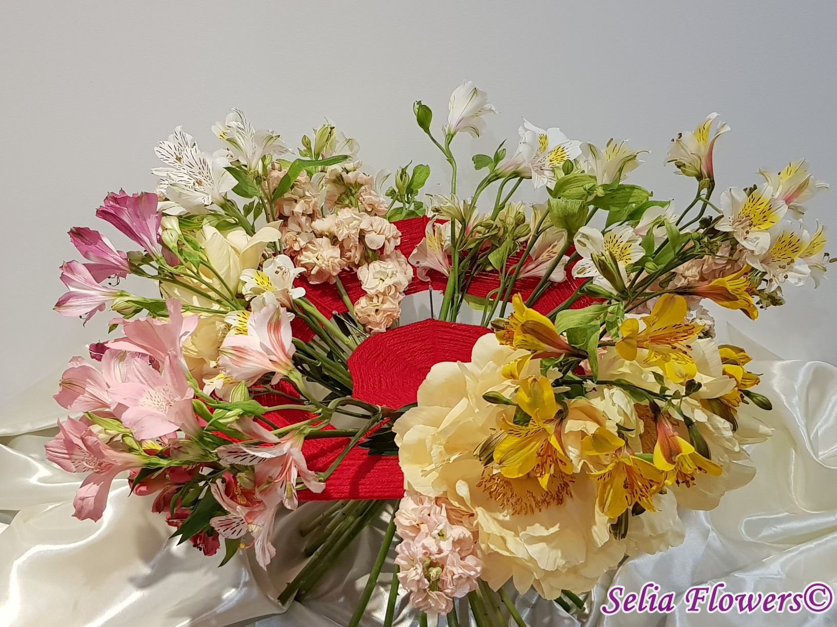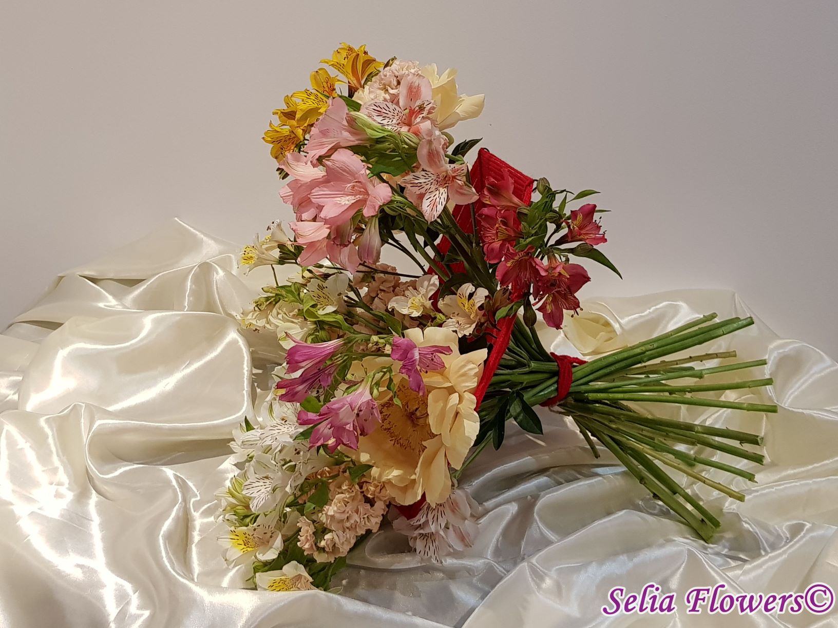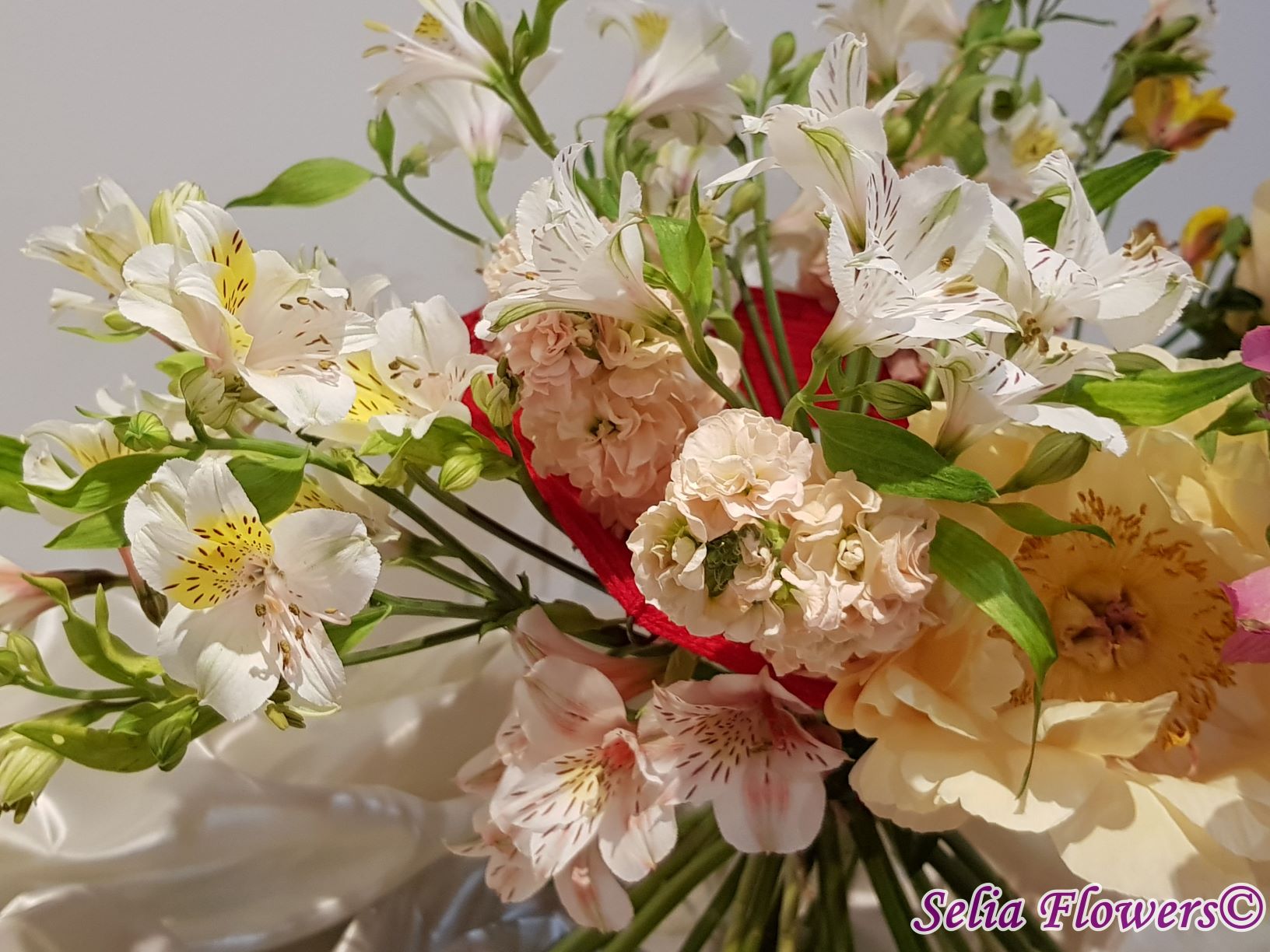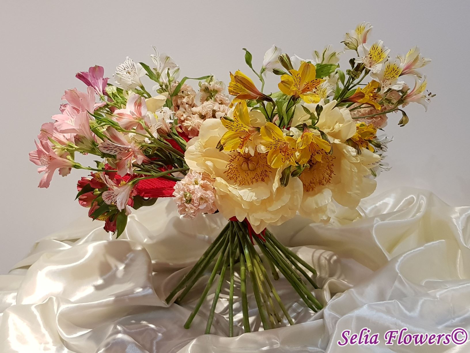 Un buchet elegant, vesel si parfumat, construit pe structura spider web din 15 fire de alstroemeria, bujori si mathiola.