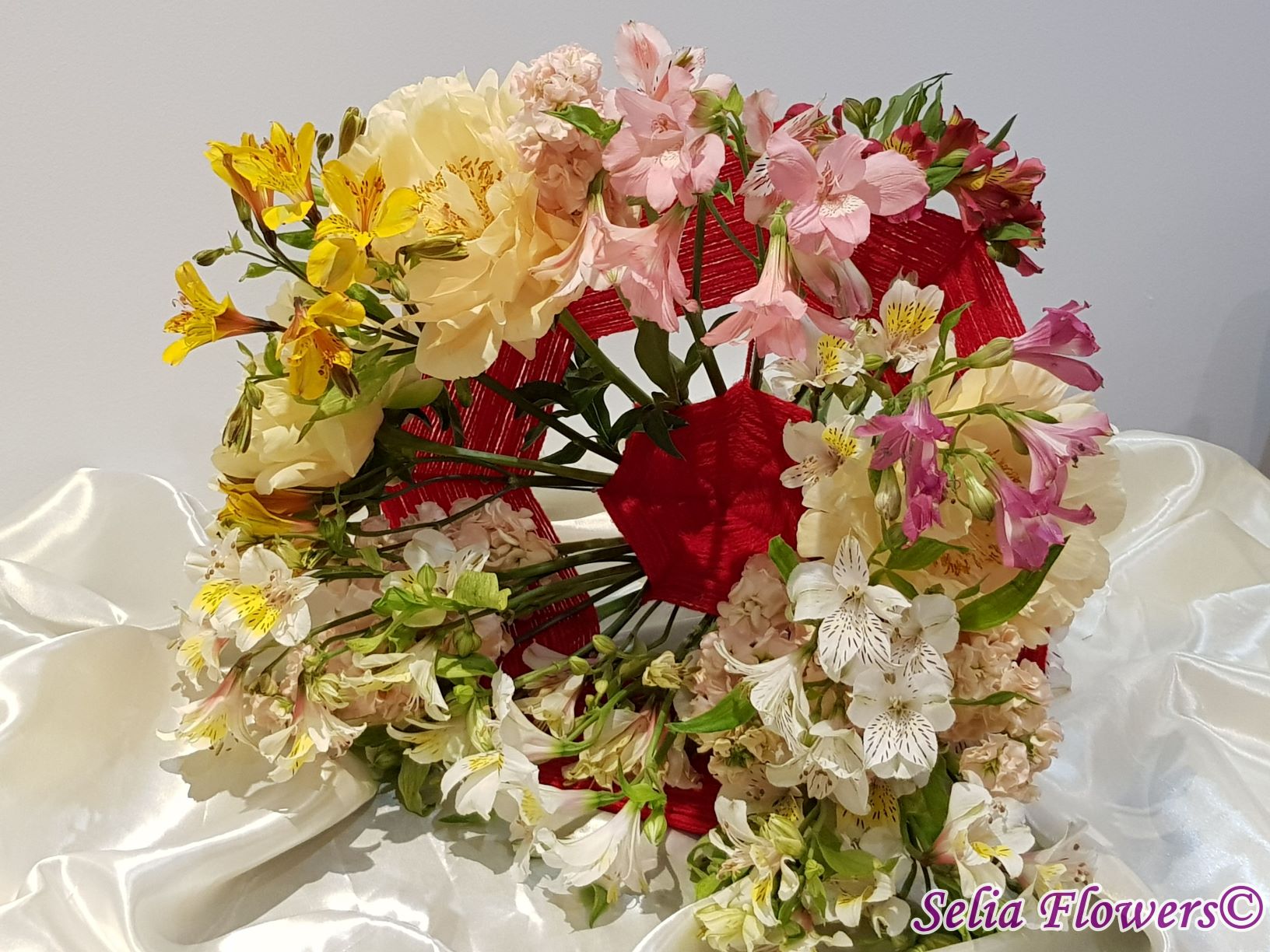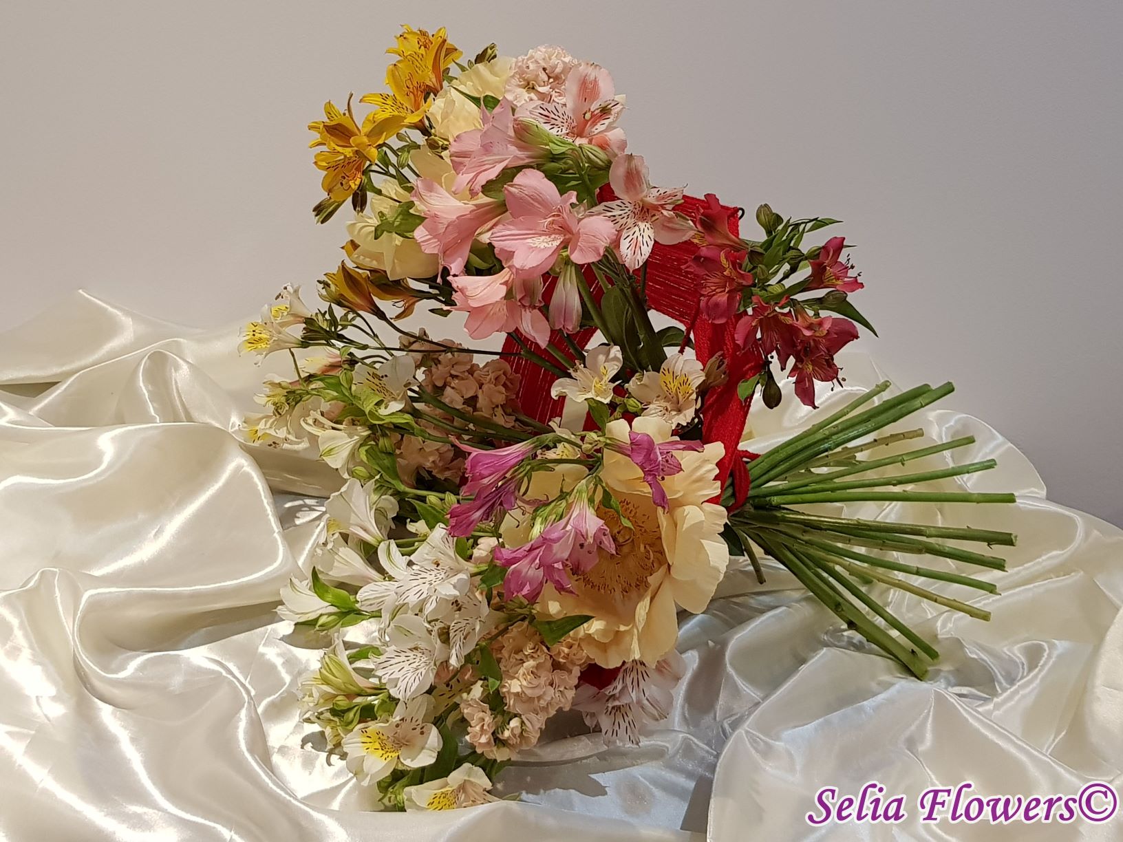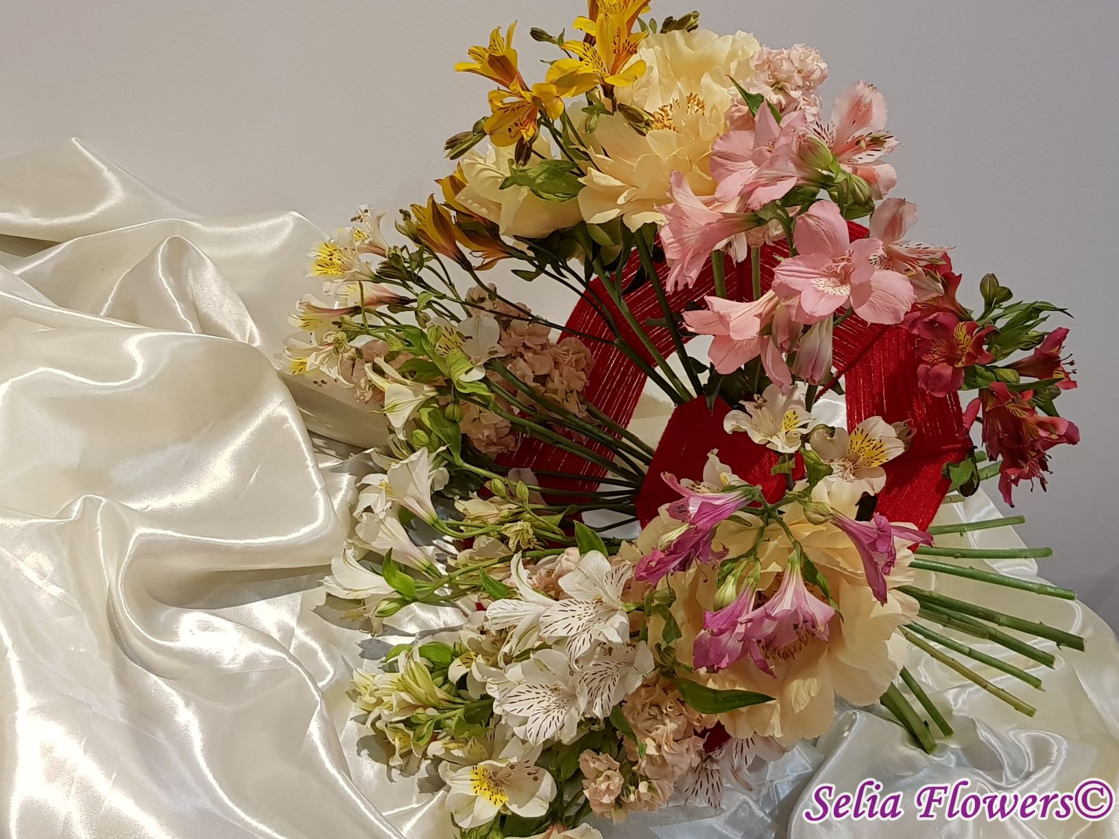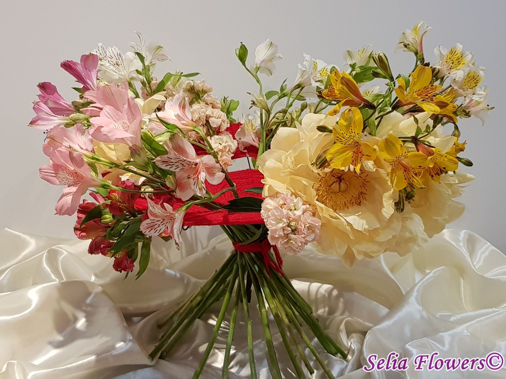 Un buchet elegant, vesel si parfumat, construit pe structura spider web din 15 fire de alstroemeria, bujori si mathiola.