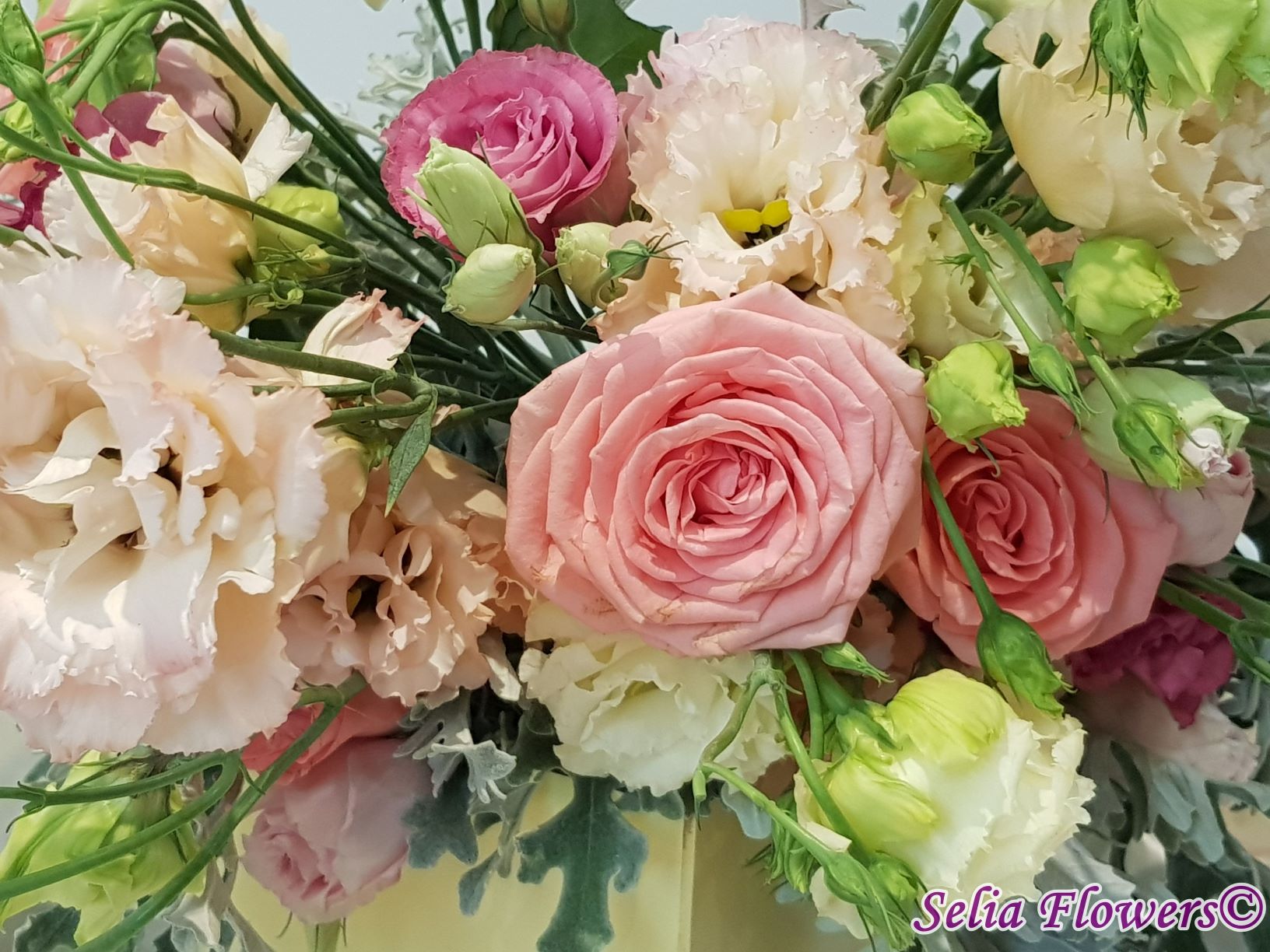 Pentru o persoana draga, un buchet vesel, in culorile verii, construit cu trandafiri si lisianthus in doua culori si finisat cu panglica din organza.