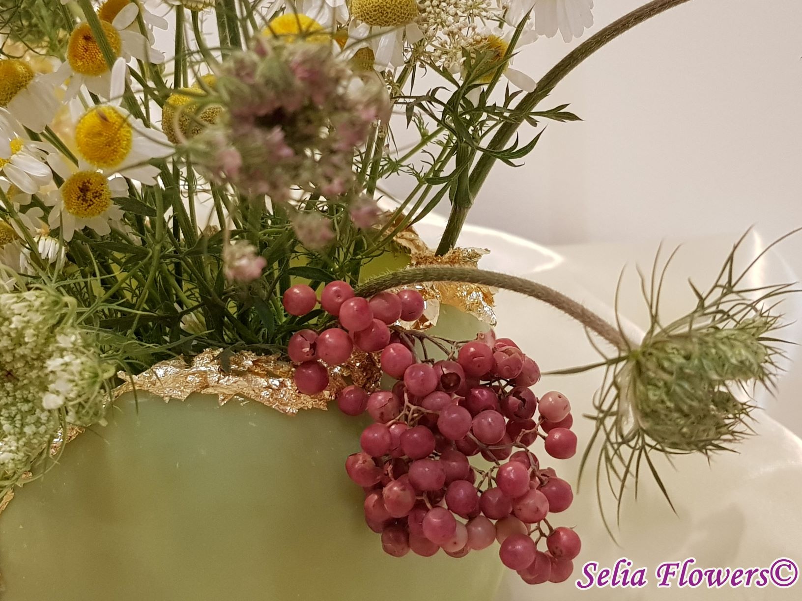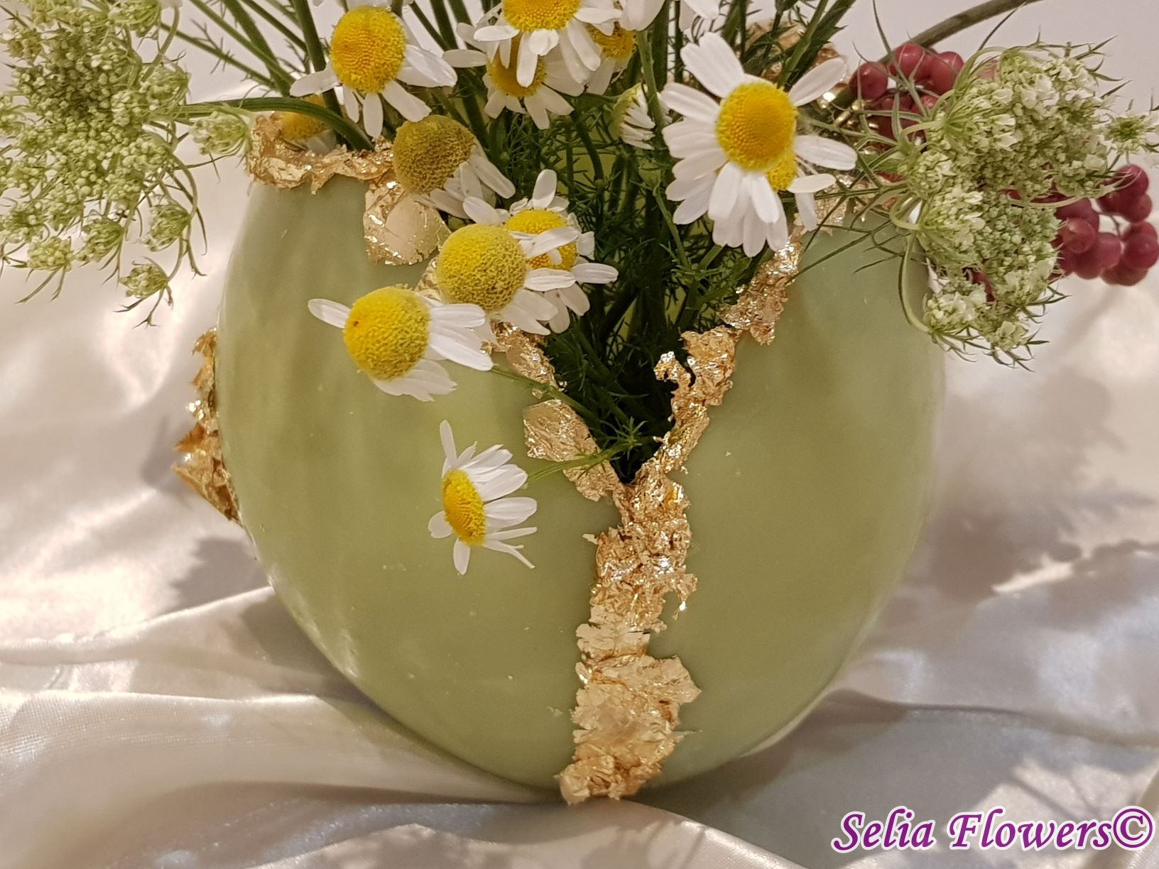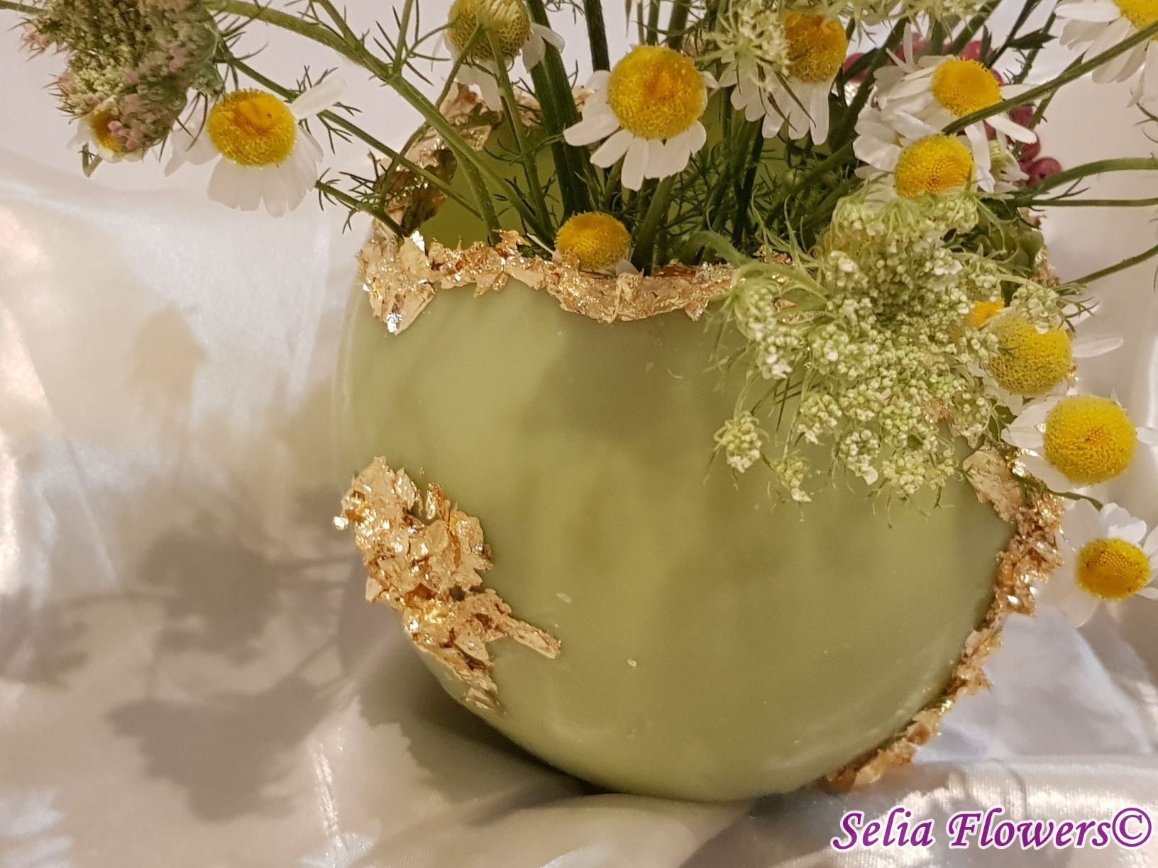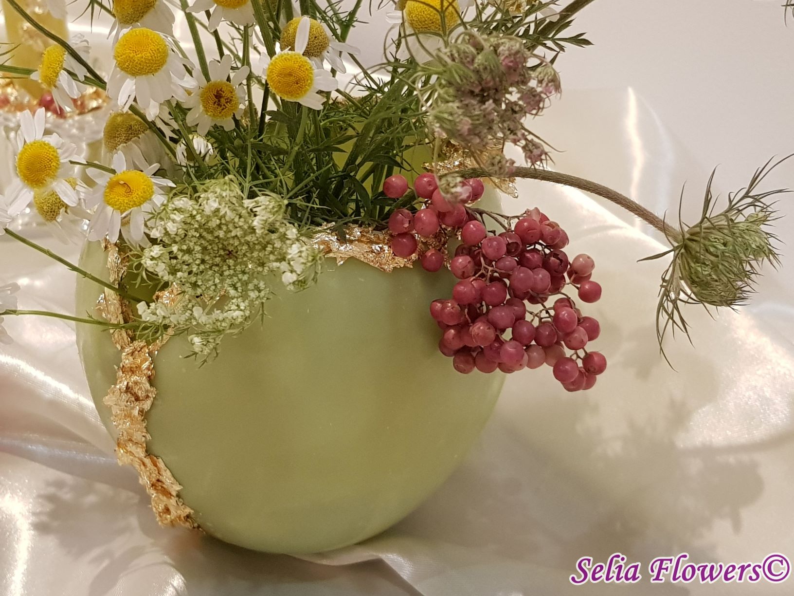 Un vas elegant pentru decorarea mesei, realizat din ceară și prevăzut cu inserție de fulgi din foiță de aur. Vasul este decorat cu flori naturale. Este un produs handmade realizat în atelierul floral Selia Flowers.