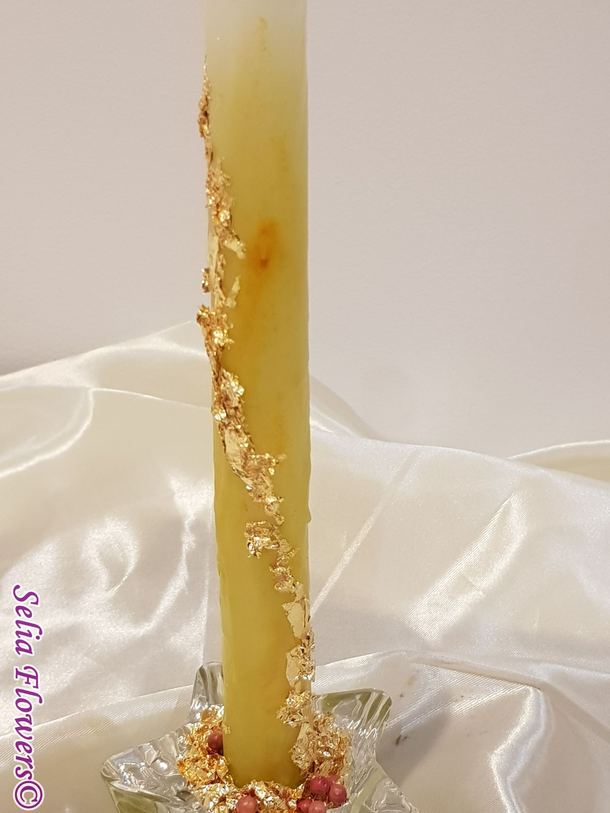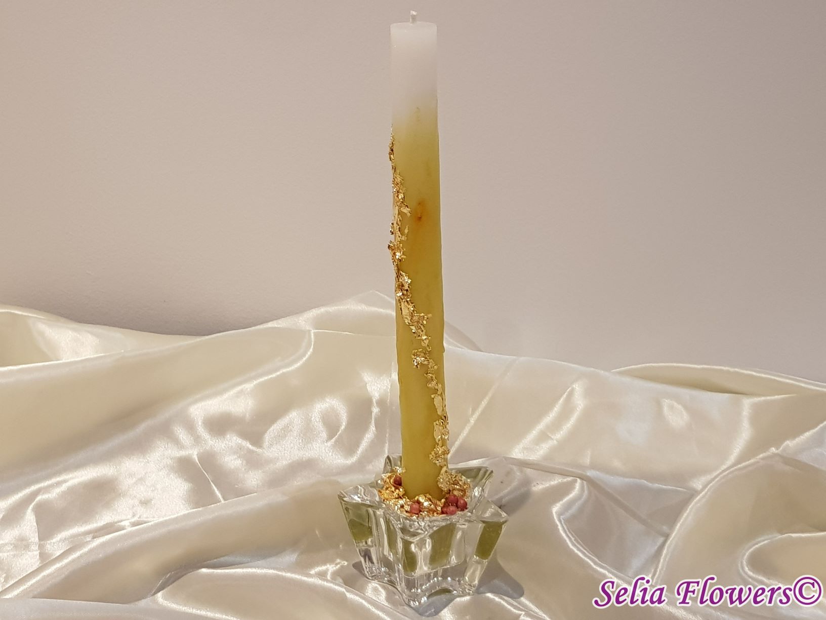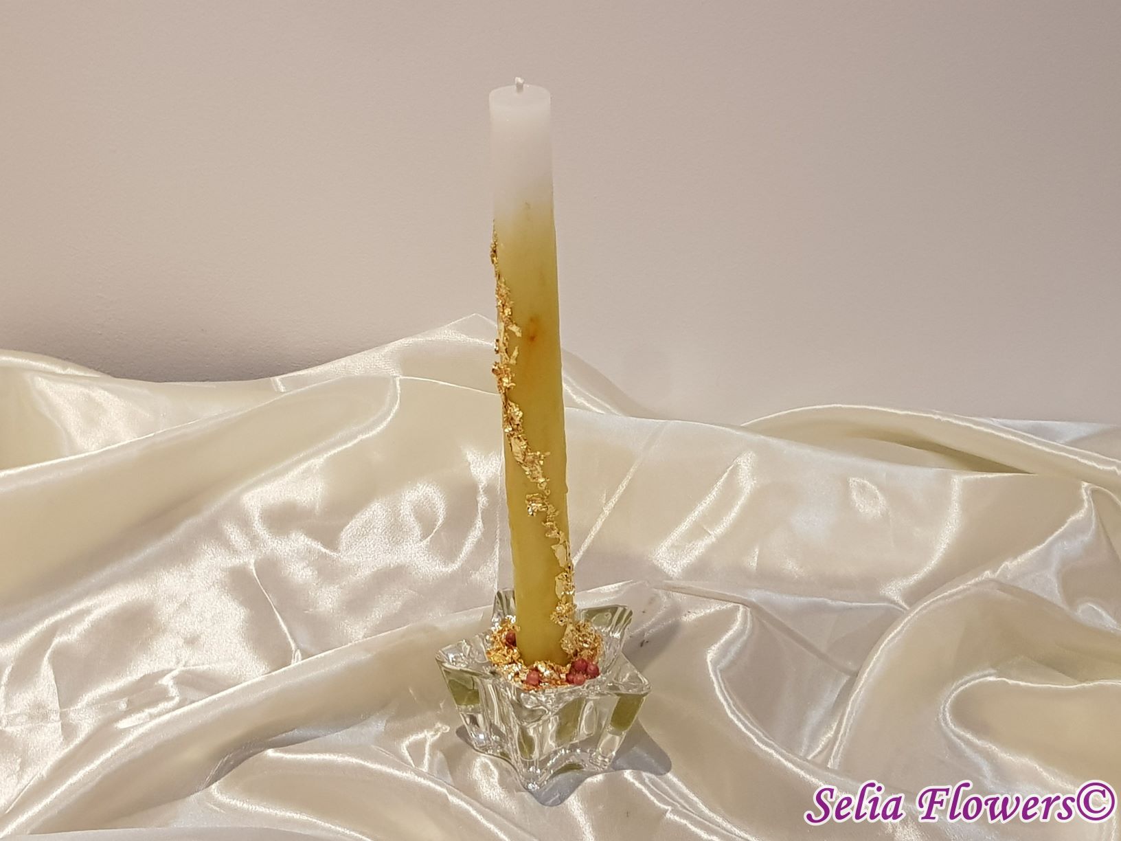 Un element de decor potrivit pentru o masa festivă sau o cină romantică. Lumânarea este prevazută cu inserție de fulgi din foiță de aur și pigment de culoare galbenă. Este un produs handmade realizat in atelierul floral Selia Flowers. Comanda minimă este de două bucăți. Suportul nu este inclus în preț și se poate achiziona doar la cerere, contra cost.