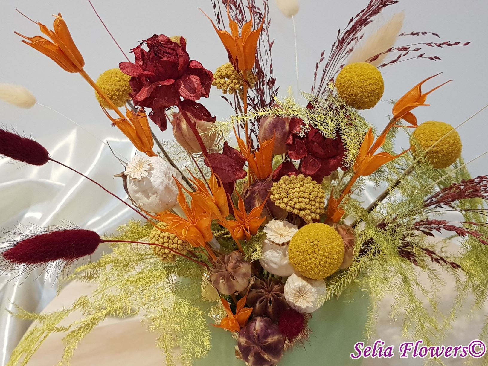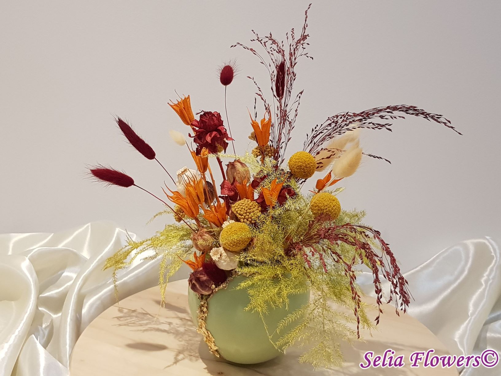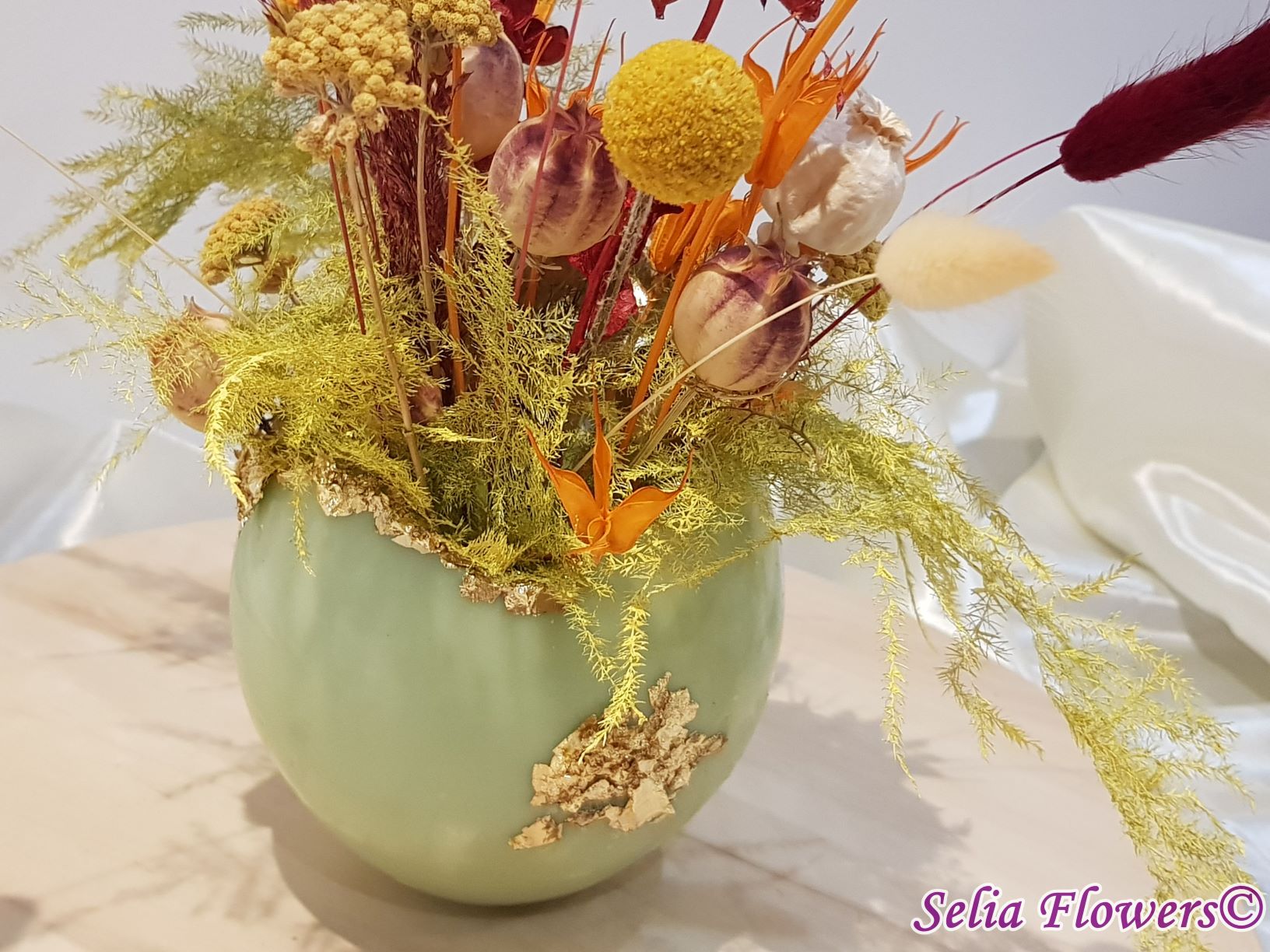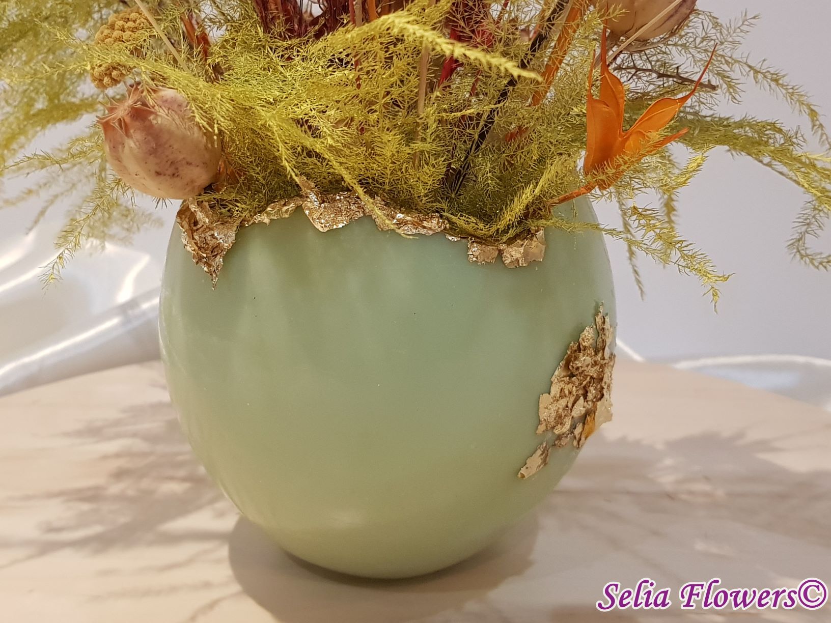 Un vas elegant pentru decorarea mesei, realizat din ceară și prevăzut cu inserție de fulgi din foiță de aur. Vasul este decorat cu flori naturale. Este un produs handmade realizat în atelierul nostru floral.