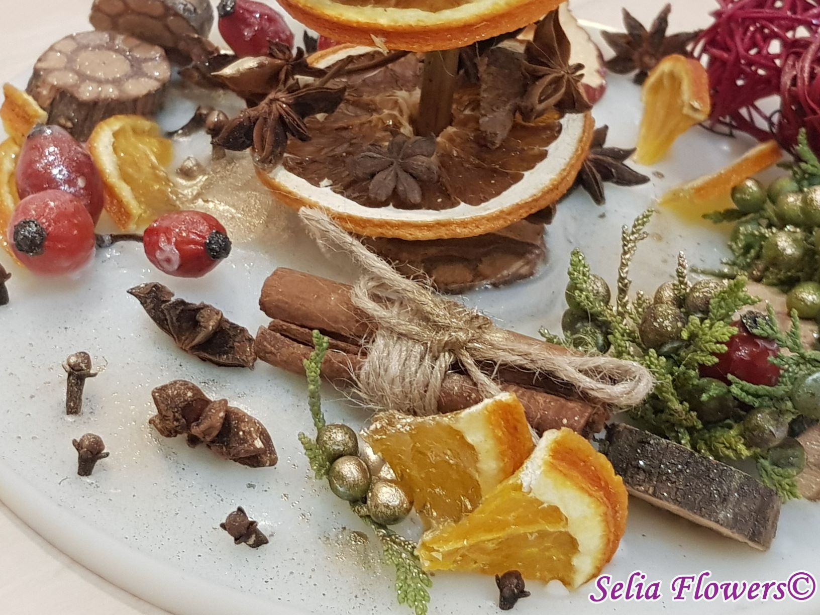 Diametrul aranjamentului este de 25-26 cm si este un produs handmade realizat din ceară in atelierul nostru floral. Este decorat cu bradut construit cu felii de fructe deshidratate (grapefruit, portocala, lamaie, mar), elemente aromatice (scortisoara, anason, cuisoare), crengute de brad, macese si accesorii de sezon.