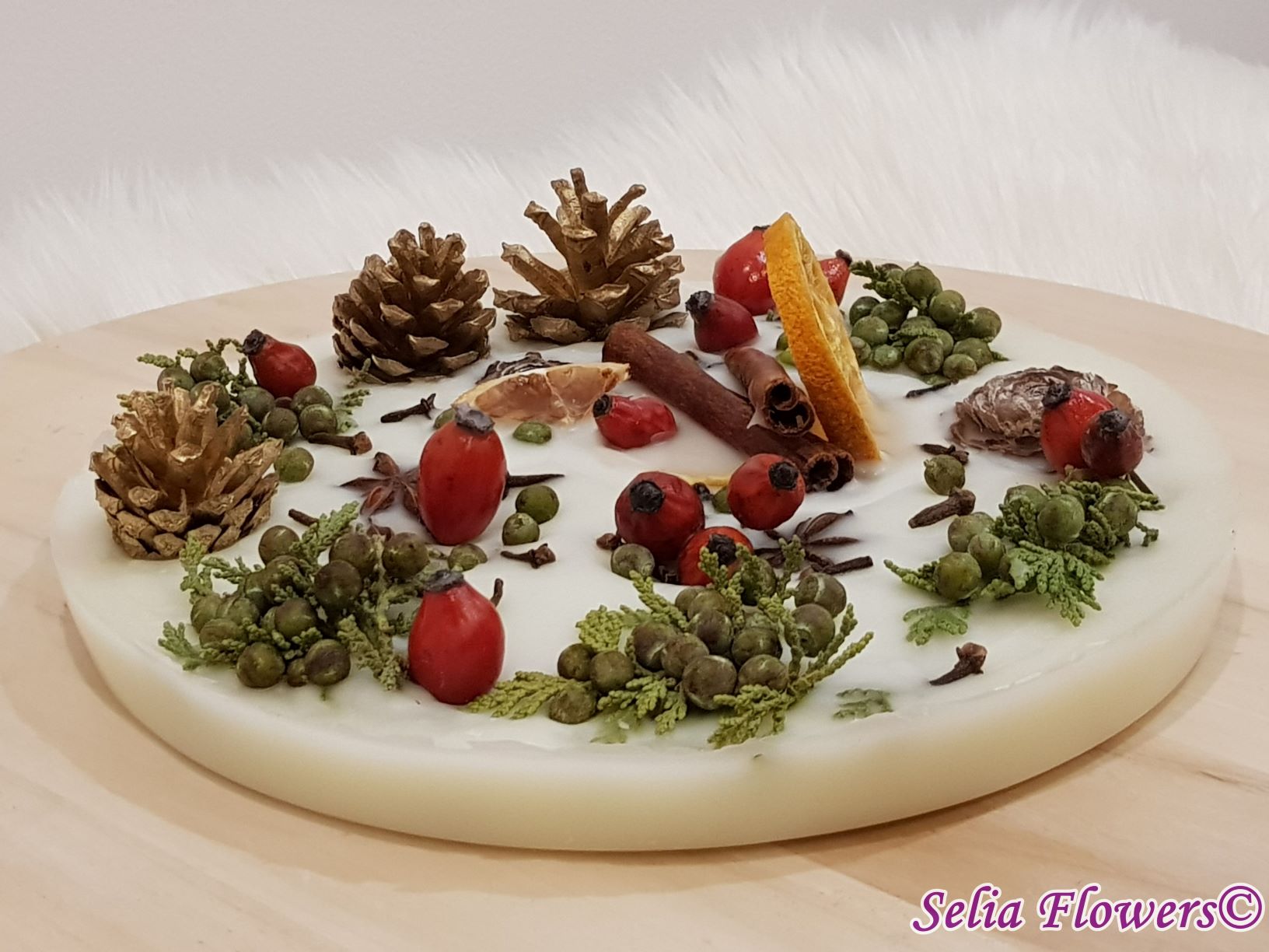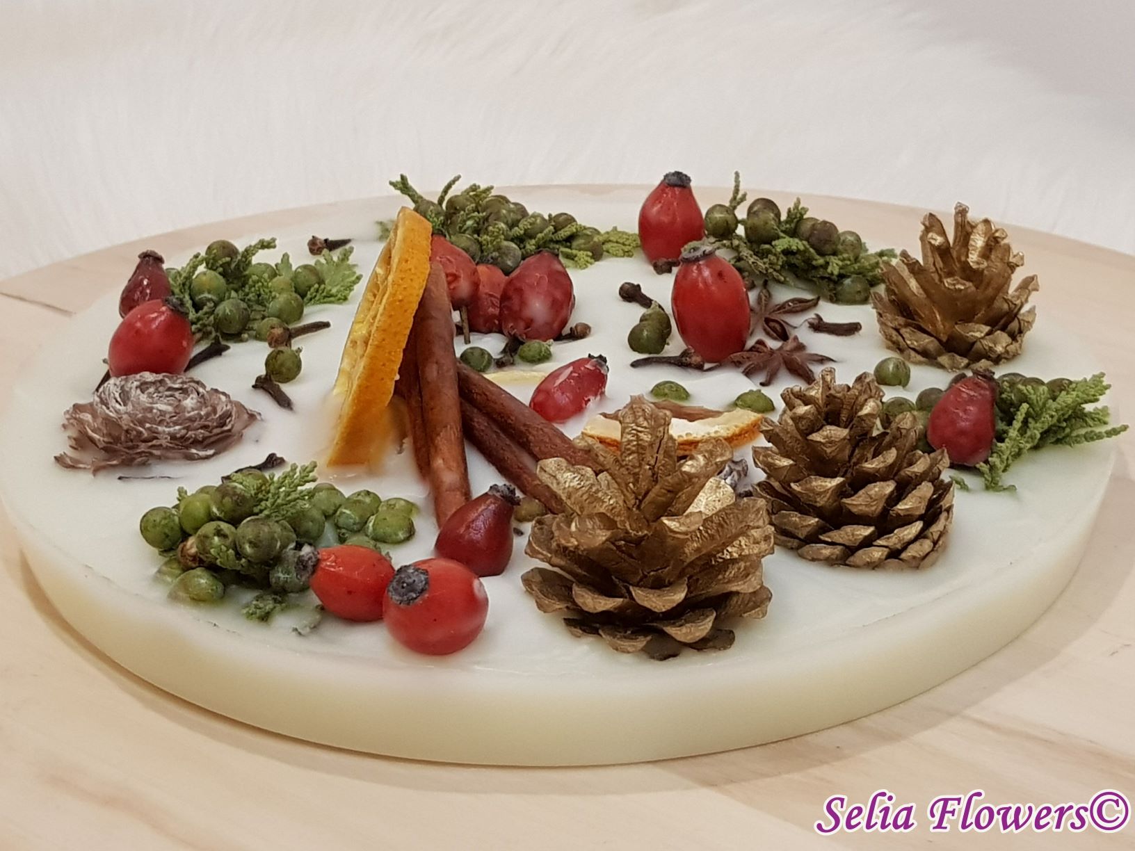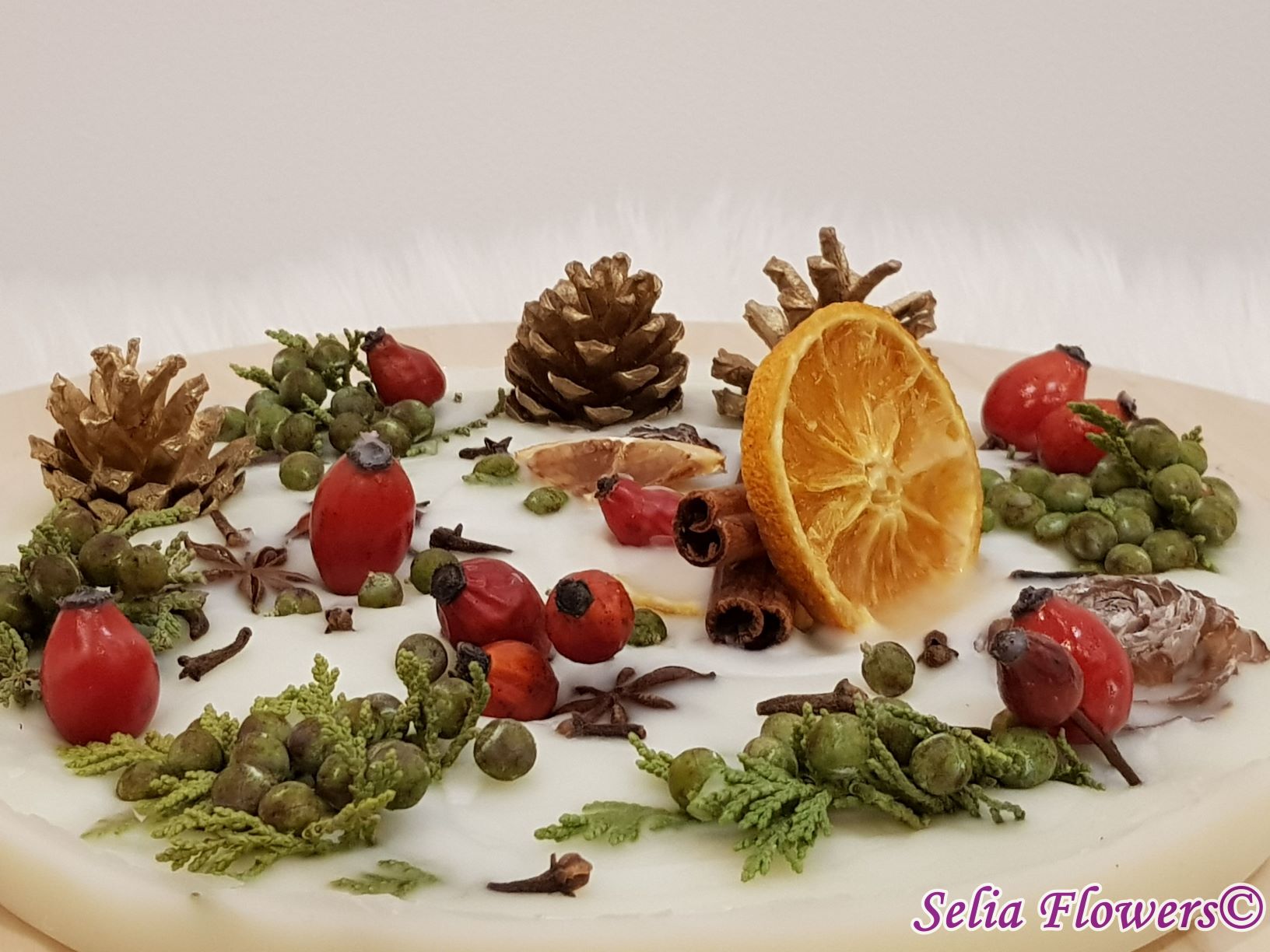 Magie cu miros de sarbatori într-un aranjament cu ceara si elemente decorative aromatice. Este un aranjament unicat si special care aduce Magia si Spiritul Craciunului in casa ta, o idee originala de decor pentru casa in perioada sarbatorilor de iarna.