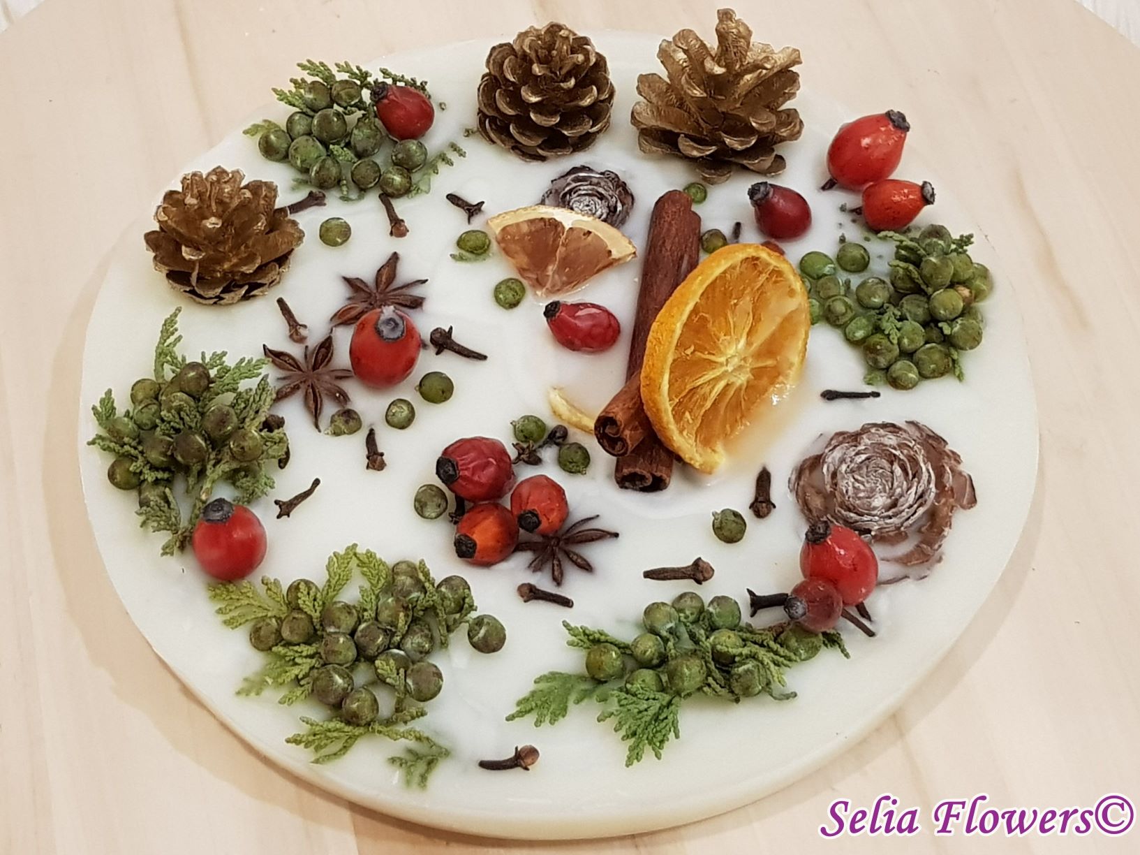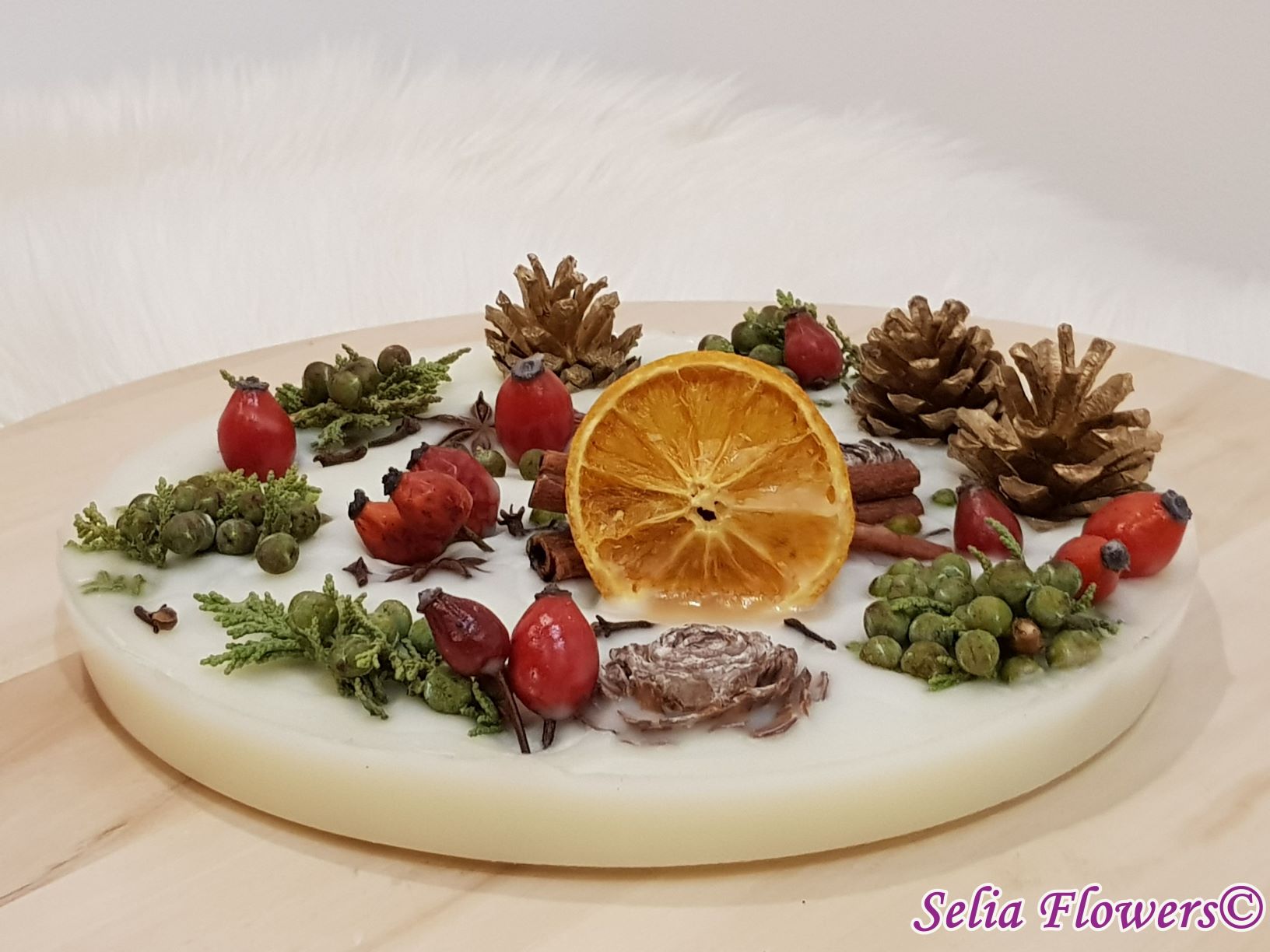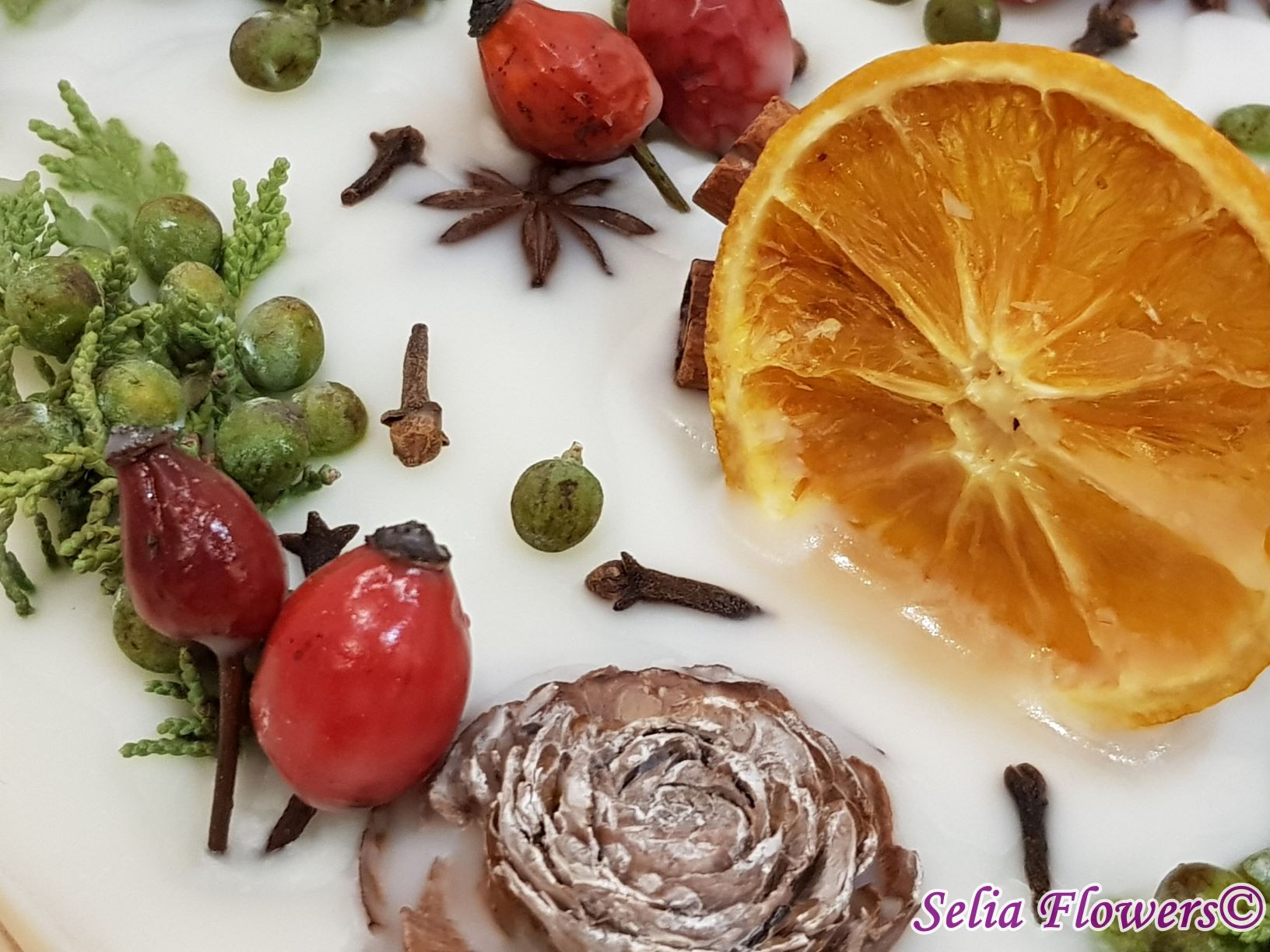Magie cu miros de sarbatori într-un aranjament cu ceara si elemente decorative aromatice. Este un aranjament unicat si special care aduce Magia si Spiritul Craciunului in casa ta, o idee originala de decor pentru casa in perioada sarbatorilor de iarna.