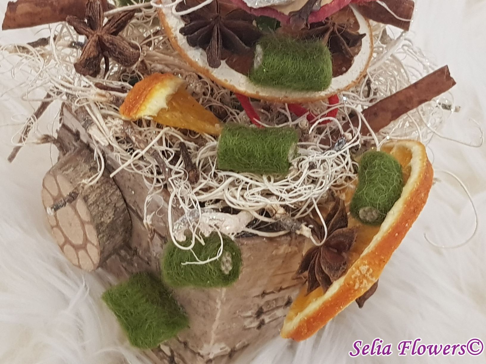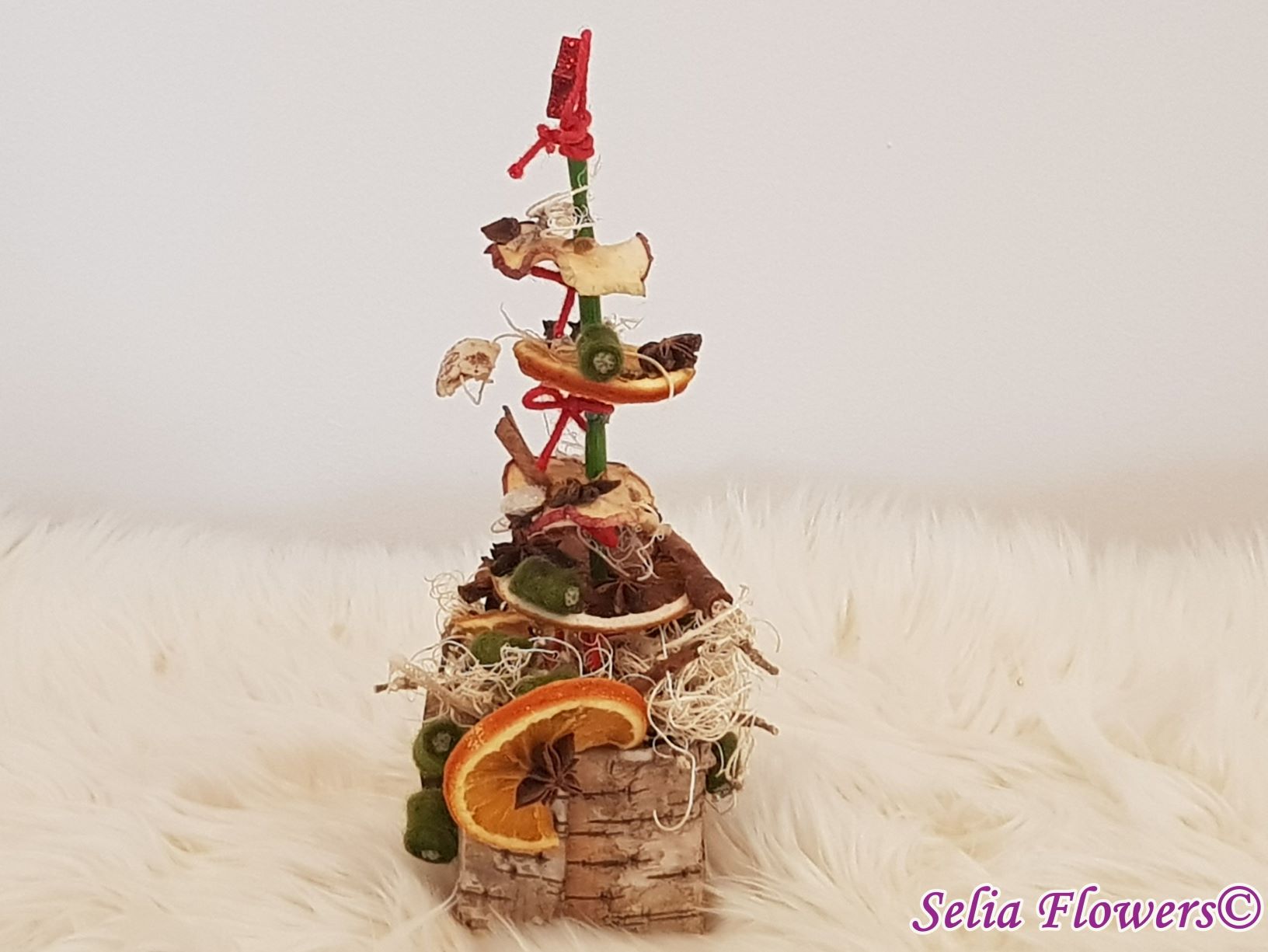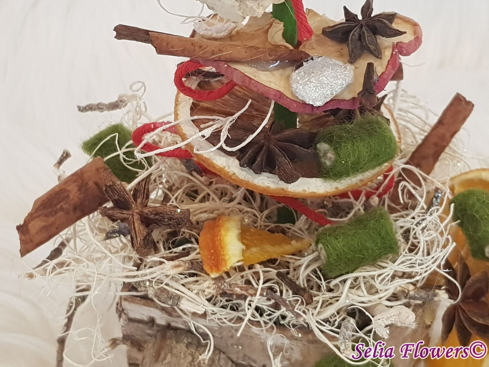 Un bradut cu miresme de Craciun, un aranjament unicat construit in cub de mesteacan cu latura de 7cm, din felii de fructe deshidratate (grapefruit, portocala, lamaie, mar). Este decorat cu elemente decorative aromatice (scortisoara, anason, cuisoare), muschi uscat cret de culoare alba, accesorii din lana. Inaltimea aranjamentului este de 27 cm, din care 20 cm este cea a bradutului construit.