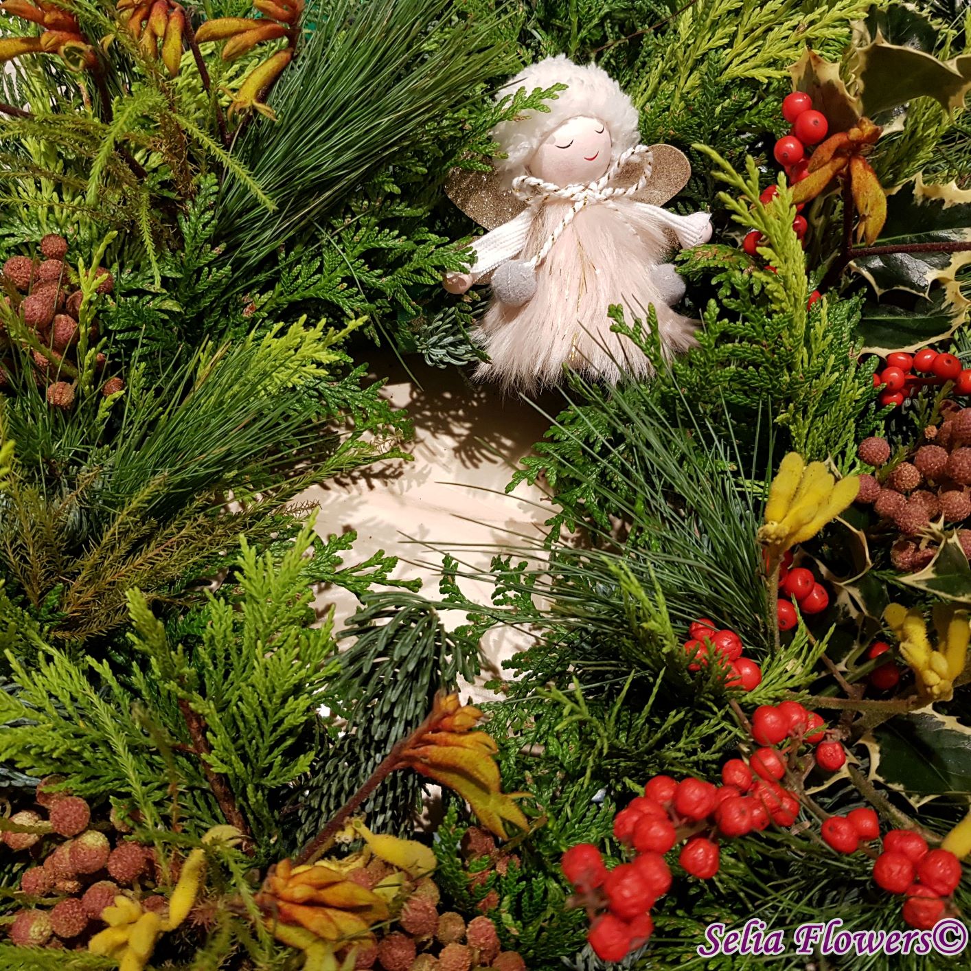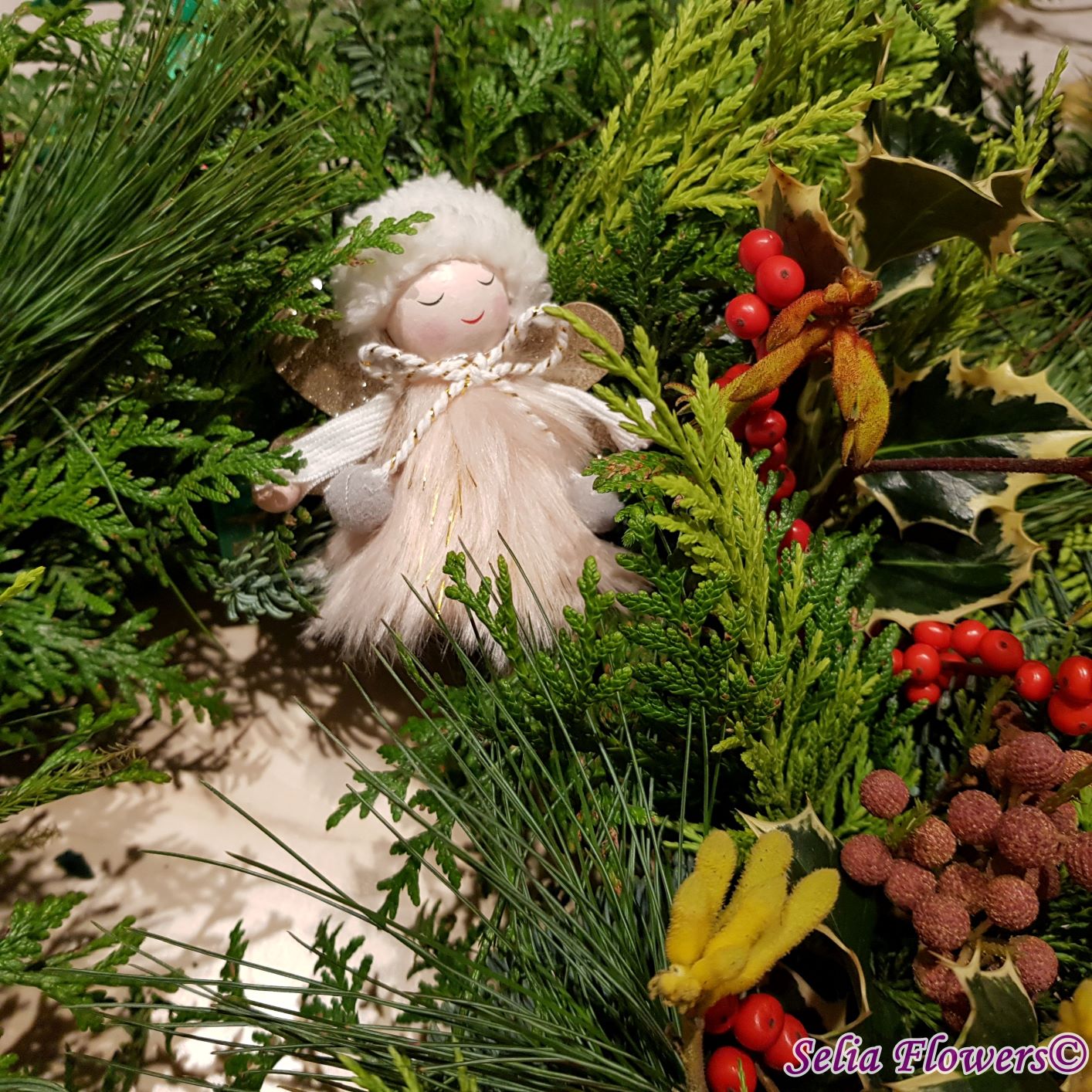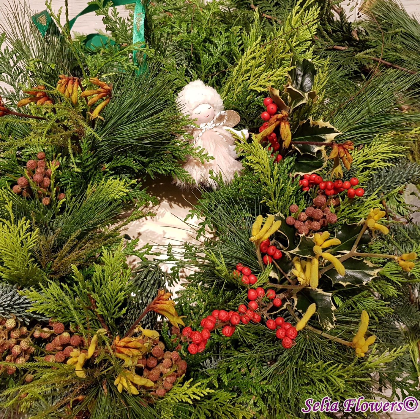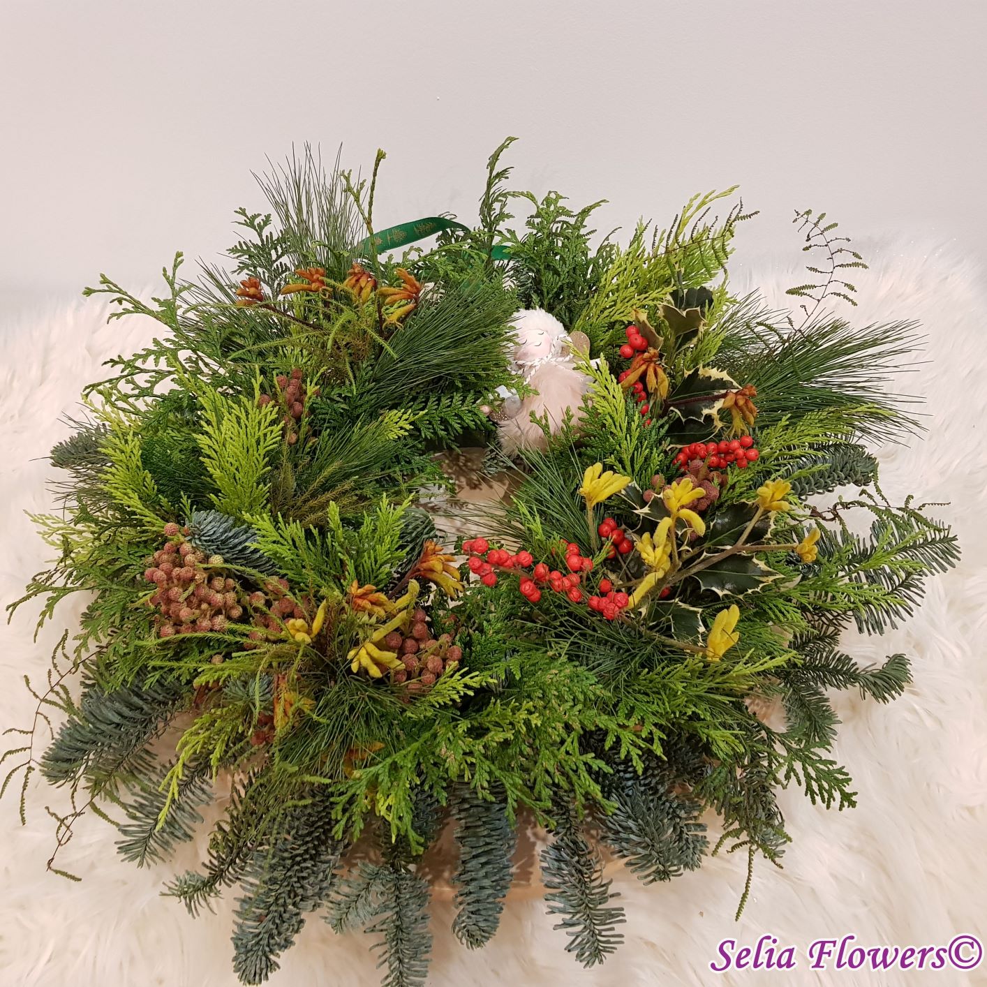 Coronița este construită pe burete floral Oasis, exclusiv din elemente naturale: mix de conifere (brad natural argintiu, tuia și pin), berzelia, ilex , anigozanthos și koralfern. Diametrul coronitei este de 45-48 cm.