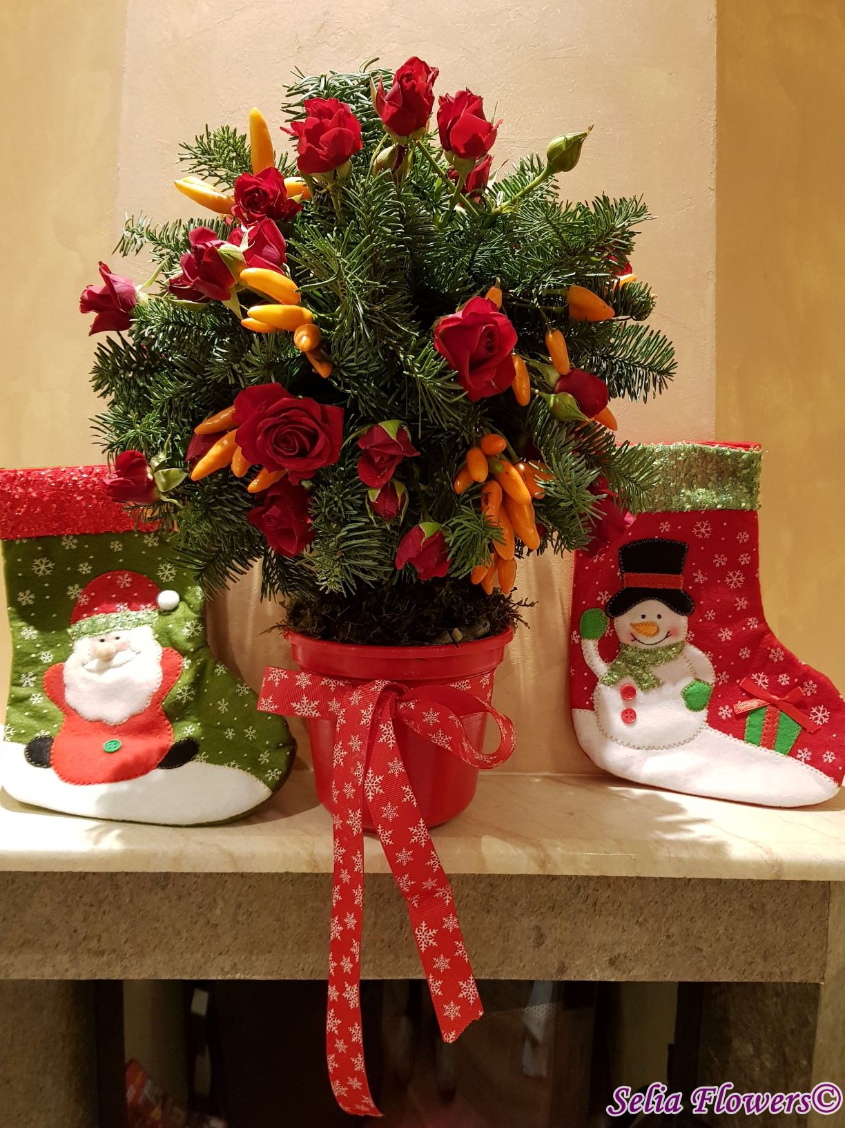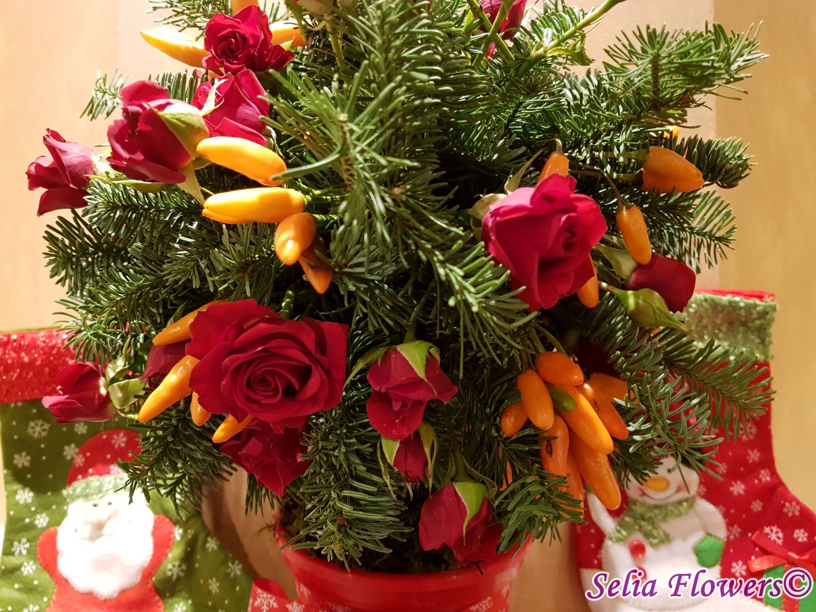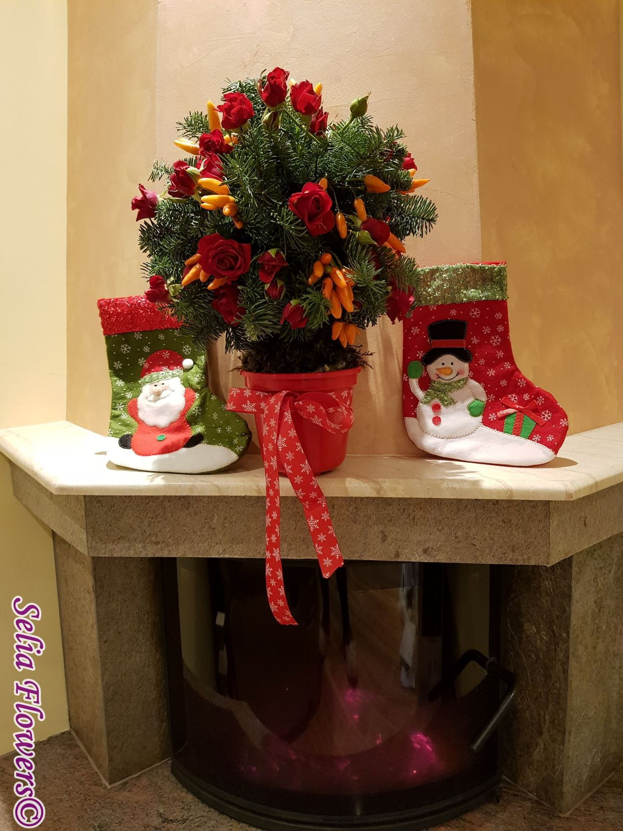Un brăduț handmade din brad Nobilis, miniroze și ardei decorativ, construit pe suport de burete umed în formă de sferă care asigură hidratarea plantelor.