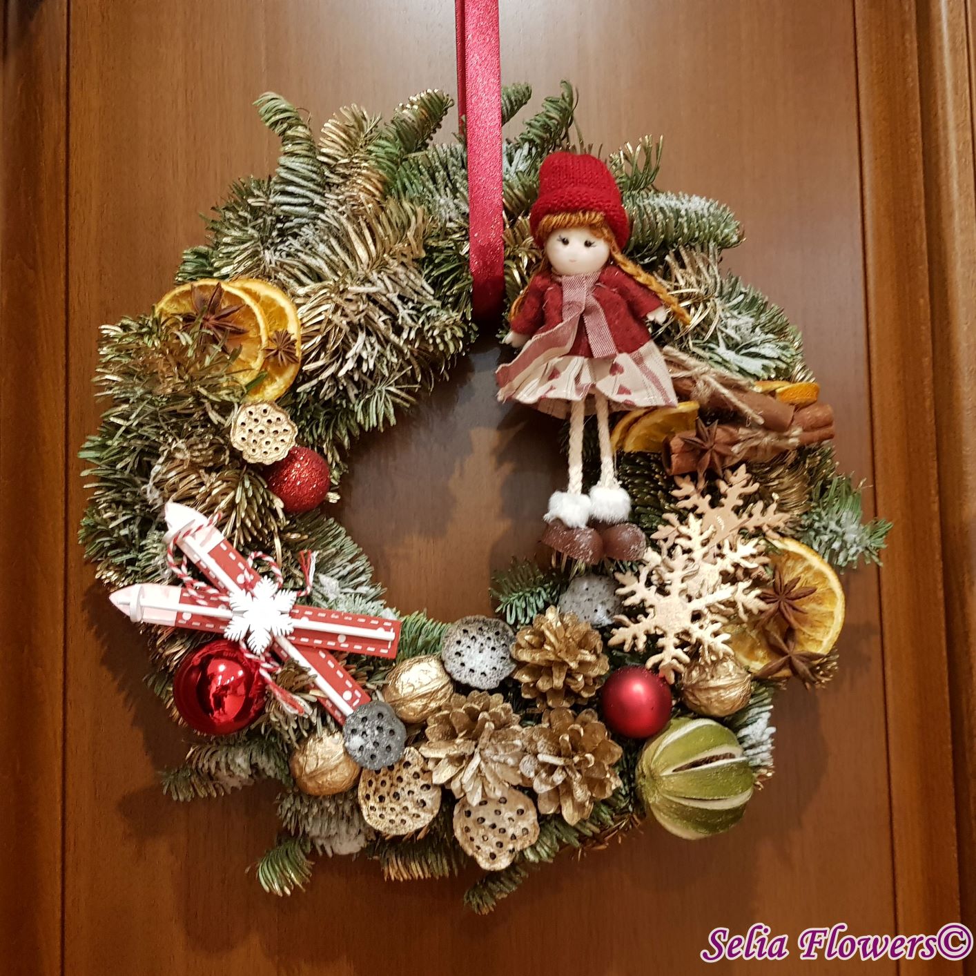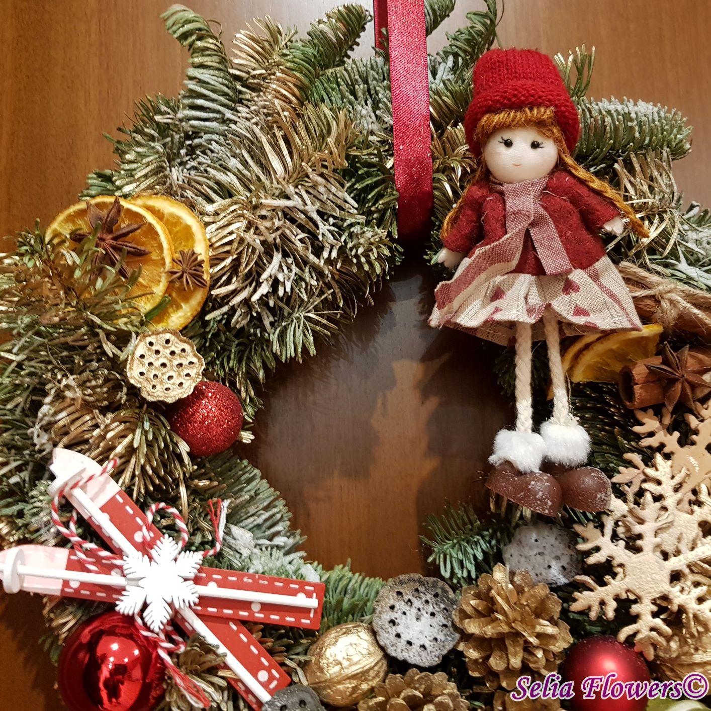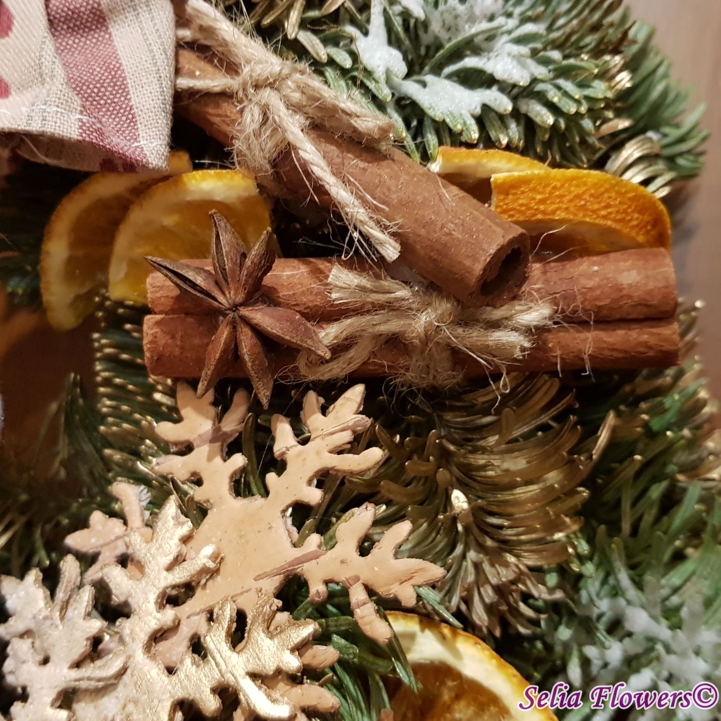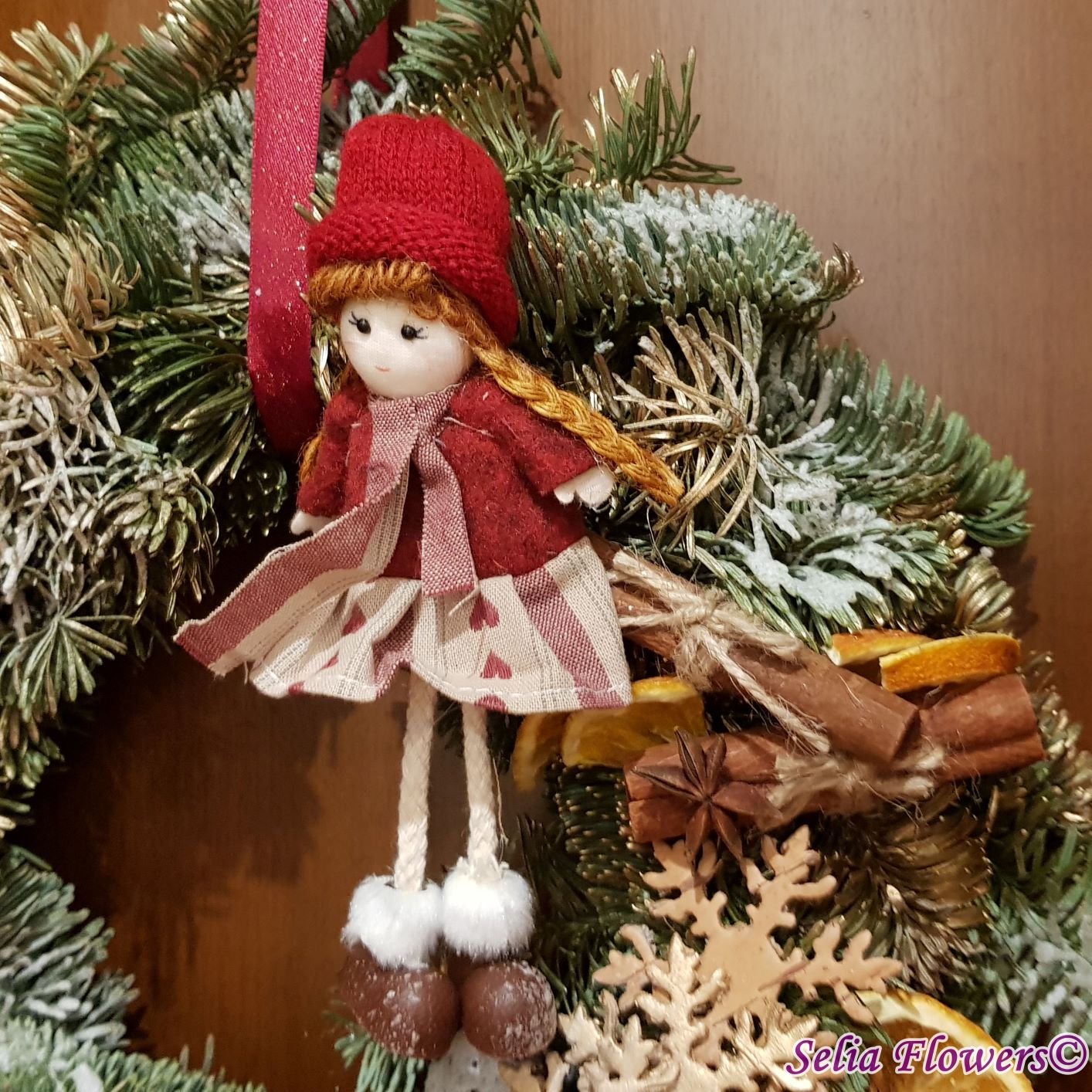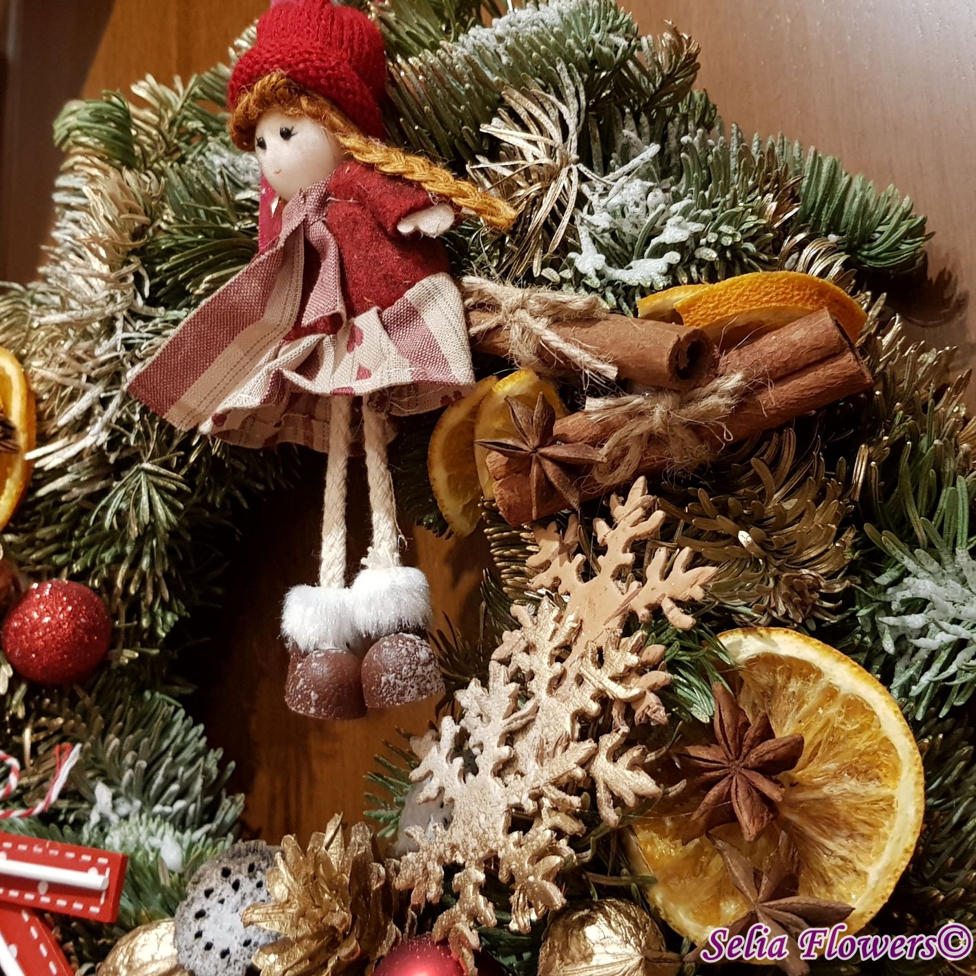Coronița este construită din crenguțe de brad nobilis blue, elemente decorative aromate ( batoane de scorțișoară, lime, felii deshidratate de portocală, anason). Este accesorizată cu decorațiune fetiță nuci, conuri și accesorii de sezon. Diametrul coroniței este de 32-35 cm.