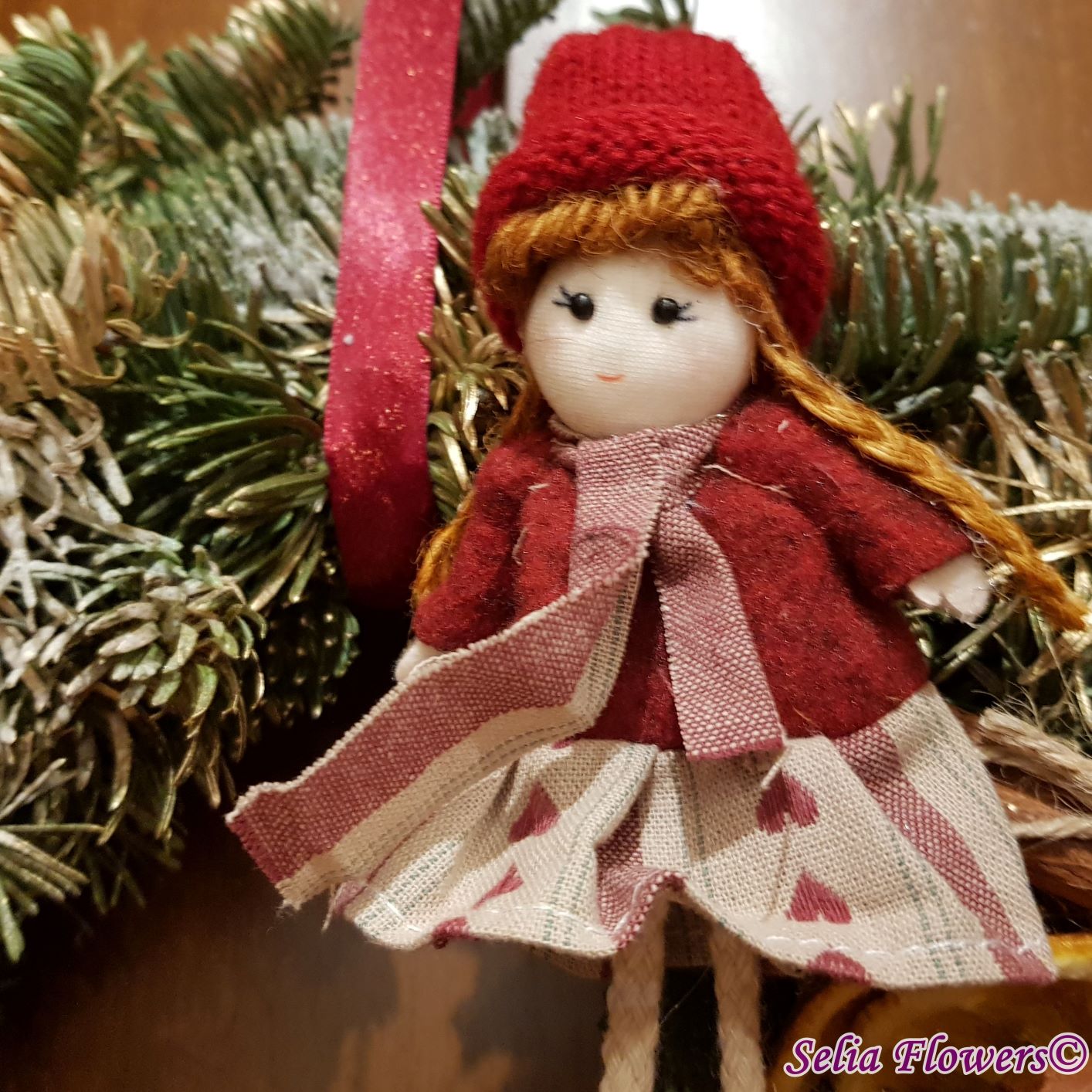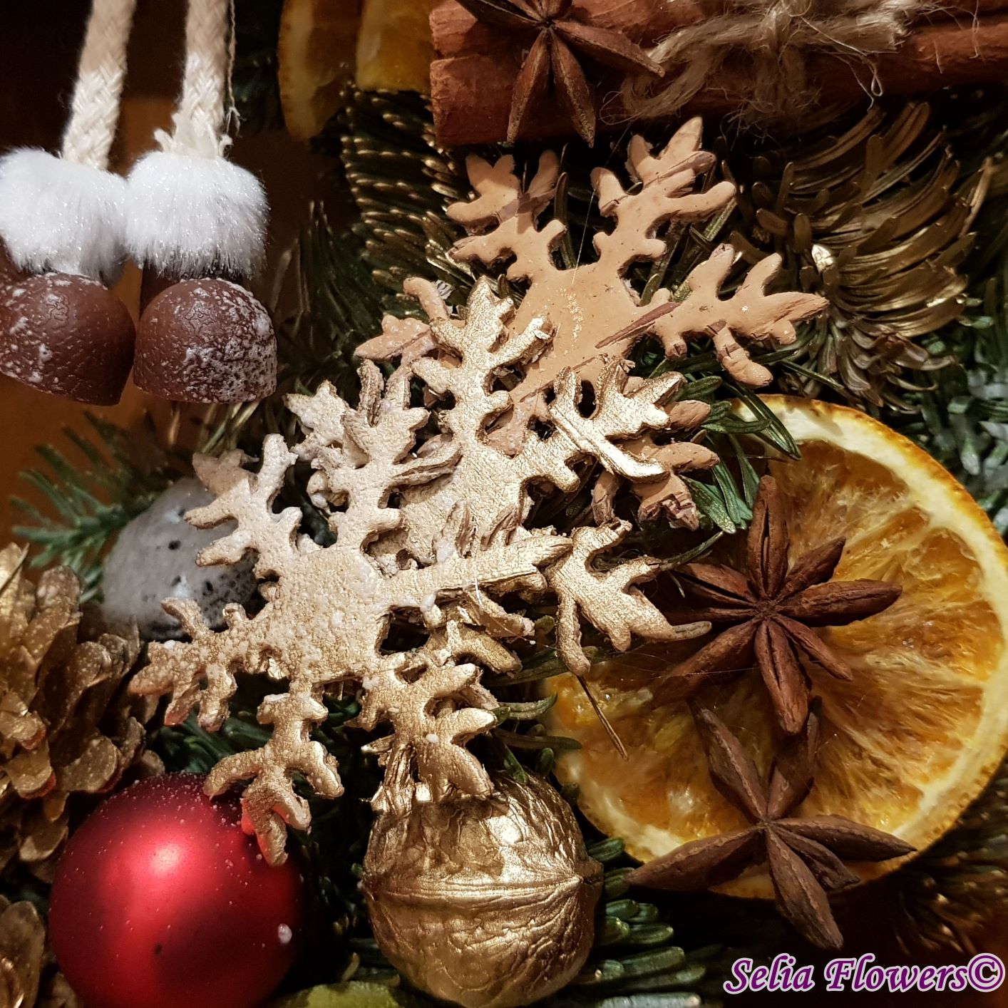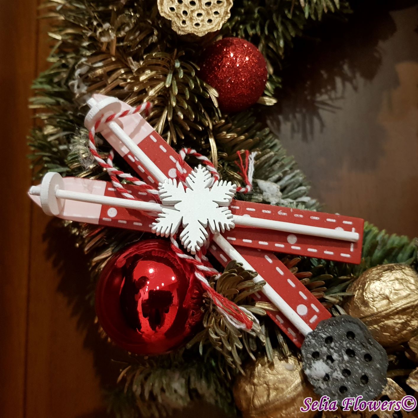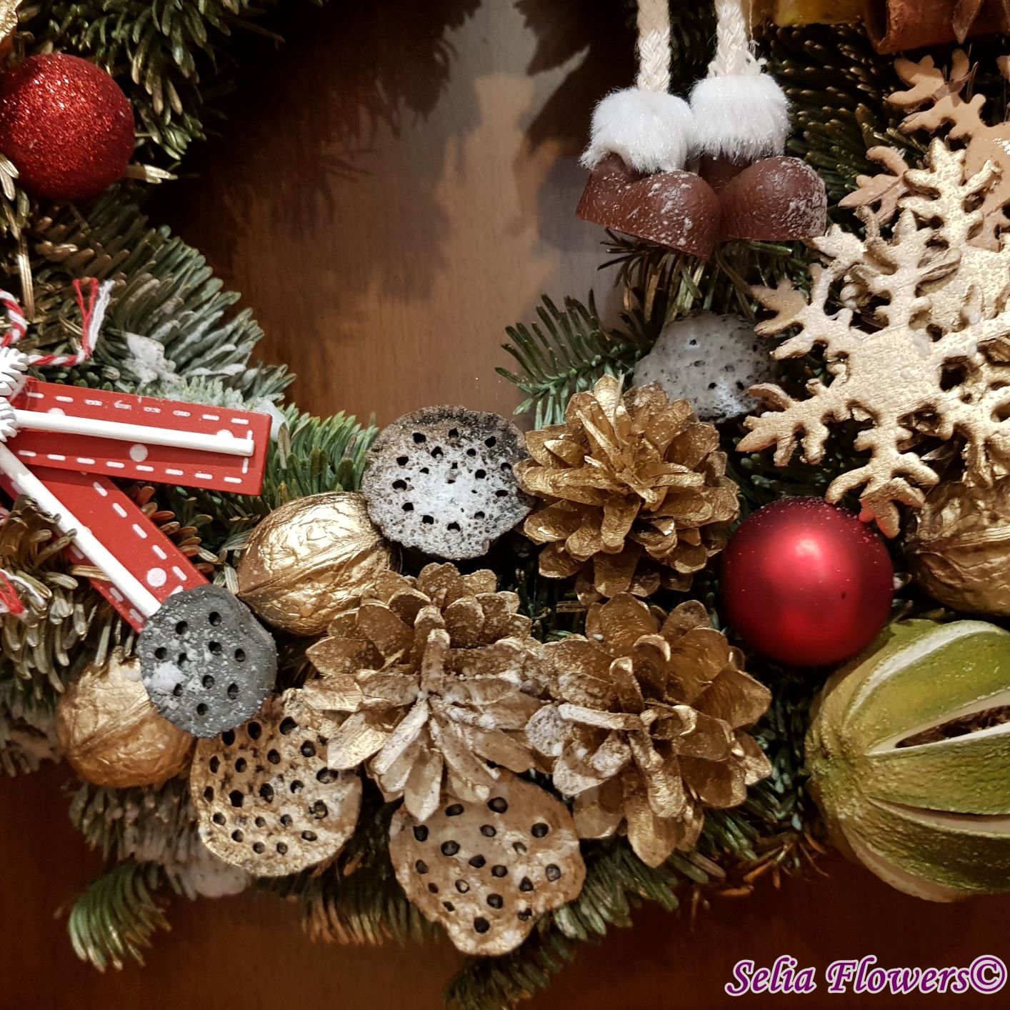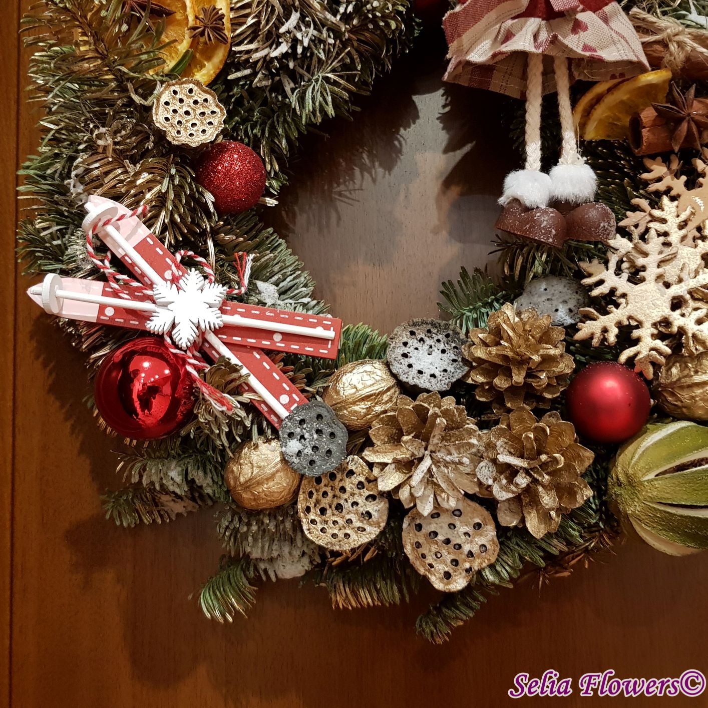 Coronița este construită din crenguțe de brad nobilis blue, elemente decorative aromate ( batoane de scorțișoară, lime, felii deshidratate de portocală, anason). Este accesorizată cu decorațiune fetiță nuci, conuri și accesorii de sezon. Diametrul coroniței este de 32-35 cm.