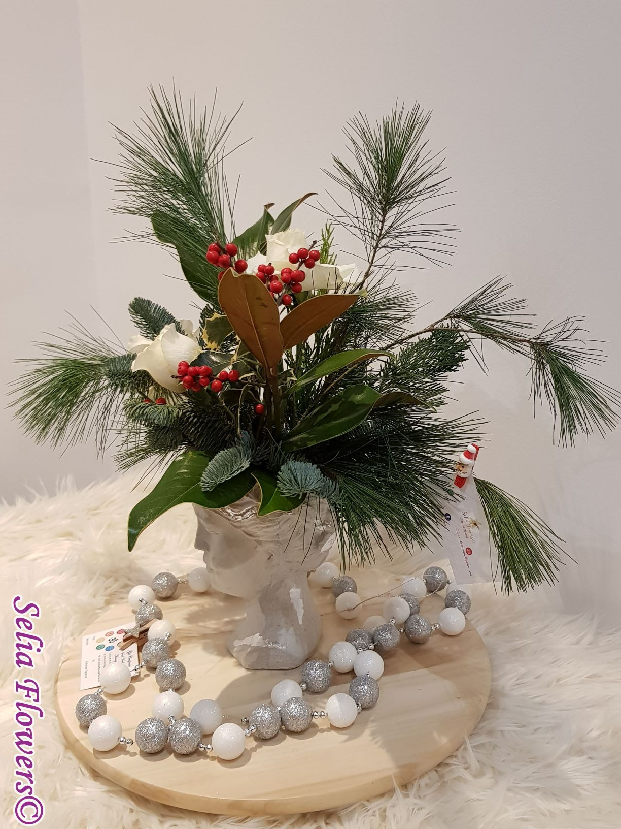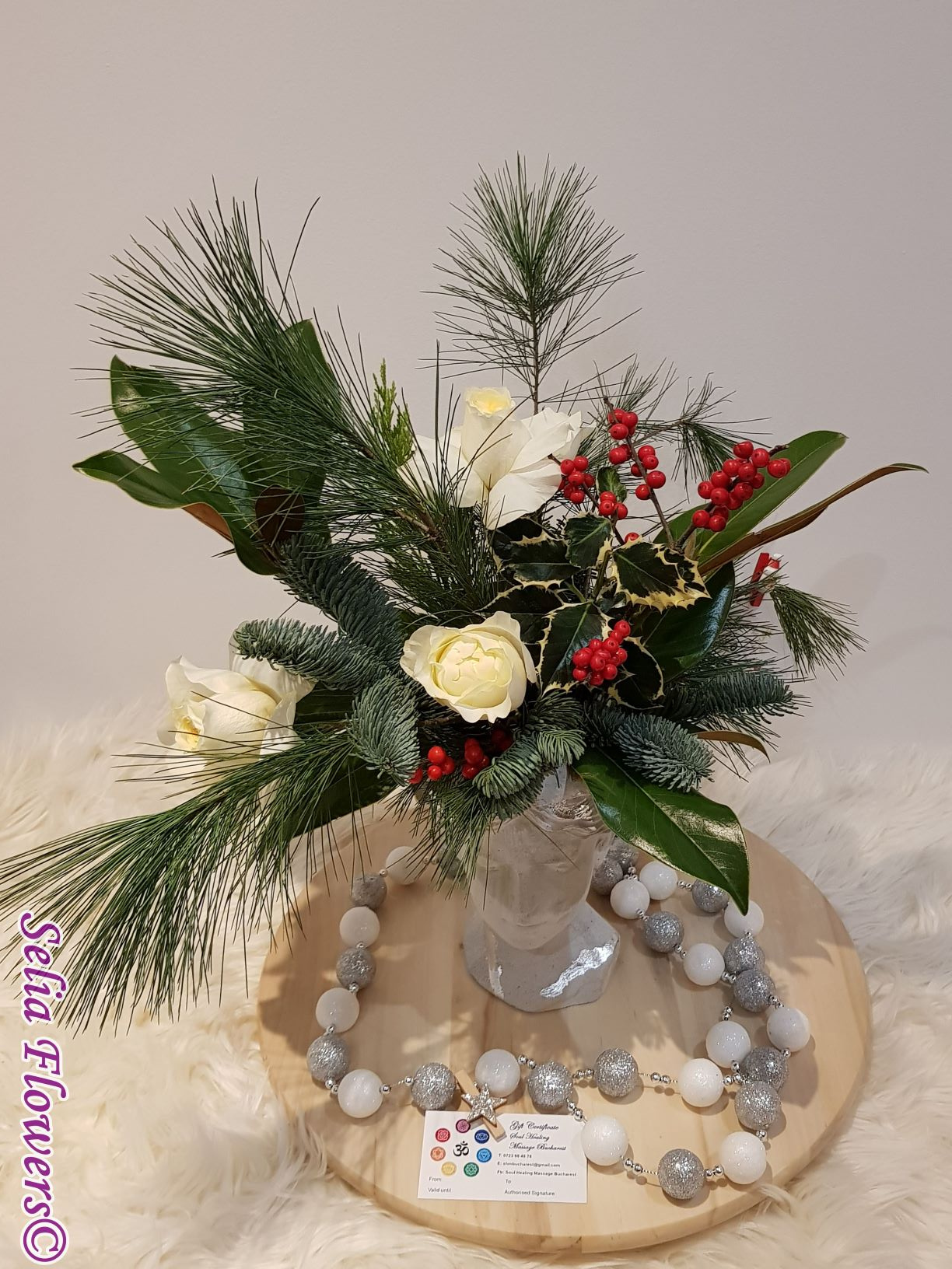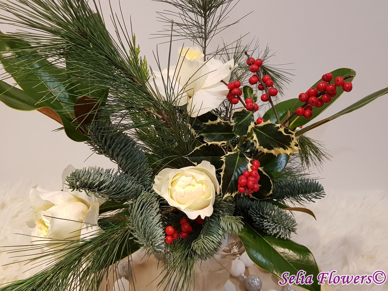 Aranjament în vas Venus, construit în suport de burete umed, cu: trandafiri, crenguțe de ilex, crenguțe de magnolia și mix de conifere.