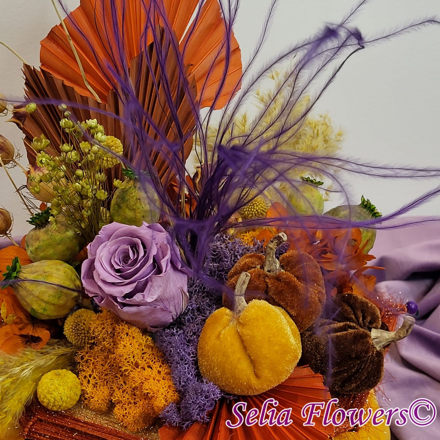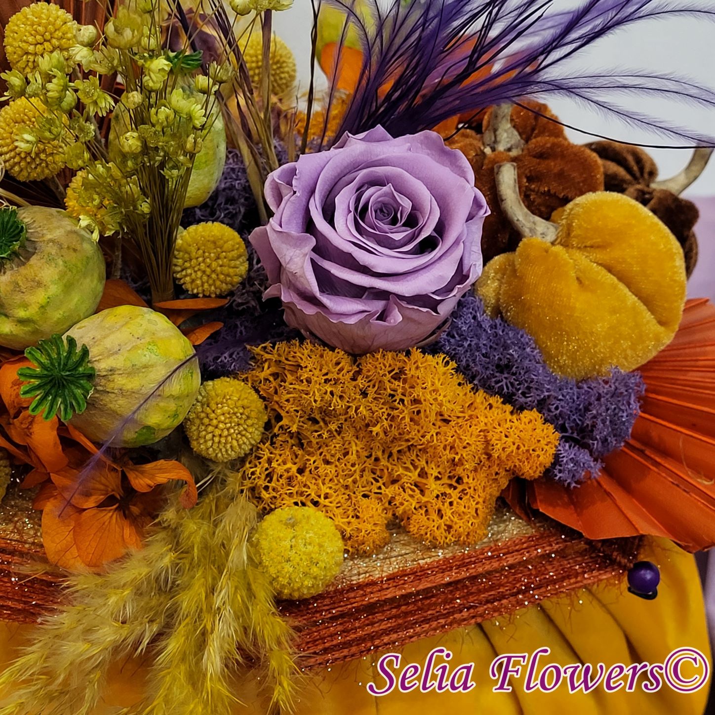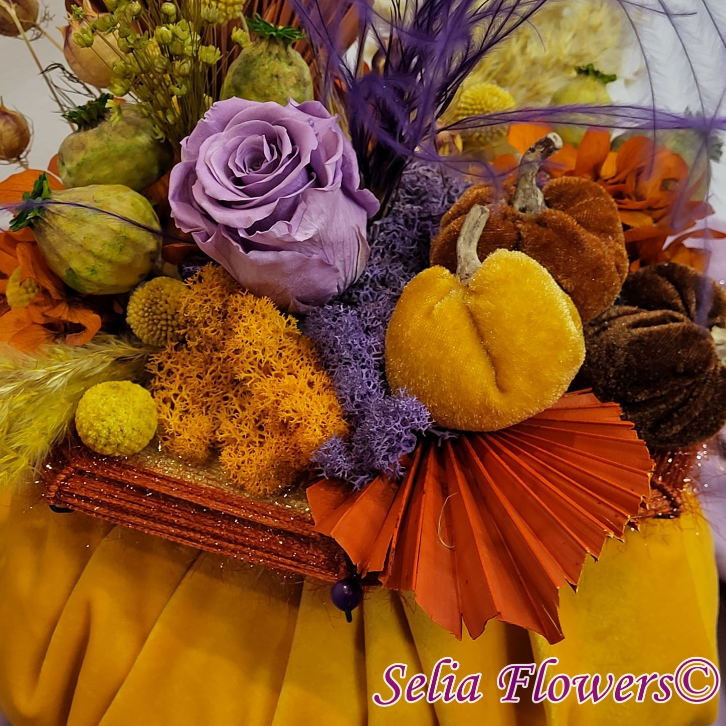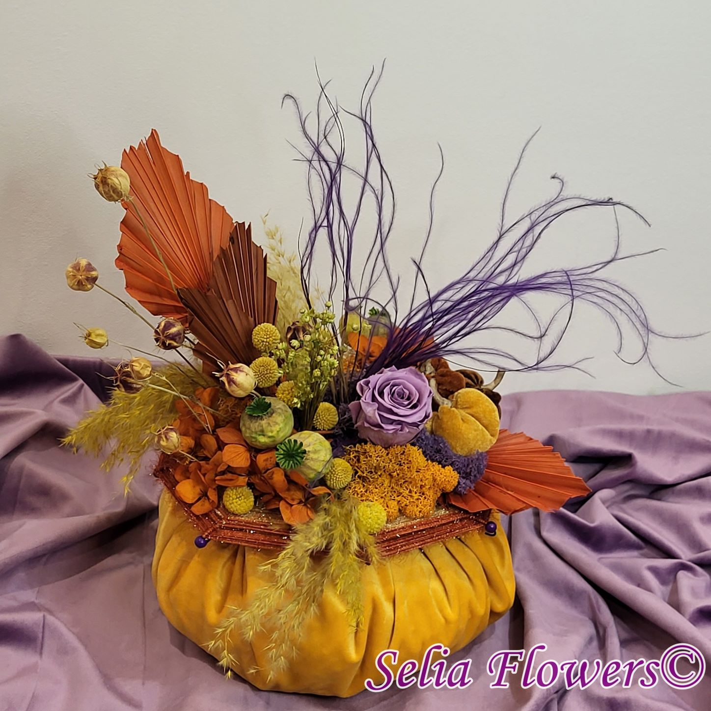 Un dovleac handmade, realizat în cromatica toamnei. Are o structură spiderweb construită și este decorat cu flori naturale permanente: hortensie și trandafir criogenate, craspedia, stipa, nigella, capsule de mac și iarbă de pampas. Este accesorizat cu licheni naturali stabilizati, minidovleci din material textil și frunze de palmier.