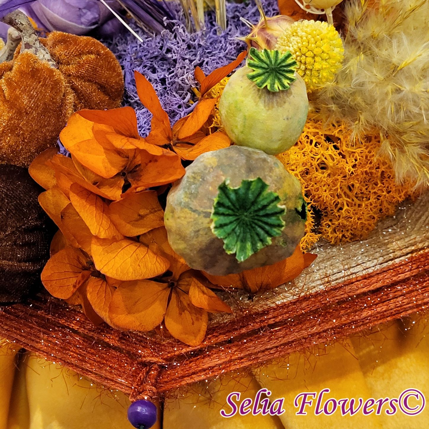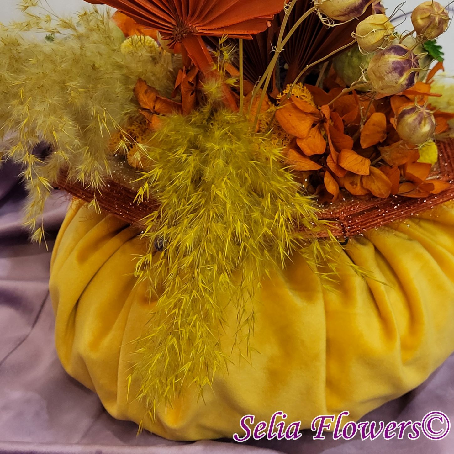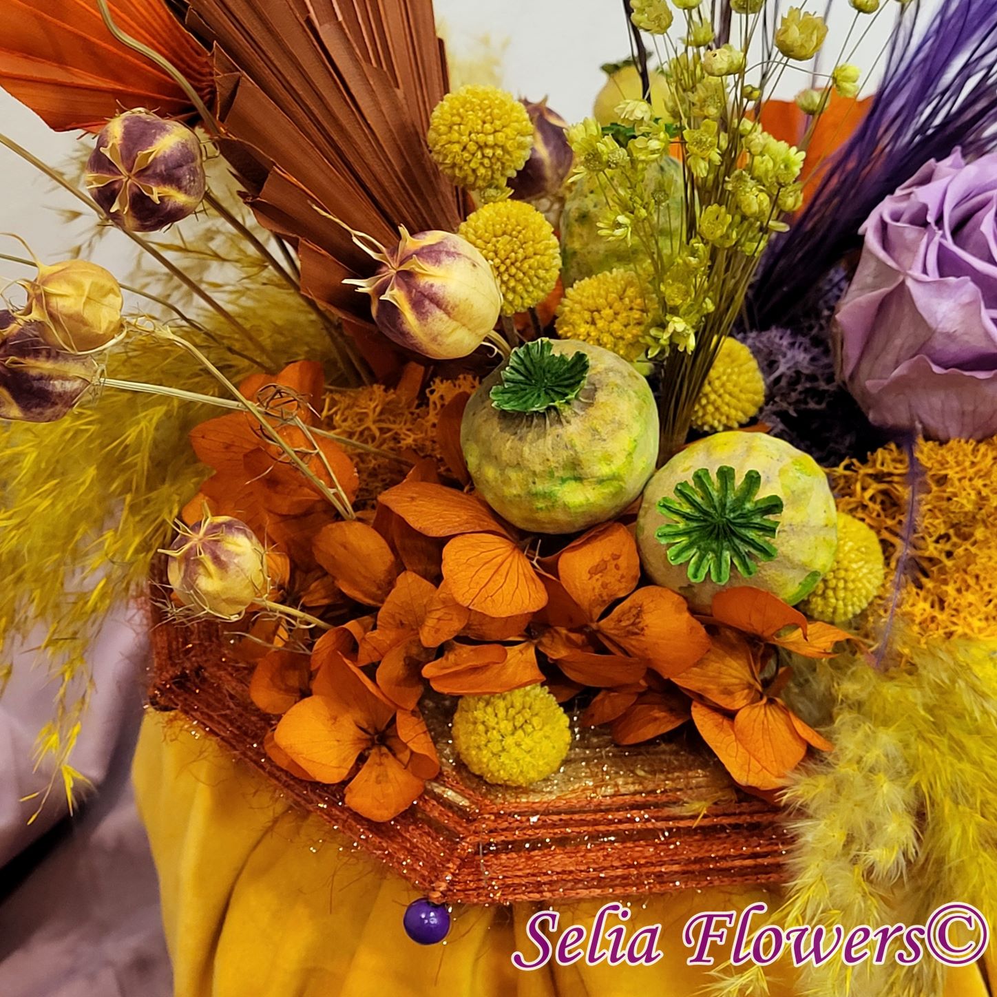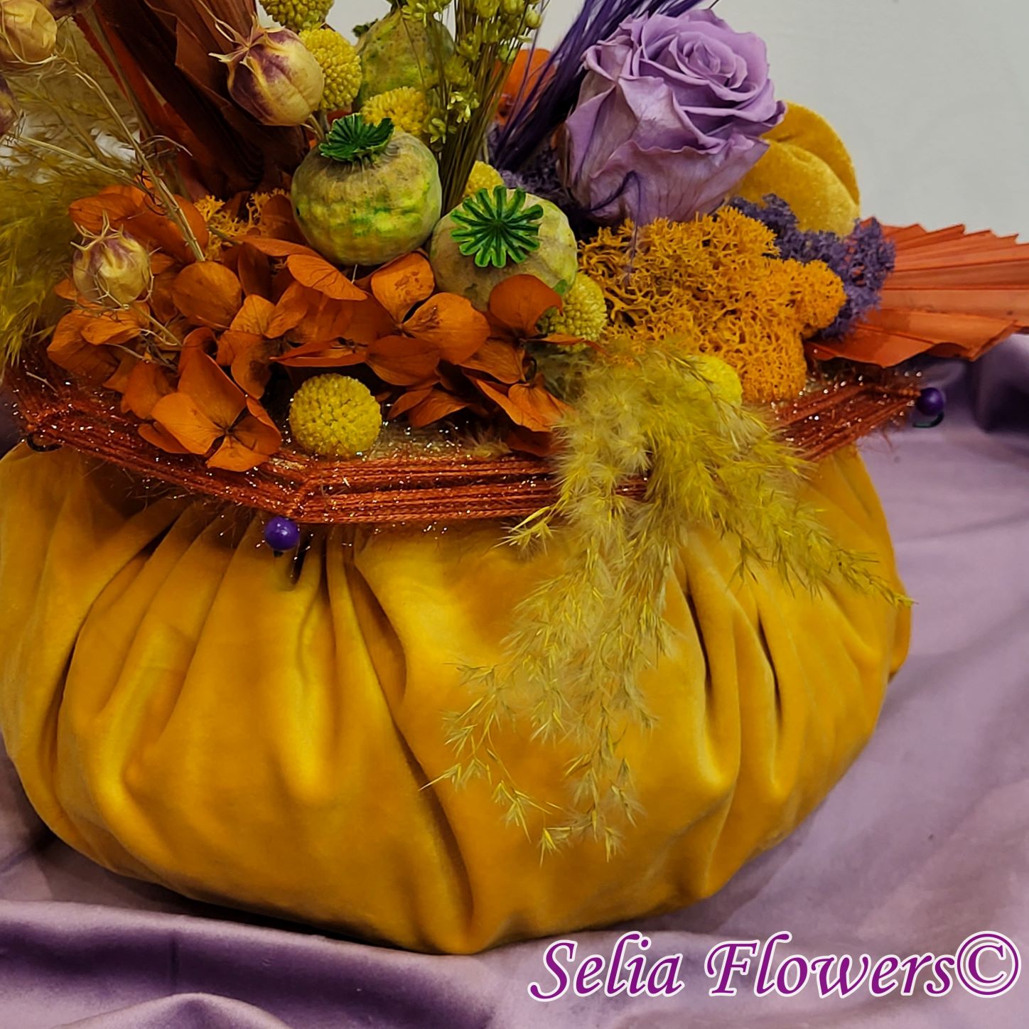 Un dovleac handmade, realizat în cromatica toamnei. Are o structură spiderweb construită și este decorat cu flori naturale permanente: hortensie și trandafir criogenate, craspedia, stipa, nigella, capsule de mac și iarbă de pampas. Este accesorizat cu licheni naturali stabilizati, minidovleci din material textil și frunze de palmier.